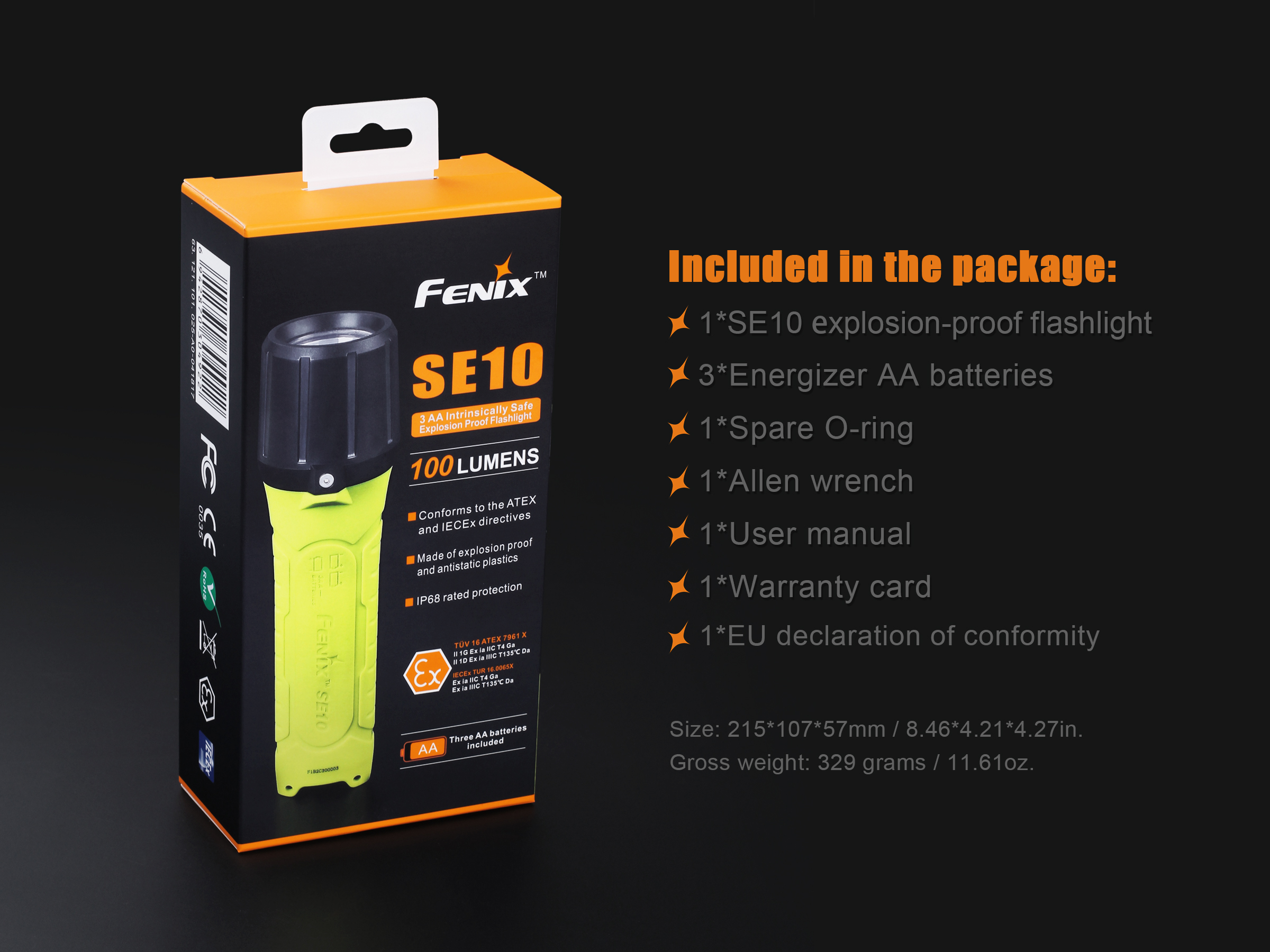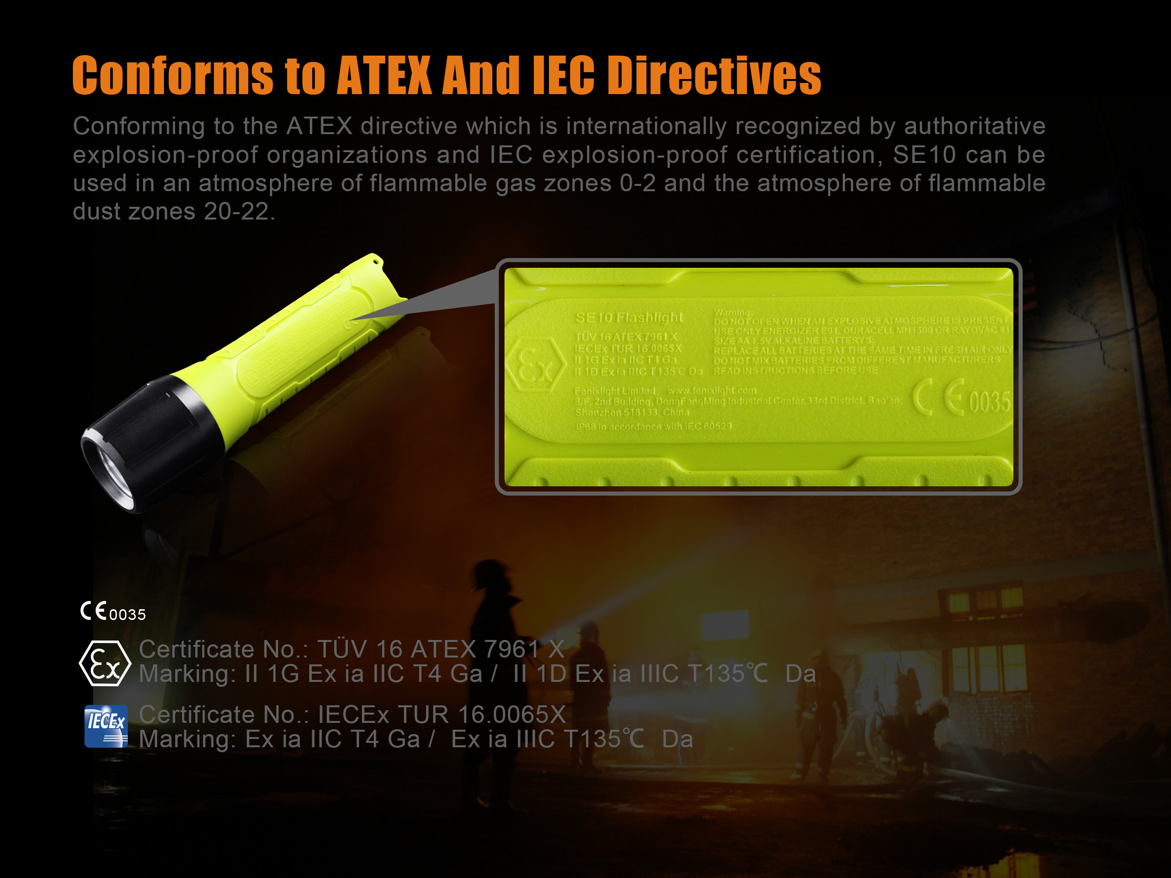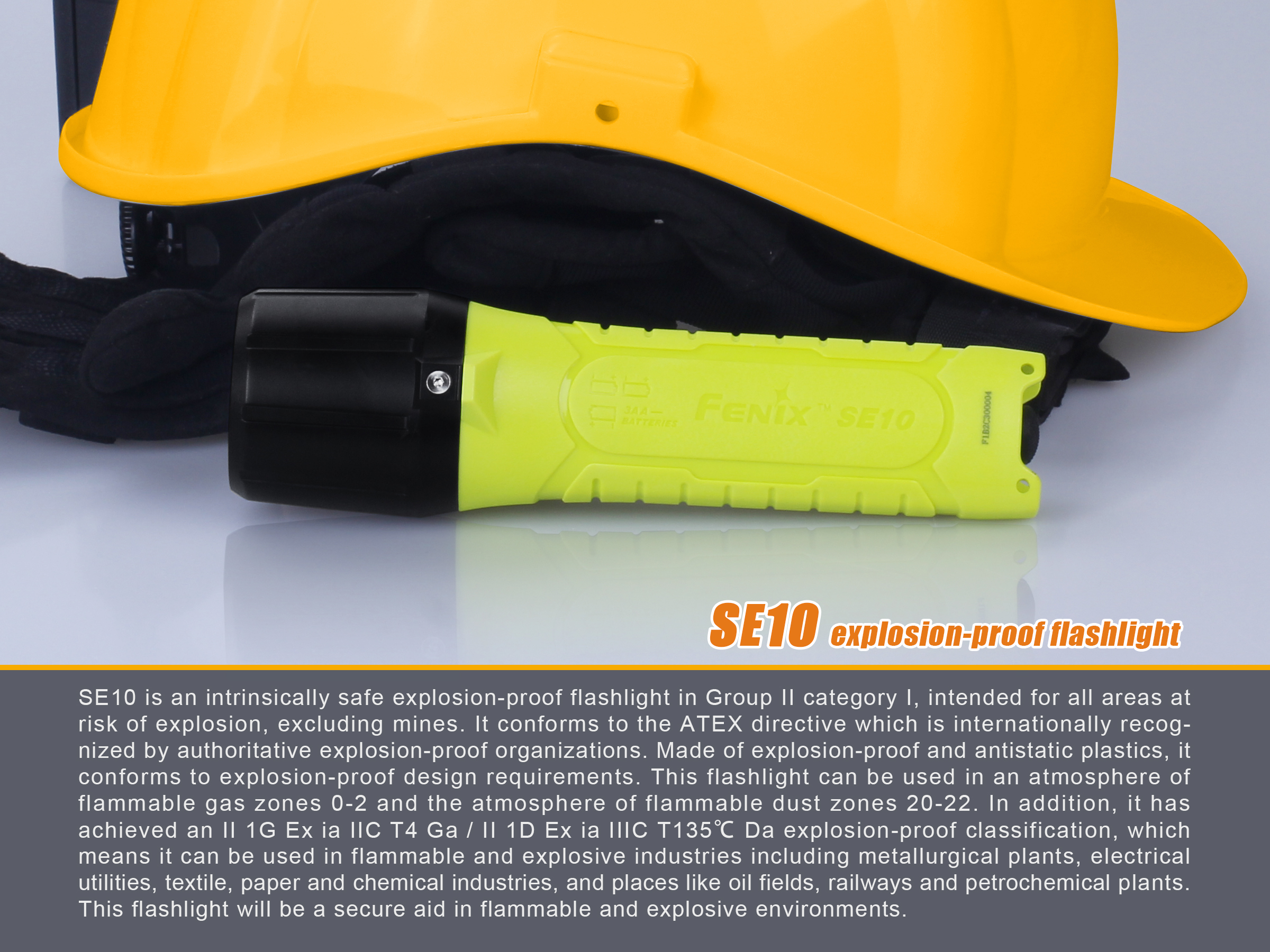 Profesionálne svietidlo Fenix SE10 s certifikáciou ATEX/IEC na použitie vo výbušnom prostredí. Svietidlo je napájané tromi tužkovými (AA) batériami a poskytuje svetelný tok až 100 lúmenov. Telo svietidla je vyrobené z antistatického plastu pre vysokú odolnosť a nárazuvzdornosť. Svietidlo je určené najmä pre hasičov, záchranárov, použitie v chemických prevádzkach a ďalších oblastiach, kde nemožno použiť bežné svetlá. Svietidlo nie je určená pre použitie v baniach.
