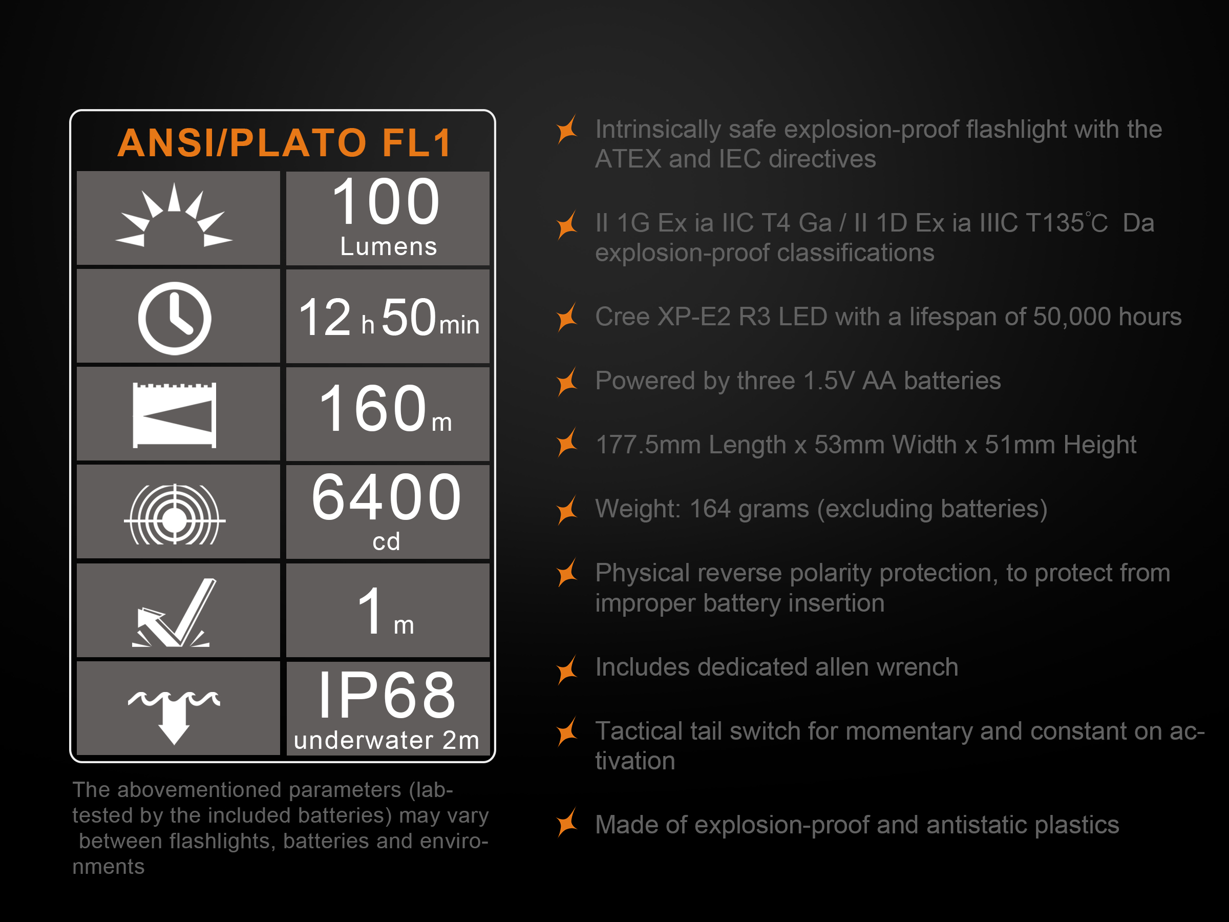 Všetky parametre svietidla (svetelný tok, doba svietenia na batérie, vodotesnosť, dosvit a nárazuvzdornosť) sú merané v súlade s normou ANSI/NEMA FL 1-2009 Flashlight Basic Performance Standard.