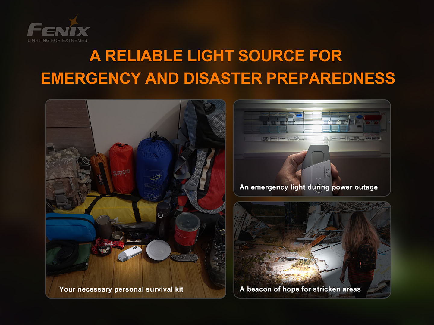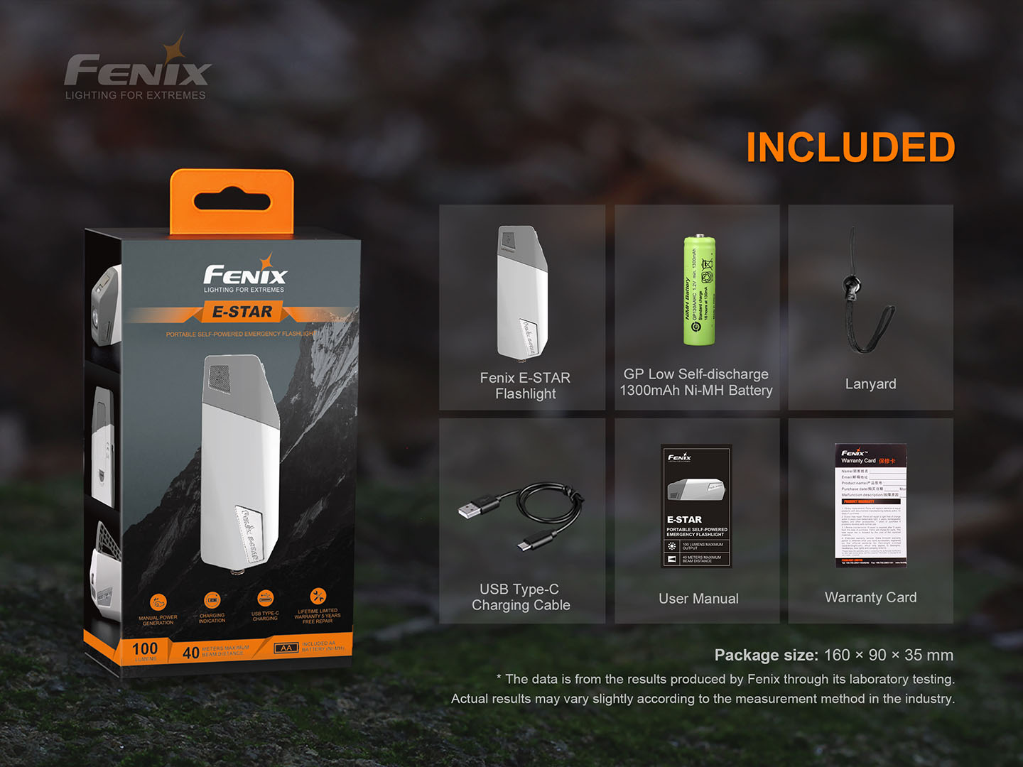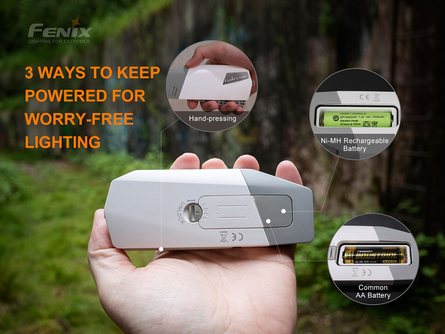 Záložné svietidlo Fenix E-STAR v sebe kombinuje napájanie NiMH akumulátorom a ručným dynamom. Ceruzkový NiMH akumulátor s nízkym samovybíjaním a kapacitou 1300 mAh sa nabíja vo vnútri svietidla pomocou USB-C konektora. Vďaka nemu dokáže svietidlo krátkodobo vyvinúť výkon až 100 lúmenov. V núdzovej situácii je možné ako zdroj energie využiť zabudované dynamo poháňané pákou, ktorá sa jednoducho stláča prstami. Dynamo nabíja čiastočne NiMH akumulátor, ale hlavne vstavaný superkondenzátor, ktorý dokáže na jedno nabitie (cca 15-20 sekúnd stláčania dynama) dodať energiu až na dve minúty svietenia. Pri napájaní dynamom je tak potom výdrž svietidla teoreticky nekonečná a závisí len od výdrže vašej ruky. Svietidlo môže fungovať aj bez vloženého akumulátora, ten je možné v prípade núdze nahradiť aj bežnou tužkovou AA batériou. Fenix E-STAR je výborné záložné svietidlo do podmienok, kedy nebudete mať dlhodobo prístup k elektrickej sieti ani náhradným batériám.
