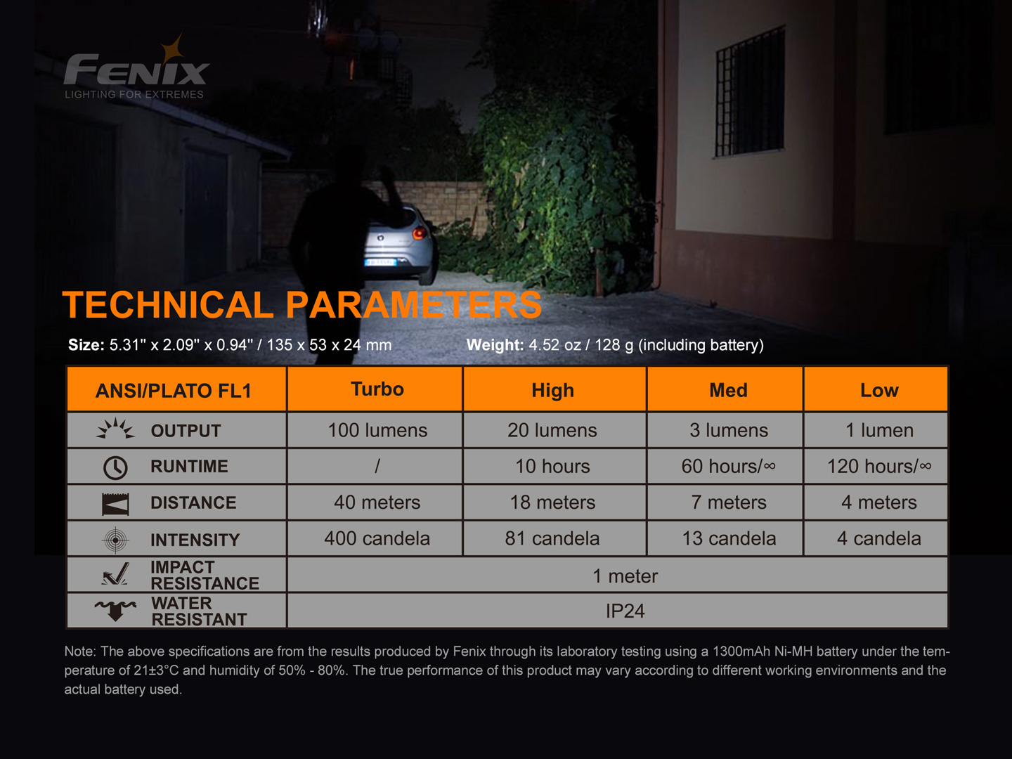 Všetky parametre svietidla (svetelný tok, doba prevádzky na batérie, vodotesnosť, dosvit a nárazuvzdornosť) sú zmerané v súlade s normou ANSI/NEMA FL 1-2009.