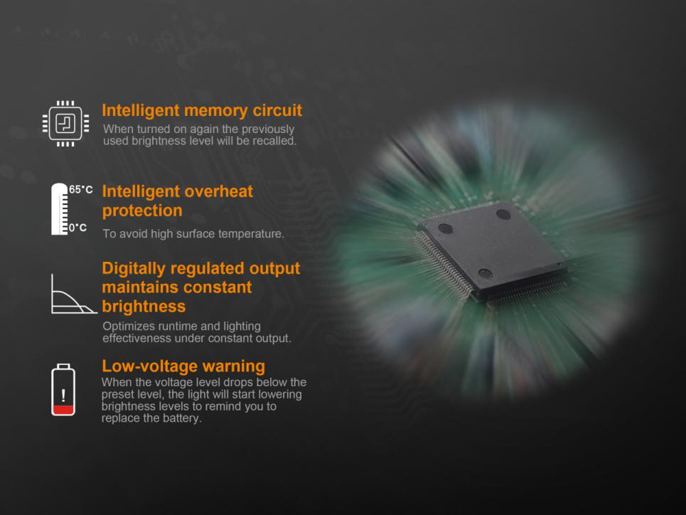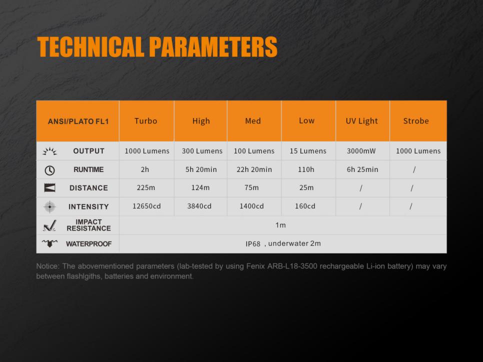 Všetky parametre baterky (svetelný tok, doba svietenia na batérie, vodotesnosť, dosvit a nárazuvzdornosť) sú merané v súlade s normou ANSI/NEMA FL 1-2009 Flashlight Basic Performance Standard.