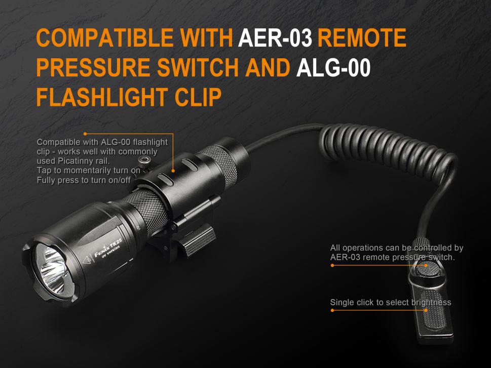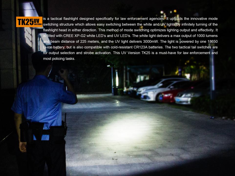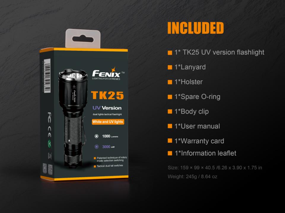 Výkonné taktické svietidlo Fenix TK25 UV ponúka špičkový svetelný tok až 1000 ANSI lúmenov bieleho svetla a navyše dve UV LED s výkonom až 3000 mW a vlnovou dĺžkou 365 nm. Ultrafialové svetlo umožní napríklad rýchlu kontrolu pravosti dokladov, bankoviek a platobných kariet. Ďalej slúži aj na kontrolu čistoty alebo kvality materiálu, vytvrdzovania UV lepidiel či k forenznej analýze. Veľmi solídne a vodeodolné prevedenie a dvojvrstvová konštrukcia tela predurčuje toto taktické svetlo do náročných pracovných podmienok. Svietidlo Fenix TK25 UV používa duálny taktický spínač, ktorý umožňuje rýchlejšie a spoľahlivejšie ovládanie v krízových situáciách. Možno ho napríklad ľahko zapnúť priamo do stroboskopického režimu. Svietidlo je napájané digitálne regulovaným konštantným prúdom pre zaručenie stáleho svetelného výkonu i pri znižovaní napätia v batériách (pri ich pozvoľnom vybíjaní).