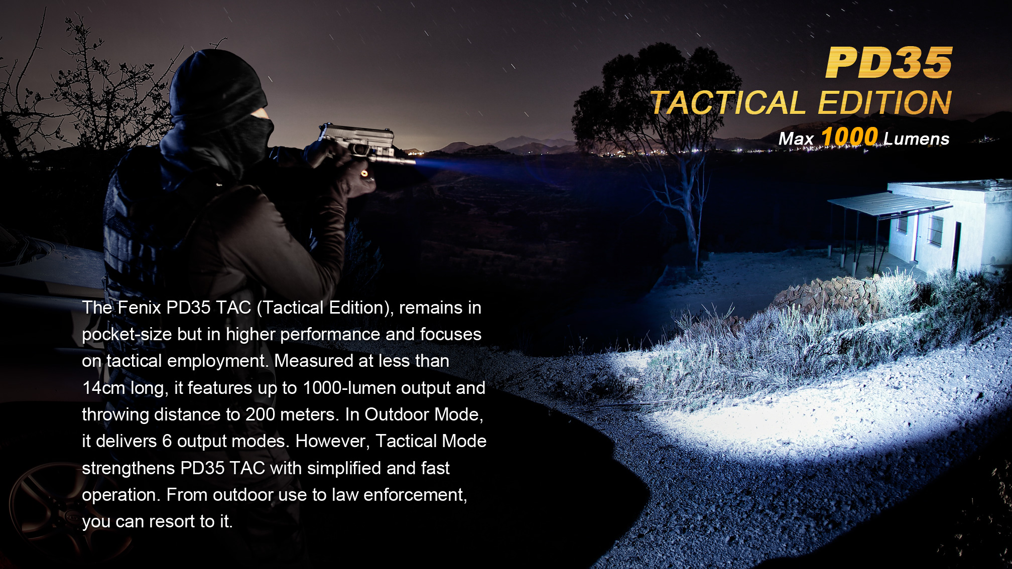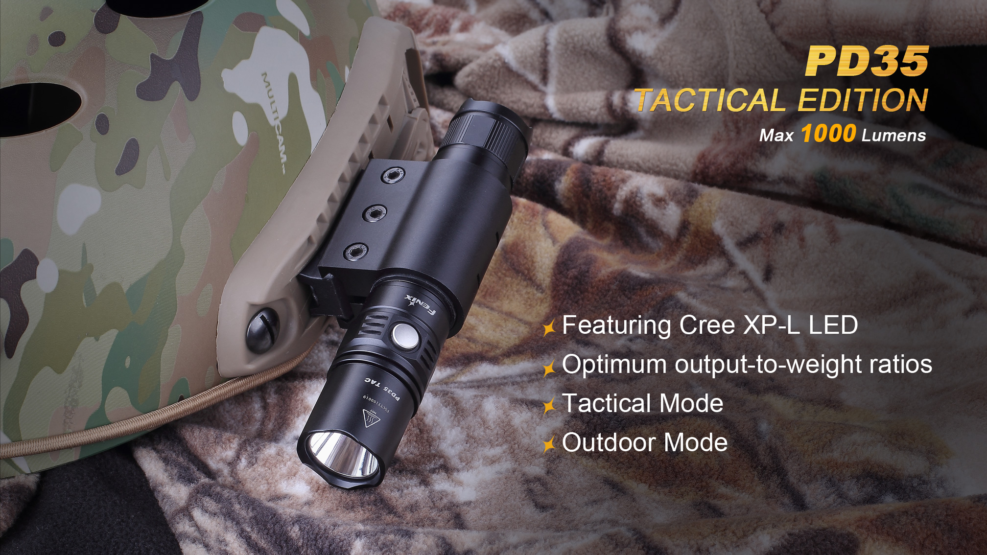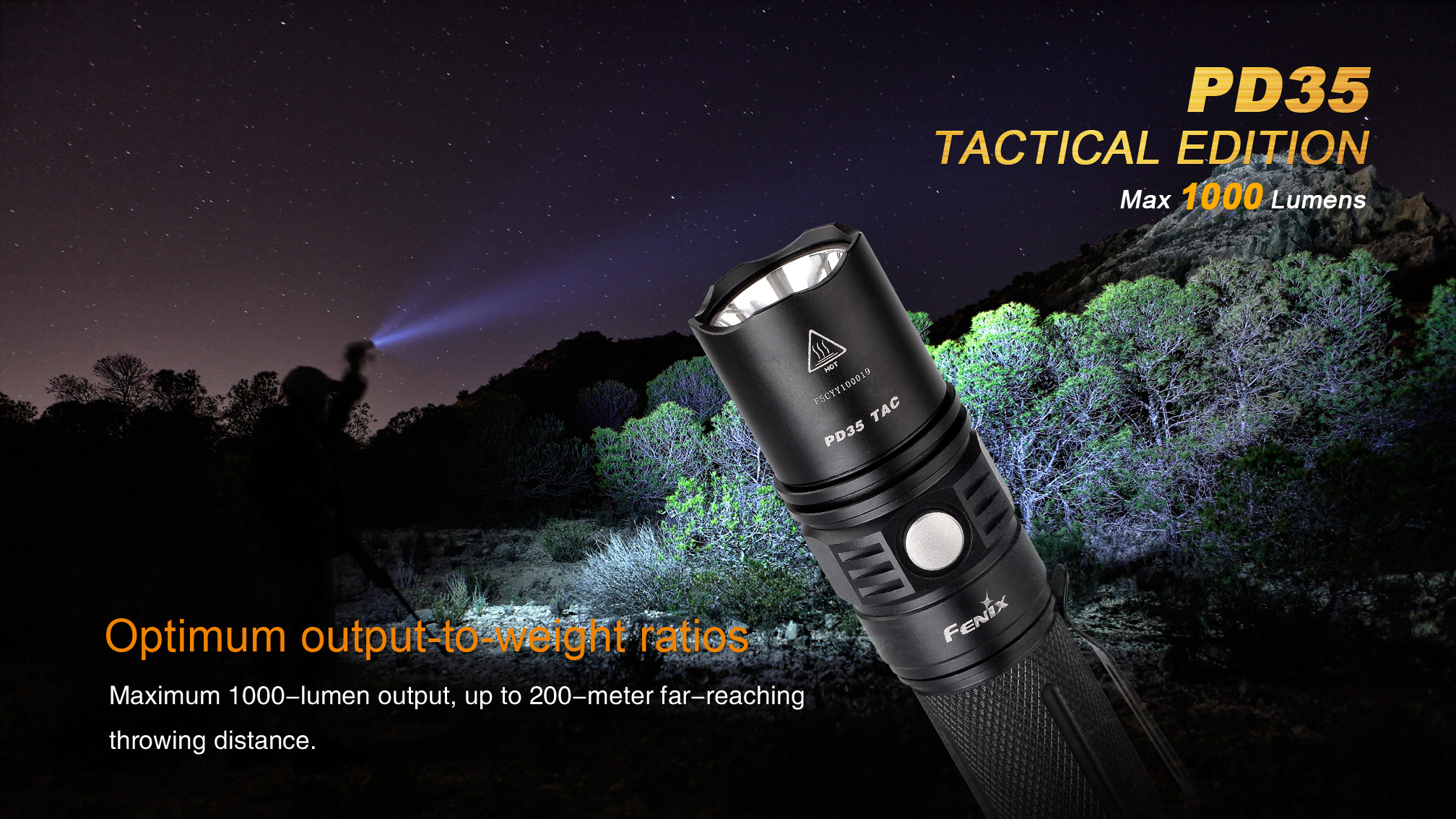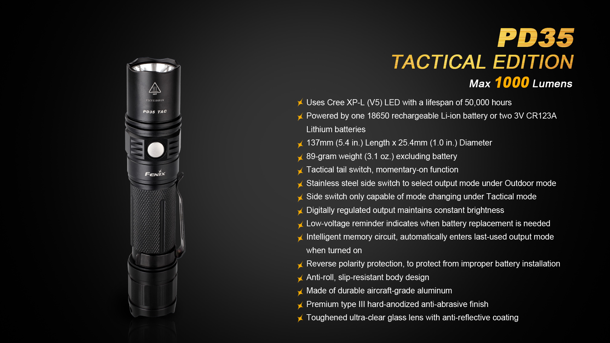 Tretia generácia ultra výkonné vreckové baterky Fenix PD35 TAC, prináša svetelný tok až 1000 lúmenov a možnosť voľby medzi outdoorovým a taktickým ovládaním. Baterku je možné napájať dvomi CR123A batériami, alebo jedným vysokokapacitným li-ion 18650 akumulátorom. PD35 zaujme nie len malou veľkosťou a obrovským výkonom, ale aj množstvom príslušenstva. Môžeme ju odporučiť ako na použitie v bezpečnostných zložkách, tak aj na bežné outdoorové a lovecké použitie.