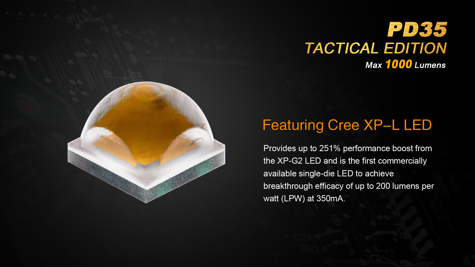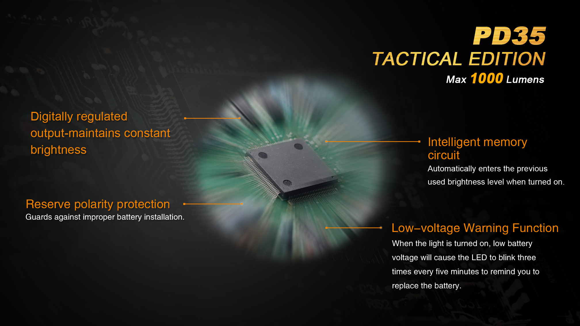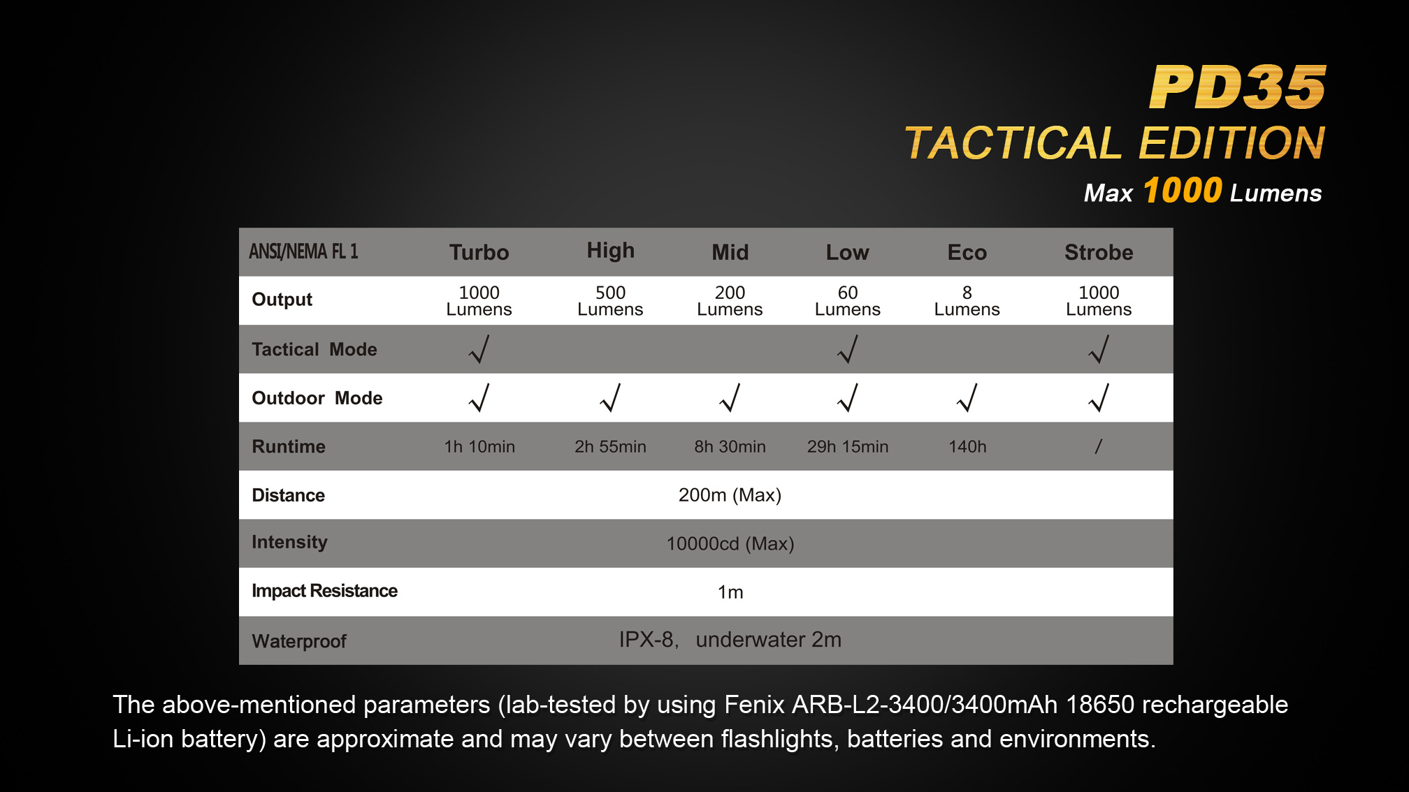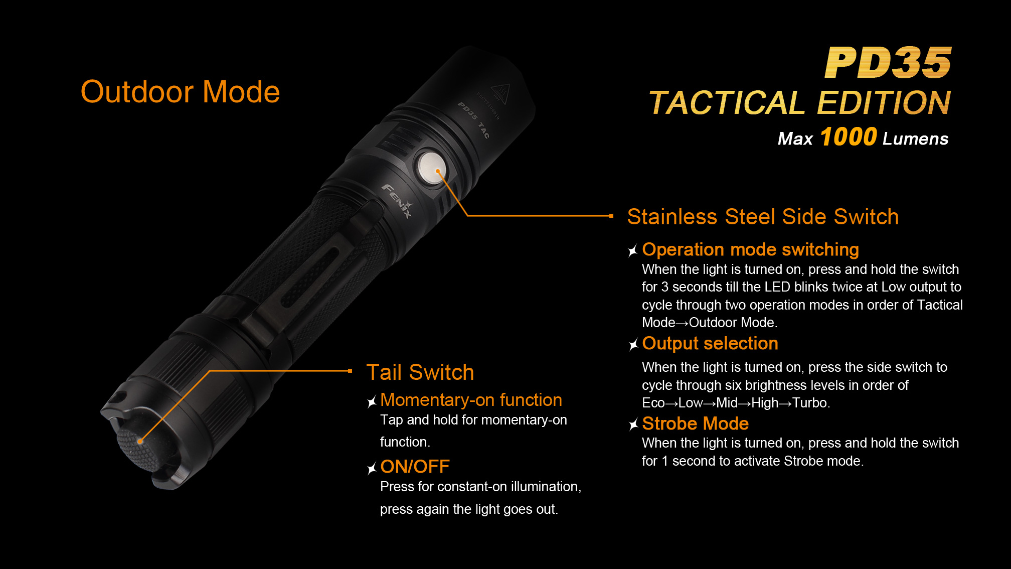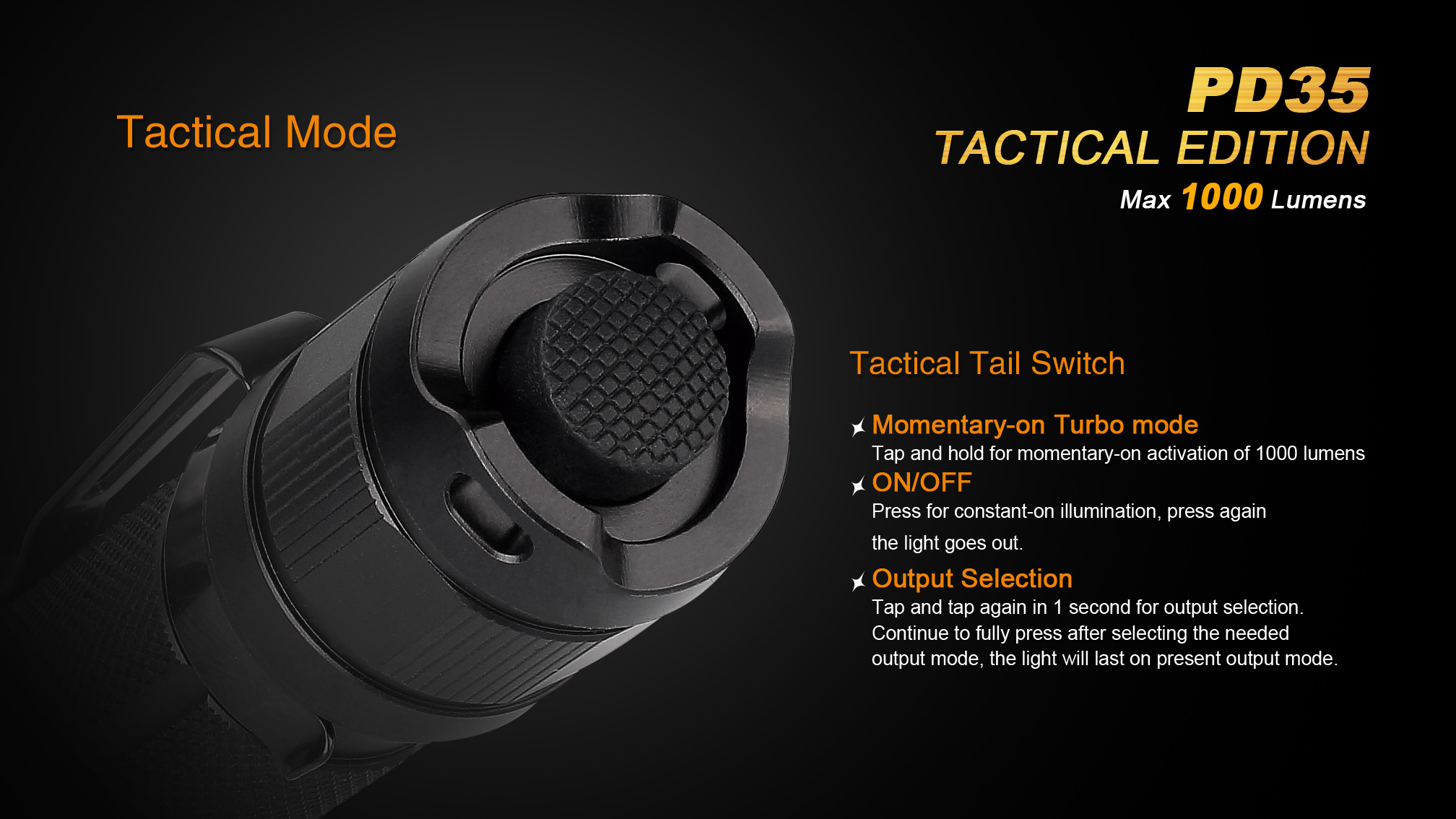Tretia generácia ultra výkonné vreckové baterky Fenix PD35 TAC, prináša svetelný tok až 1000 lúmenov a možnosť voľby medzi outdoorovým a taktickým ovládaním. Baterku je možné napájať dvomi CR123A batériami, alebo jedným vysokokapacitným li-ion 18650 akumulátorom. PD35 zaujme nie len malou veľkosťou a obrovským výkonom, ale aj množstvom príslušenstva. Môžeme ju odporučiť ako na použitie v bezpečnostných zložkách, tak aj na bežné outdoorové a lovecké použitie.