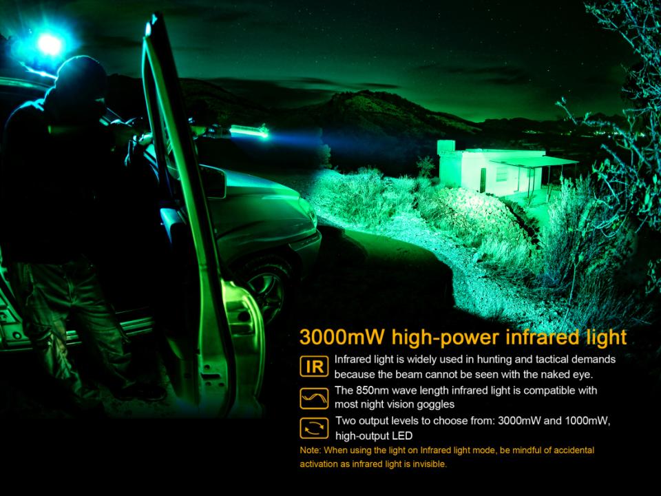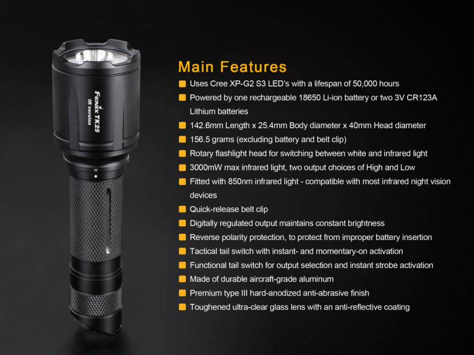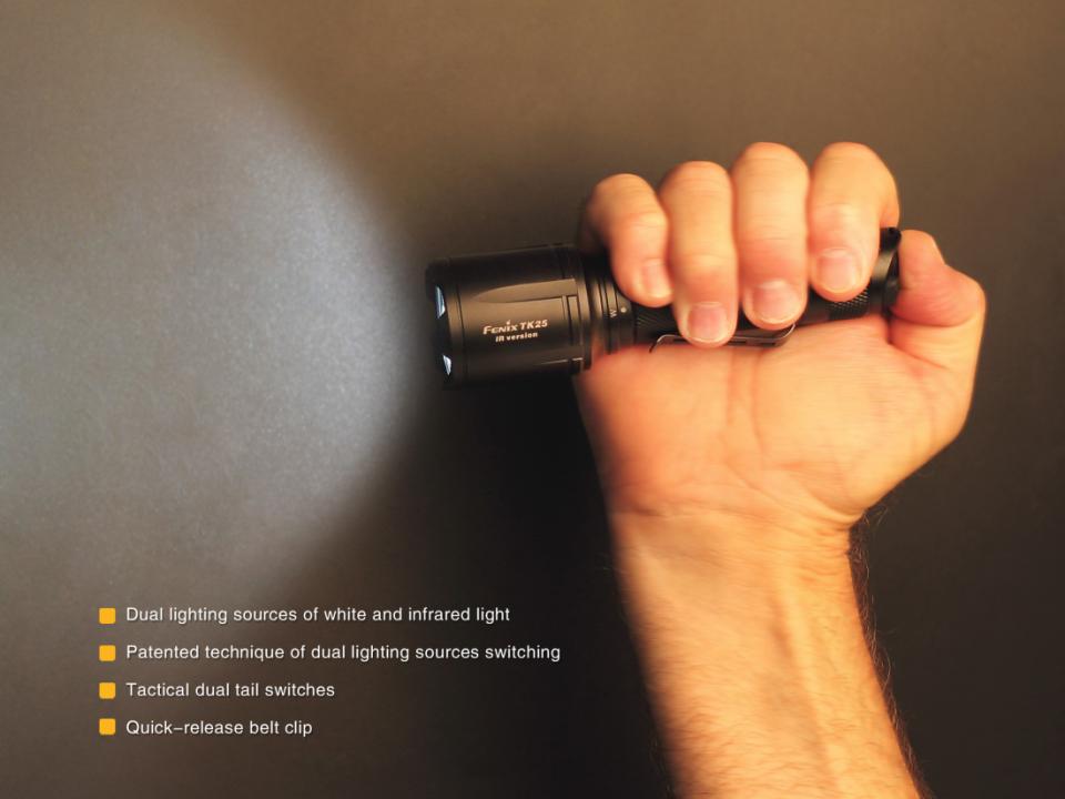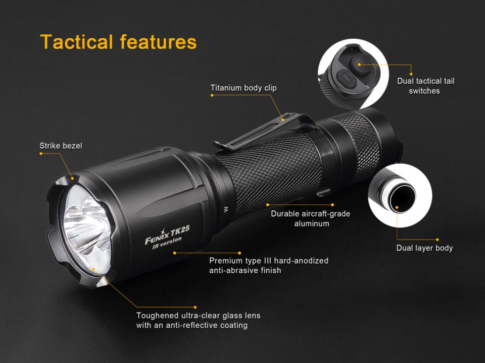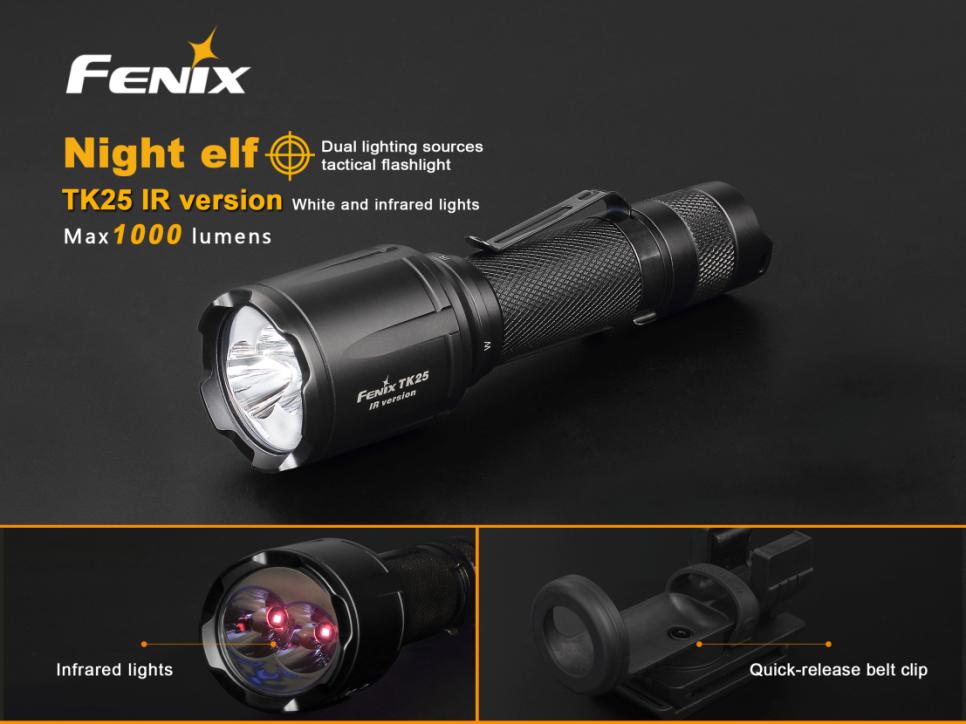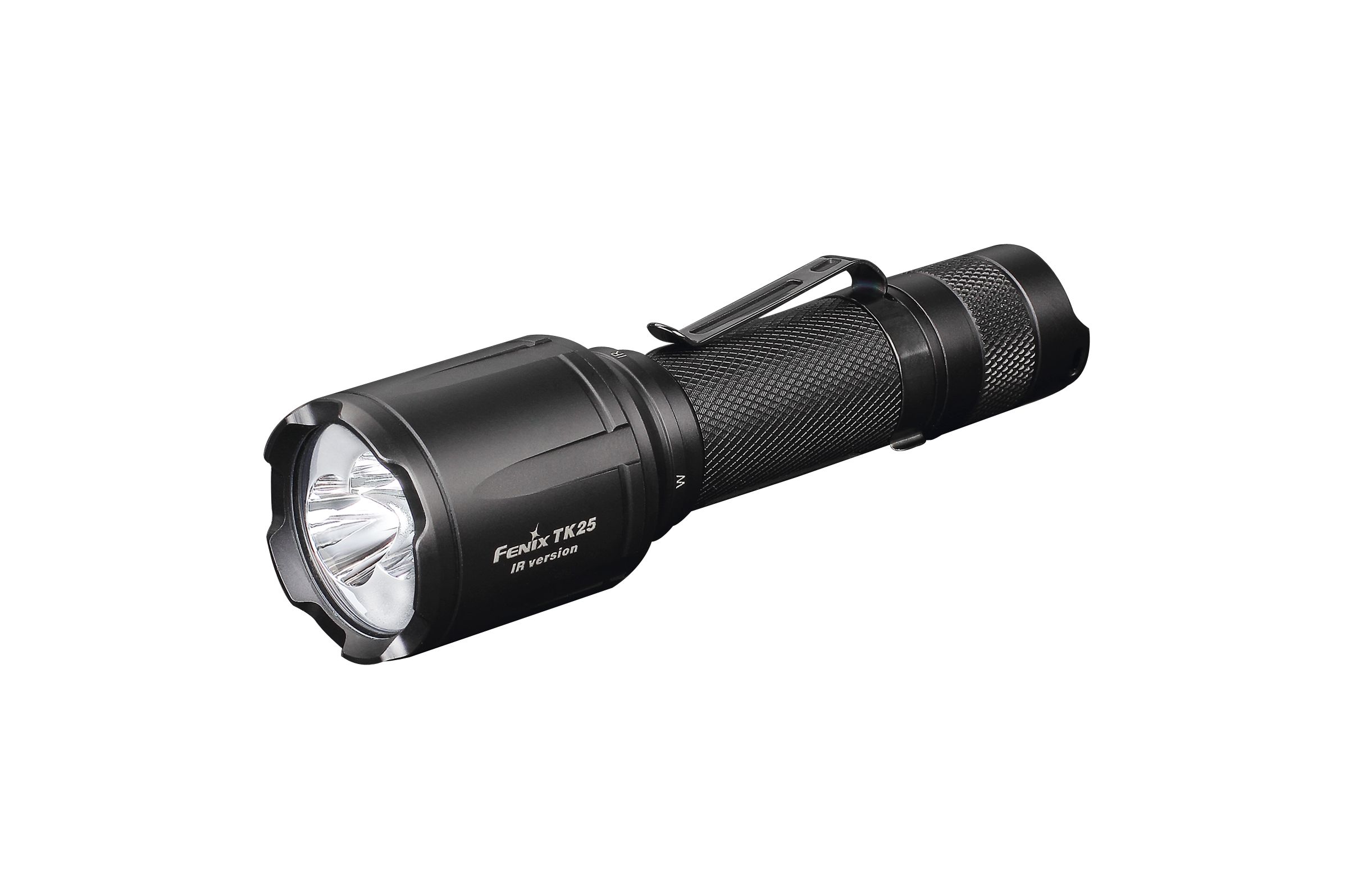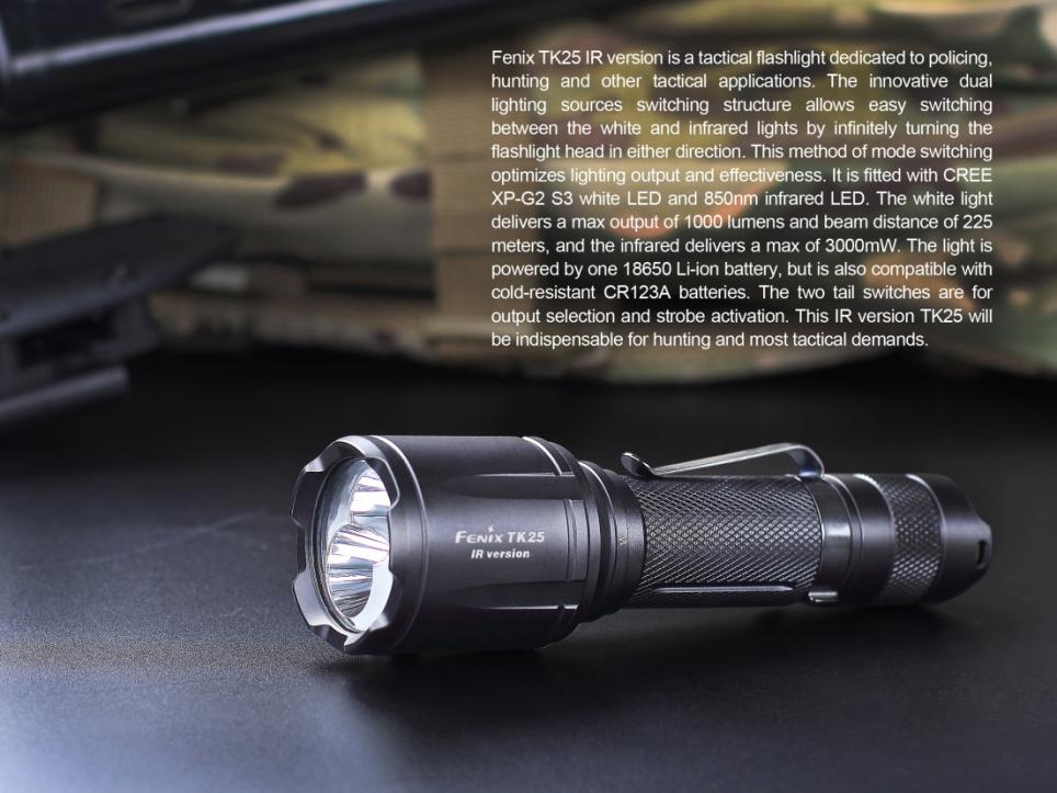 Výkonné taktické svietidlo Fenix ​​TK25 IR ponúka špičkový svetelný tok bieleho svetla a navyše dve infračervené LED s vlnovou dĺžkou 850 nm a maximálnym výkonom 3000 mW. Táto vlnová dĺžka je kompatibilná s väčšinou systémov pre nočné videnie. Prepnutie medzi módom bieleho a infračerveného svetla je veľmi jednoduché, stačí iba pootočiť hlavu svietidla o 90°. Veľmi solídne a vodeodolné prevedenie a dvojvrstvová konštrukcia tela predurčuje toto taktické svetlo pre drsné vonkajšie podmienky, pre profesionálov, ozbrojené zložky aj poľovníctvo. Svietidlo Fenix ​​TK25 IR používa duálny taktický spínač, ktorý umožňuje rýchlejšie a spoľahlivejšie ovládanie v krízových situáciách. Možno ju napríklad ľahko zapnúť priamo do stroboskopického režimu. Svietidlo je napájané digitálne kontrolovaným konštantným prúdom pre zaručenie stáleho svetelného výkonu i pri znižovaní napätia v batériách (pri ich pozvoľnom vybíjaní).