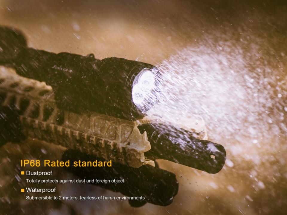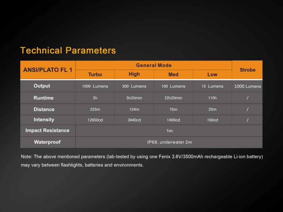 Všetky parametre svietidla (svetelný tok, doba svietenia na batérie, vodotesnosť, dosvit a nárazuvzdornosť) sú merané v súlade s normou ANSI/NEMA FL 1-2009 Flashlight Basic Performance Standard.