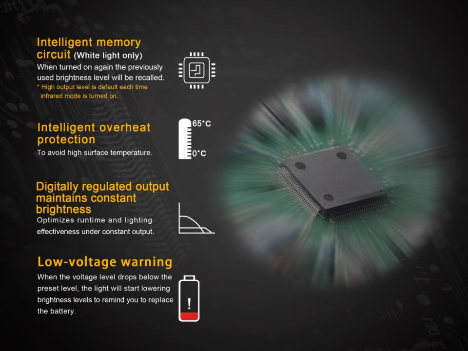 • Sú použité dve biele výkonné LED Cree XP-G2 S3 so životnosťou 50000 hodín a dve infračervené LED so svetlom s vlnovou dĺžkou 850 nm a maximálnym výkonom 3000 mW.