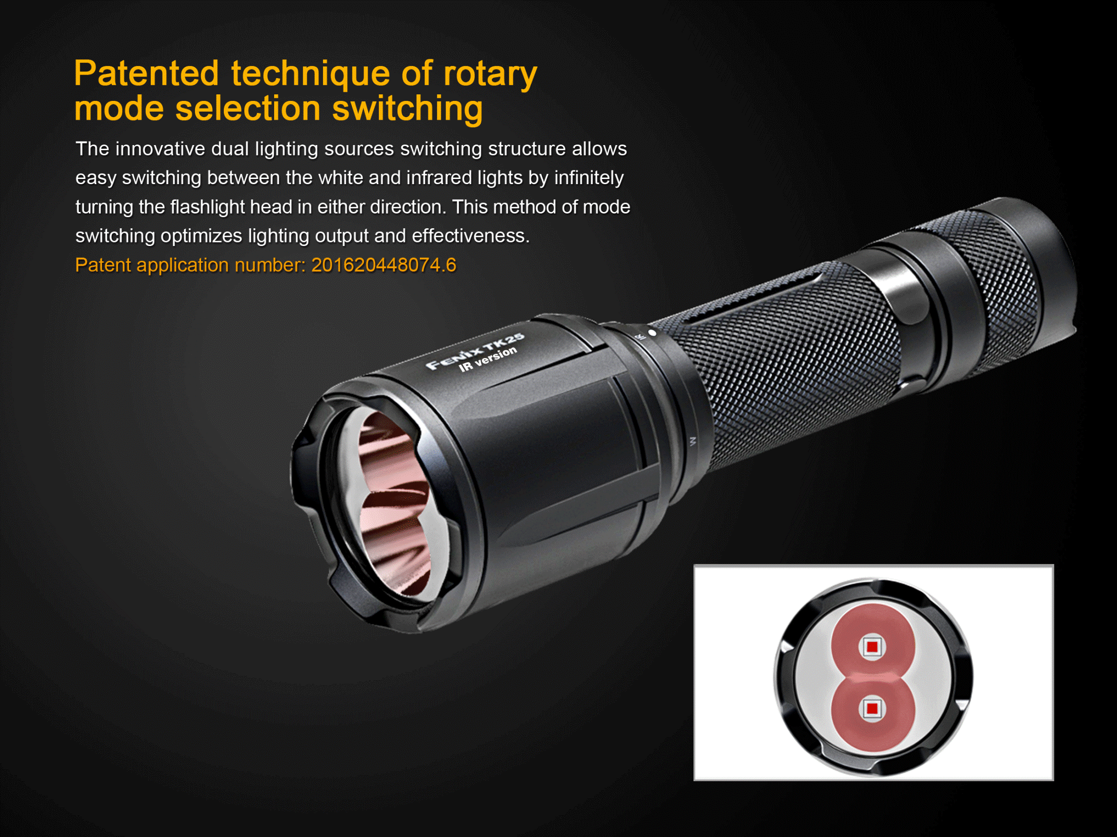 Výkonné taktické svietidlo Fenix TK25 IR ponúka špičkový svetelný tok bieleho svetla a navyše dve infračervené LED s vlnovou dĺžkou 850 nm a maximálnym výkonom 3000 mW. Táto vlnová dĺžka je kompatibilná s väčšinou systémov pre nočné videnie. Prepnutie medzi módom bieleho a infračerveného svetla je veľmi jednoduché, stačí iba pootočiť hlavu svietidla o 90°. Veľmi solídne a vodeodolné prevedenie a dvojvrstvová konštrukcia tela predurčuje toto taktické svetlo pre drsné vonkajšie podmienky, pre profesionálov, ozbrojené zložky aj poľovníctvo. Svietidlo Fenix TK25 IR používa duálny taktický spínač, ktorý umožňuje rýchlejšie a spoľahlivejšie ovládanie v krízových situáciách. Možno ju napríklad ľahko zapnúť priamo do stroboskopického režimu. Svietidlo je napájané digitálne kontrolovaným konštantným prúdom pre zaručenie stáleho svetelného výkonu i pri znižovaní napätia v batériách (pri ich pozvoľnom vybíjaní).