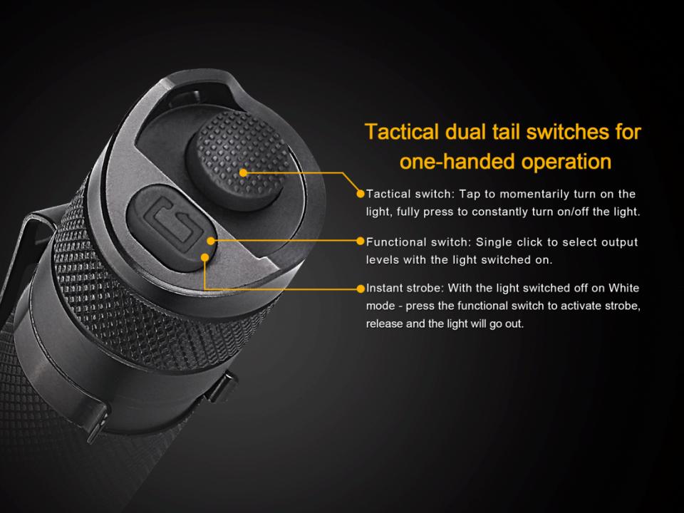 • Duálny taktický vypínač na konci svietidla (funkcia okamžitého zapnutia/vypnutia – momentary on/off).