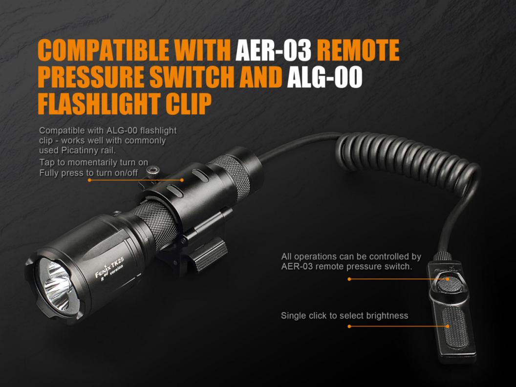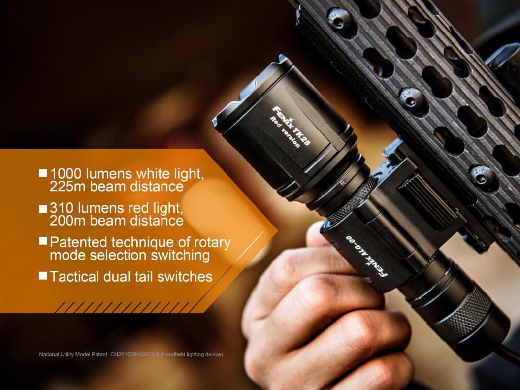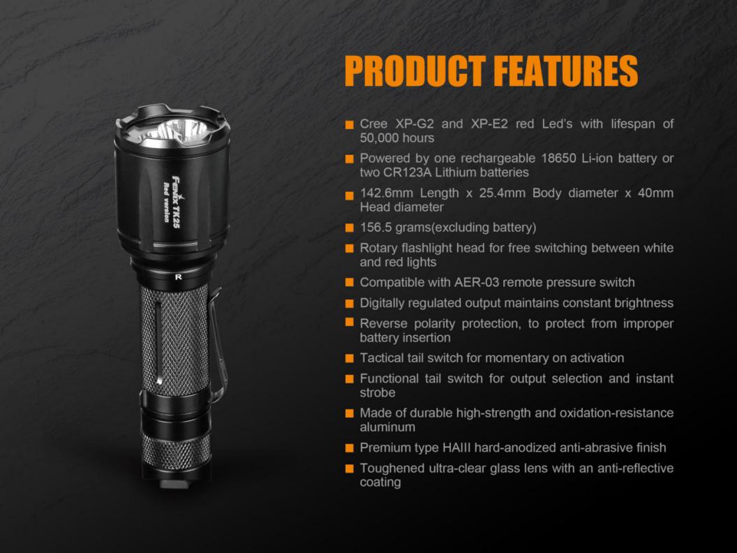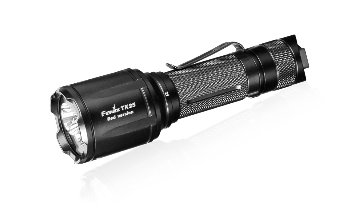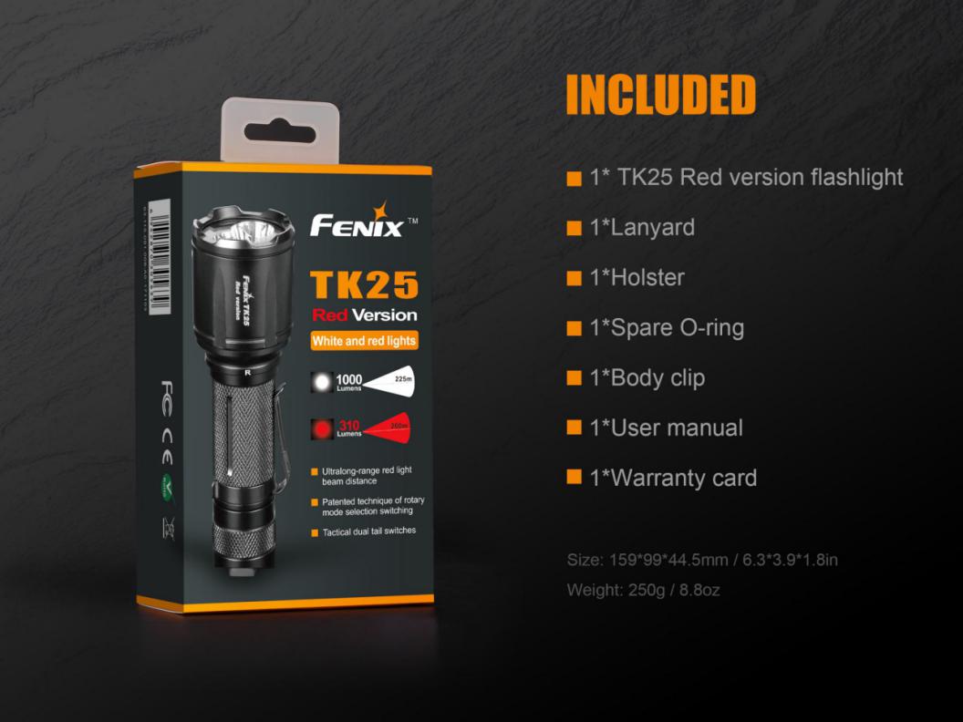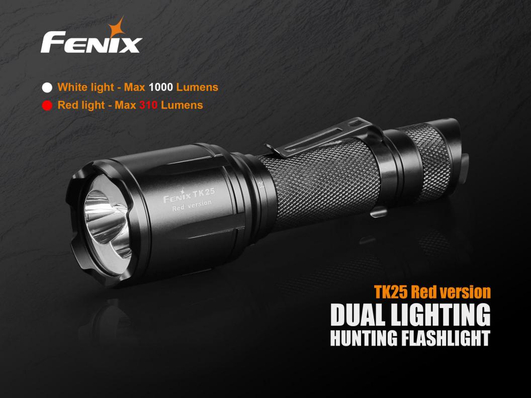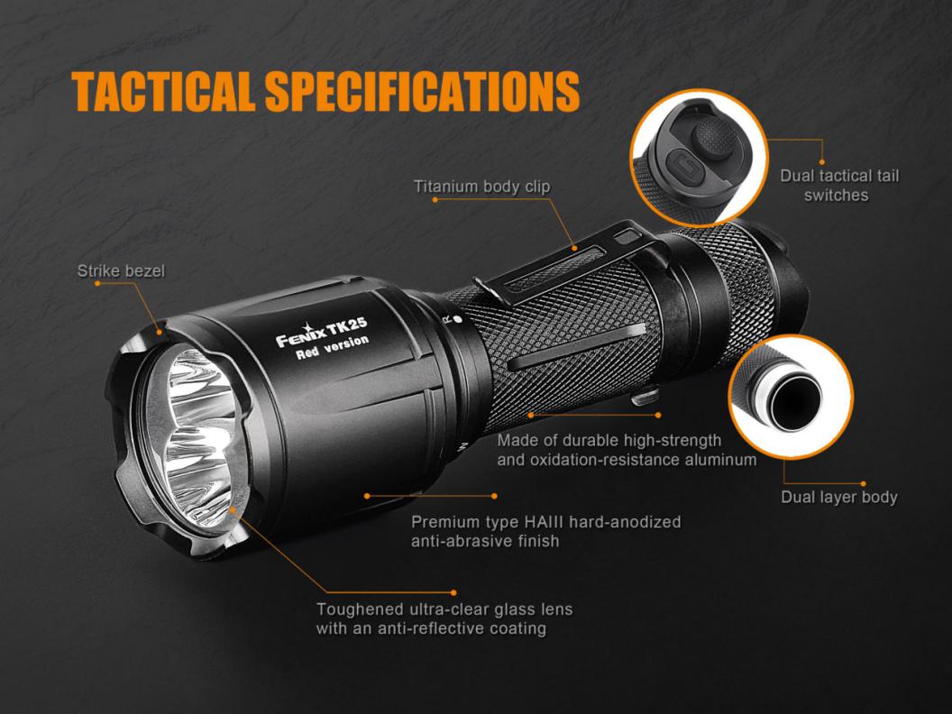 Výkonné taktické svietidlo Fenix TK25 Red ponúka špičkový svetelný tok až 1000 ANSI lúmenov bieleho svetla a navyše dve červené LED s výkonom až 310 lúmenov a dosvitom 200 metrov. Veľmi solídne a vodeodolné prevedenie a dvojvrstvová konštrukcia tela predurčuje túto taktickú baterku pre drsné vonkajšie podmienky, pre profesionálov, ozbrojené zložky a poľovníctvo. Svietidlo Fenix TK25 Red používa duálny taktický spínač, ktorý umožňuje rýchlejšie a spoľahlivejšie ovládanie v krízových situáciach. Možno ju napríklad ľahko zapnúť priamo do stroboskopického režimu. Svietidlo je napájané digitálne regulovaným konštantným prúdom pre zaručenie stáleho svetelného výkonu i pri znižovaní napätia v batériách (pri ich pozvoľnom vybíjaní).