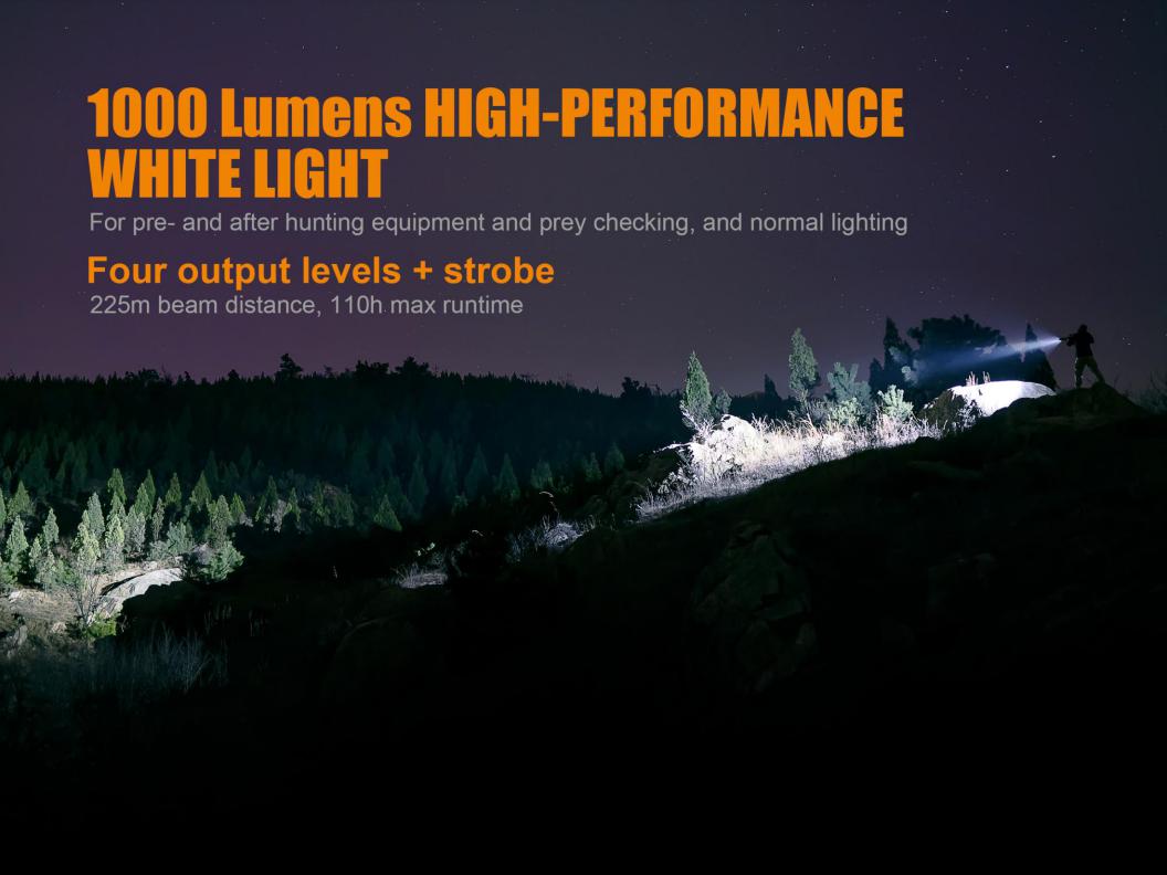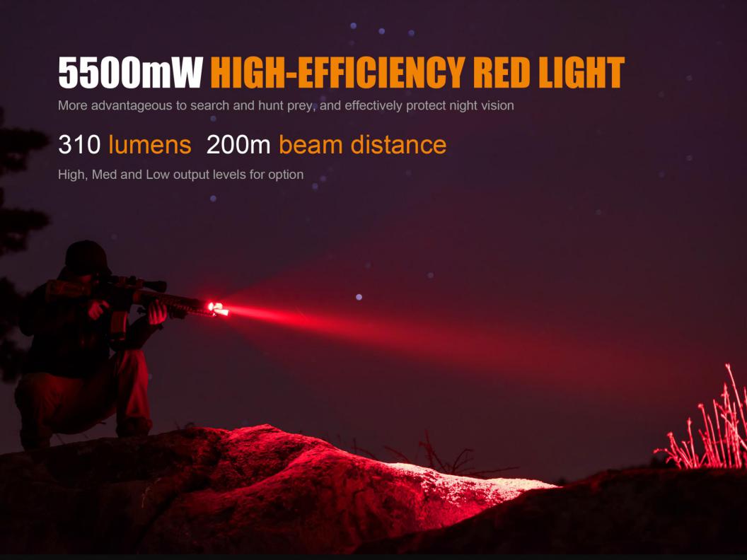 Fenix TK25 Red disponuje celkom piatimi režimami bieleho svetla s výdržou až 110 hodín a tromi režimami červeného svetla.