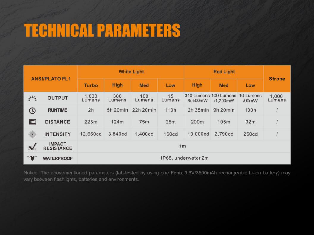 Všetky parametre baterky (svetelný tok, doba svietenia na batérie, vodotesnosť, dosvit a nárazuvzdornosť) sú merané v súlade s normou ANSI/NEMA FL 1-2009 Flashlight Basic Performance Standard.