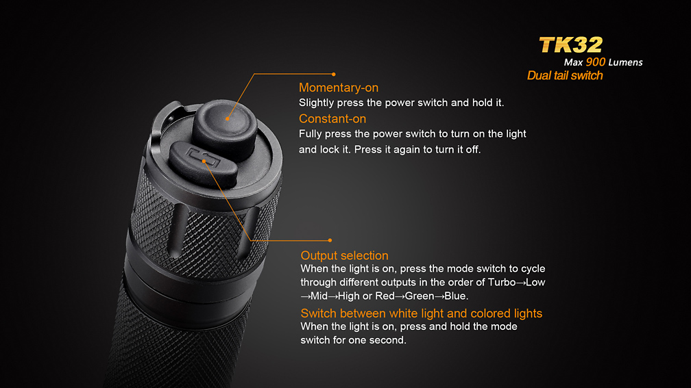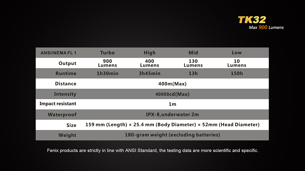 Taktické svetlo Fenix TK32 prináša extrémny svetelný tok až 900 lúmenov, vďaka čomu sa radí k najsilnejším taktickým svetlám v ponuke. K napájaniu je možné využiť dve jednorazové batérie CR123A alebo jeden li-ion akumulátor 18650. Veľký hladký reflektor zaisťuje dosvit až do vzdialenosti 400 metrov. Svetlo ponúka celkovo päť digitálne regulovaných režimov výkonu pre možnosť voľby medzi maximálnym výkonom a výdržou až 150 hodín prevádzky, mimo to taktiež disponuje troma farebnými režimami (červené, zelené a modré svetlo). Svetlo TK32 je špičkovým nástrojom pre poľovníkov, prieskumné a záchranné operácie alebo pre pohyb v ťažkom teréne.