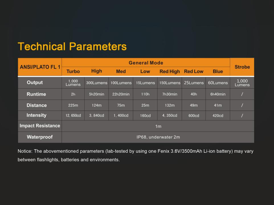 Všetky parametre svietidla (svetelný tok, doba svietenia na batérie, vodotesnosť, dosvit a nárazuvzdornosť) sú merané v súlade s normou ANSI/NEMA FL 1-2009 Flashlight Basic Performance Standard.