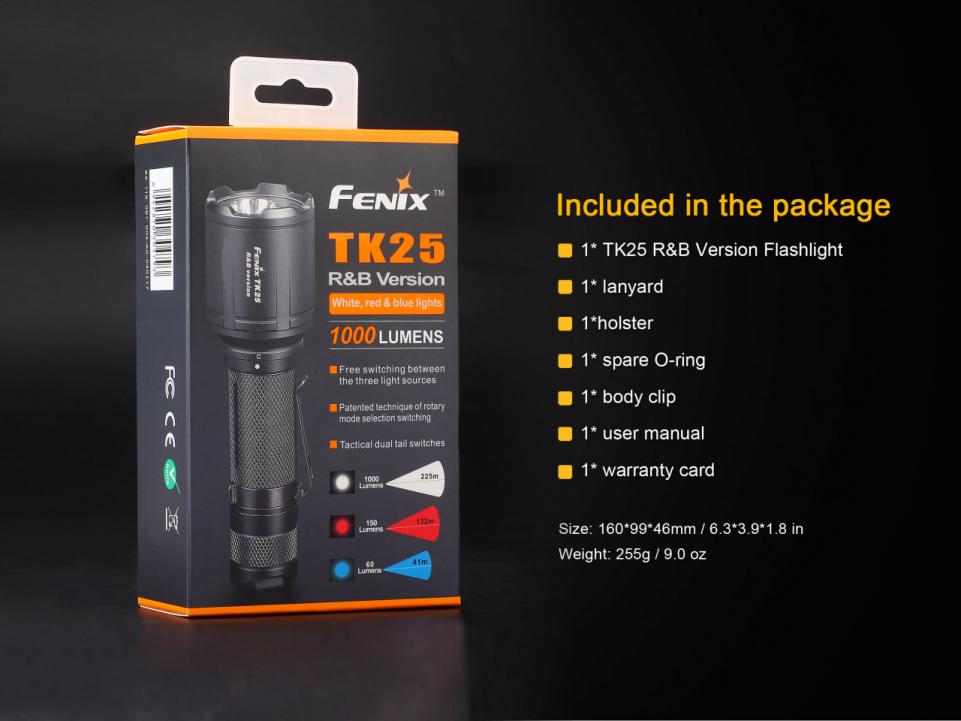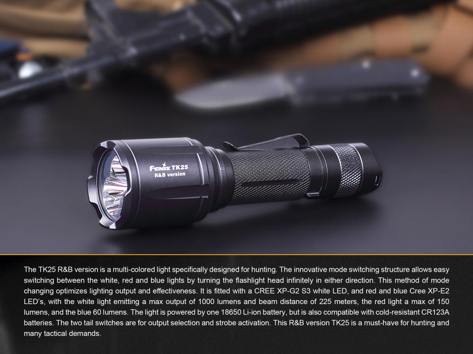 Výkonné taktické svietidlo Fenix TK25 R&B ponúka špičkový svetelný tok a navyše dve farebné LED (červenú a modrú). Prepnutie medzi módom bieleho a farebného svetla je veľmi jednoduché, stačí iba pootočiť hlavu svietidla o 90°. Veľmi solídne a vodeodolné prevedenie a dvojvrstvová konštrukcia tela predurčuje toto taktické svietidlo pre drsné vonkajšie podmienky, pre profesionálov, ozbrojené zložky aj poľovníctvo. Svietidlo Fenix TK25 R&B používa duálny taktický spínač, ktorý umožňuje rýchlejšie a spoľahlivejšie ovládanie v krízových situáciách. Možno ju napríklad ľahko zapnúť priamo do stroboskopického režimu. Svietidlo je napájanáé digitálne regulovaným konštantným prúdom pre zaručenie stáleho svetelného výkonu i pri znižovaní napätia v batériach (pri ich pozvoľnom vybíjaní).