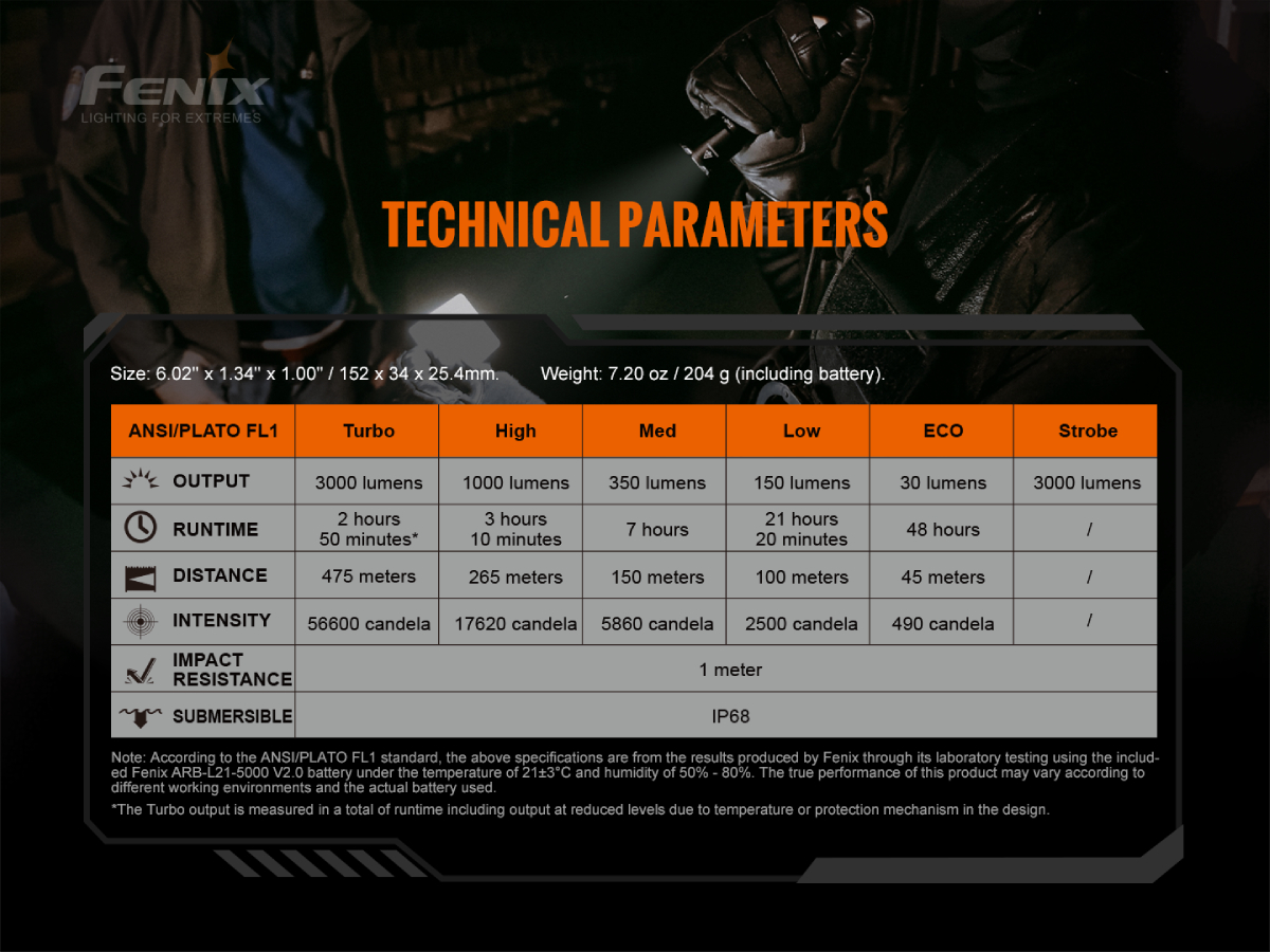 Všetky parametre svietidla (svetelný tok, doba prevádzky na batérie, vodotesnosť, dosvit a nárazuvzdornosť) sú zmerané v súlade s normou ANSI/NEMA FL 1-2009.