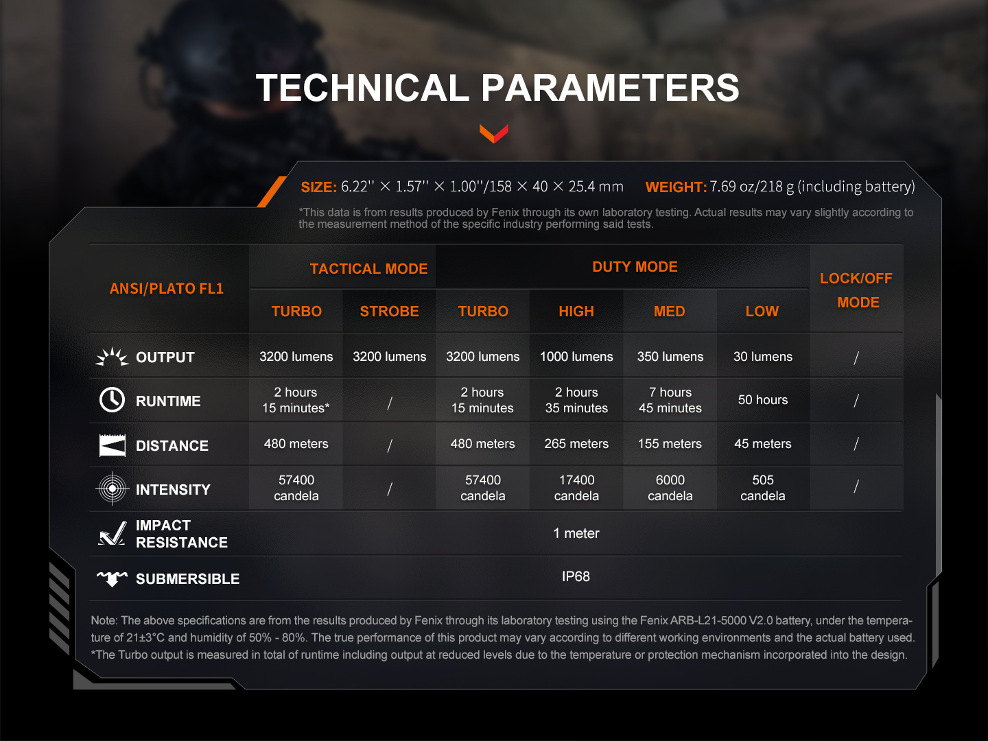 Všetky parametre policajného svietidla (svetelný tok, doba prevádzky na batérie, vodotesnosť, dosvit a nárazuvzdornosť) sú zmerané v súlade s normou ANSI/NEMA FL 1-2009.