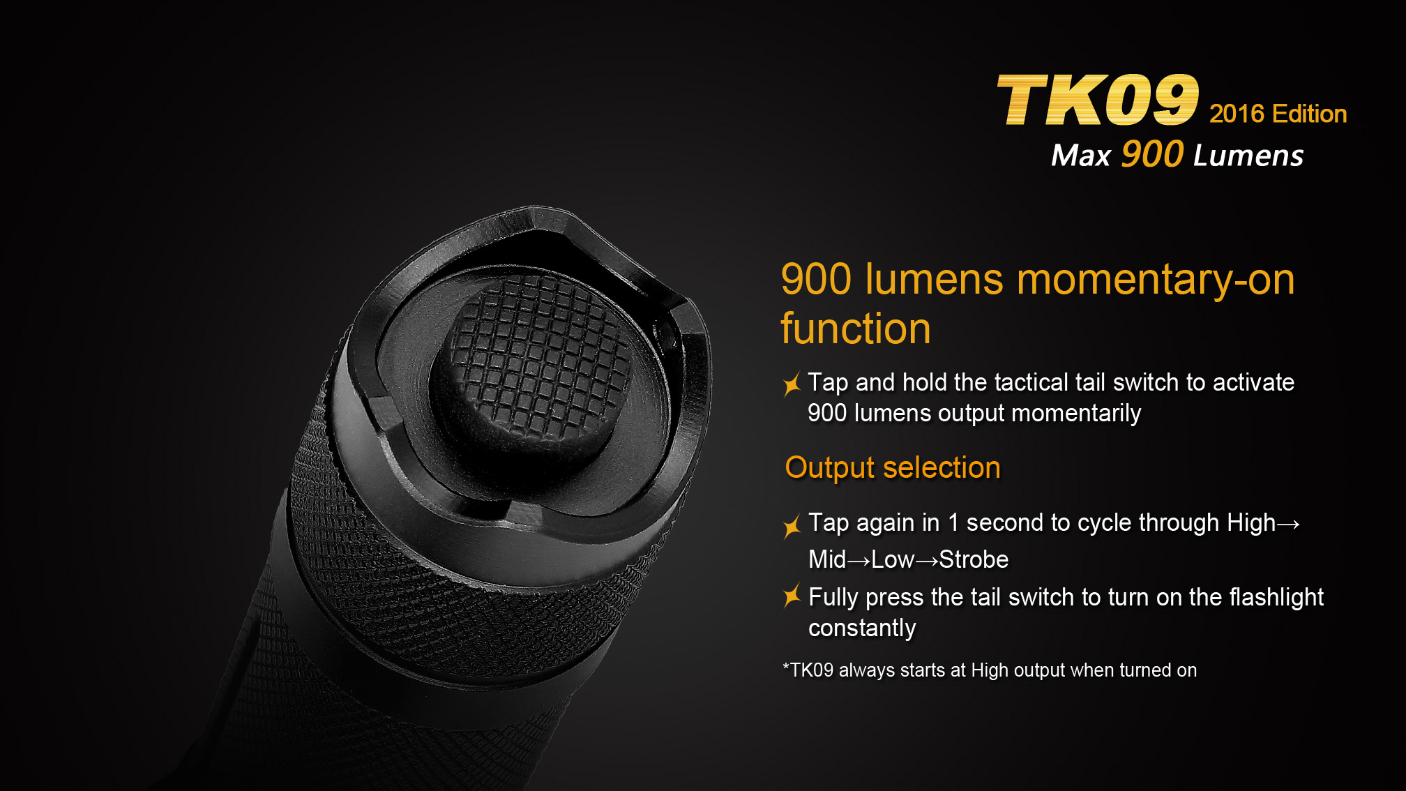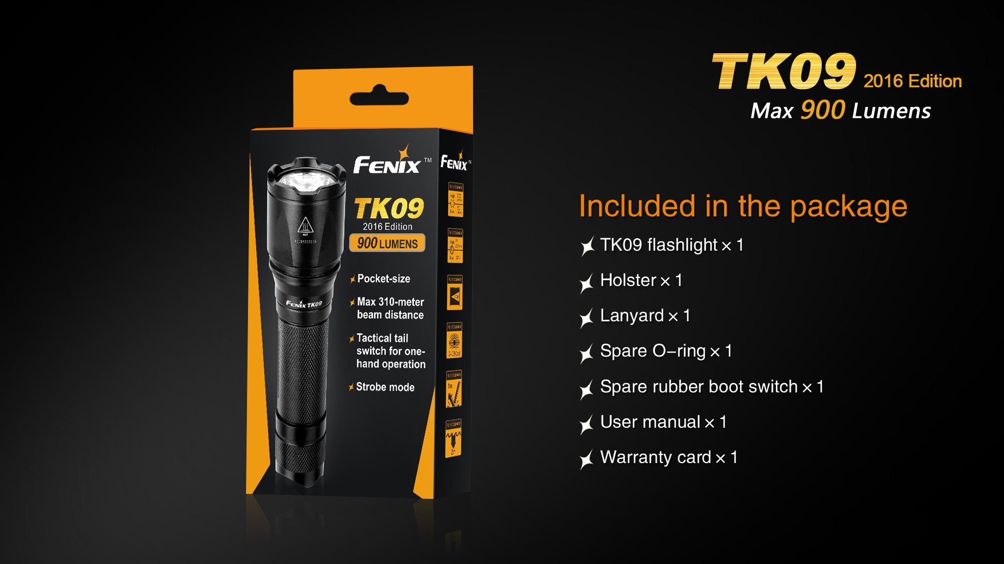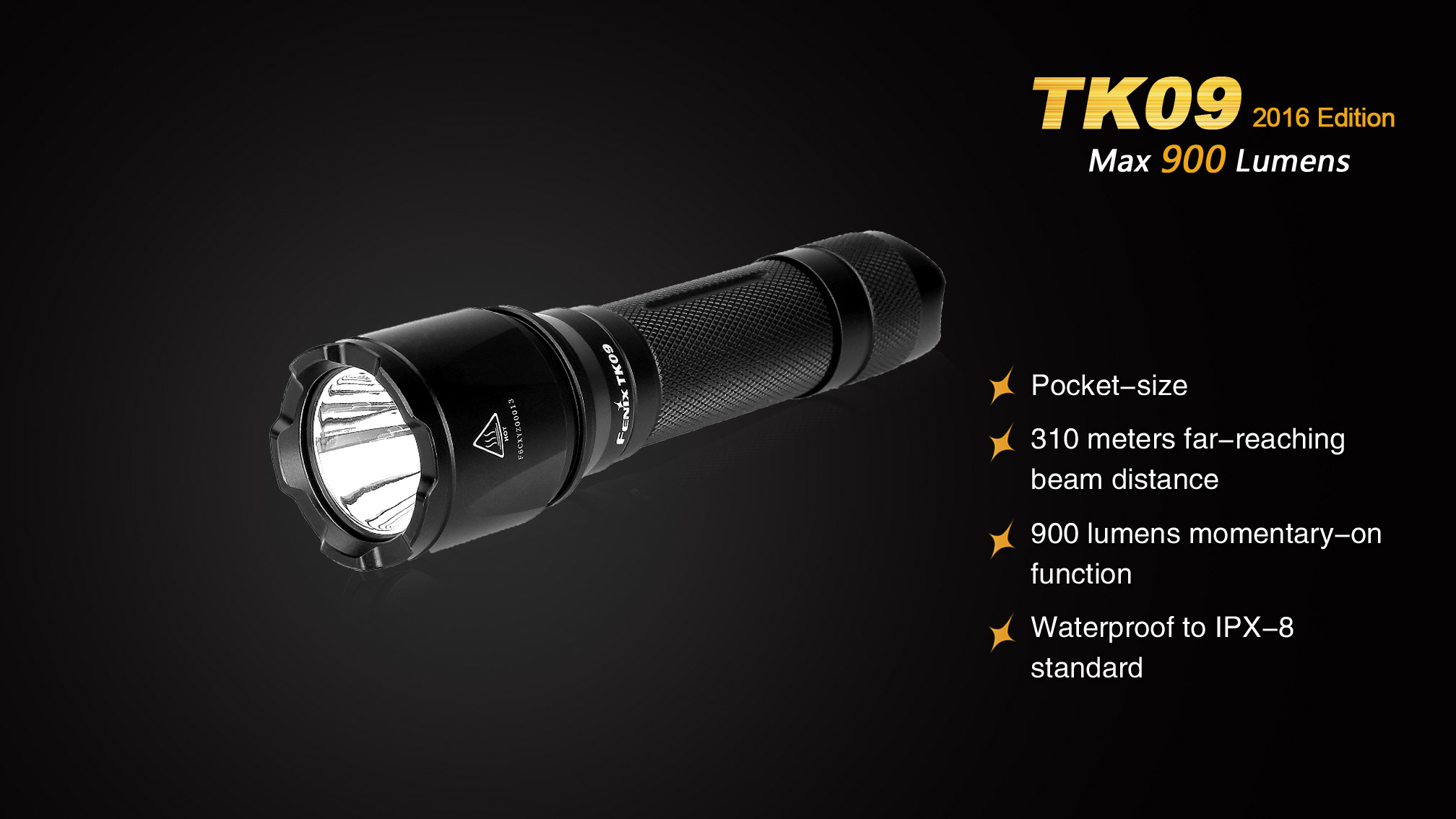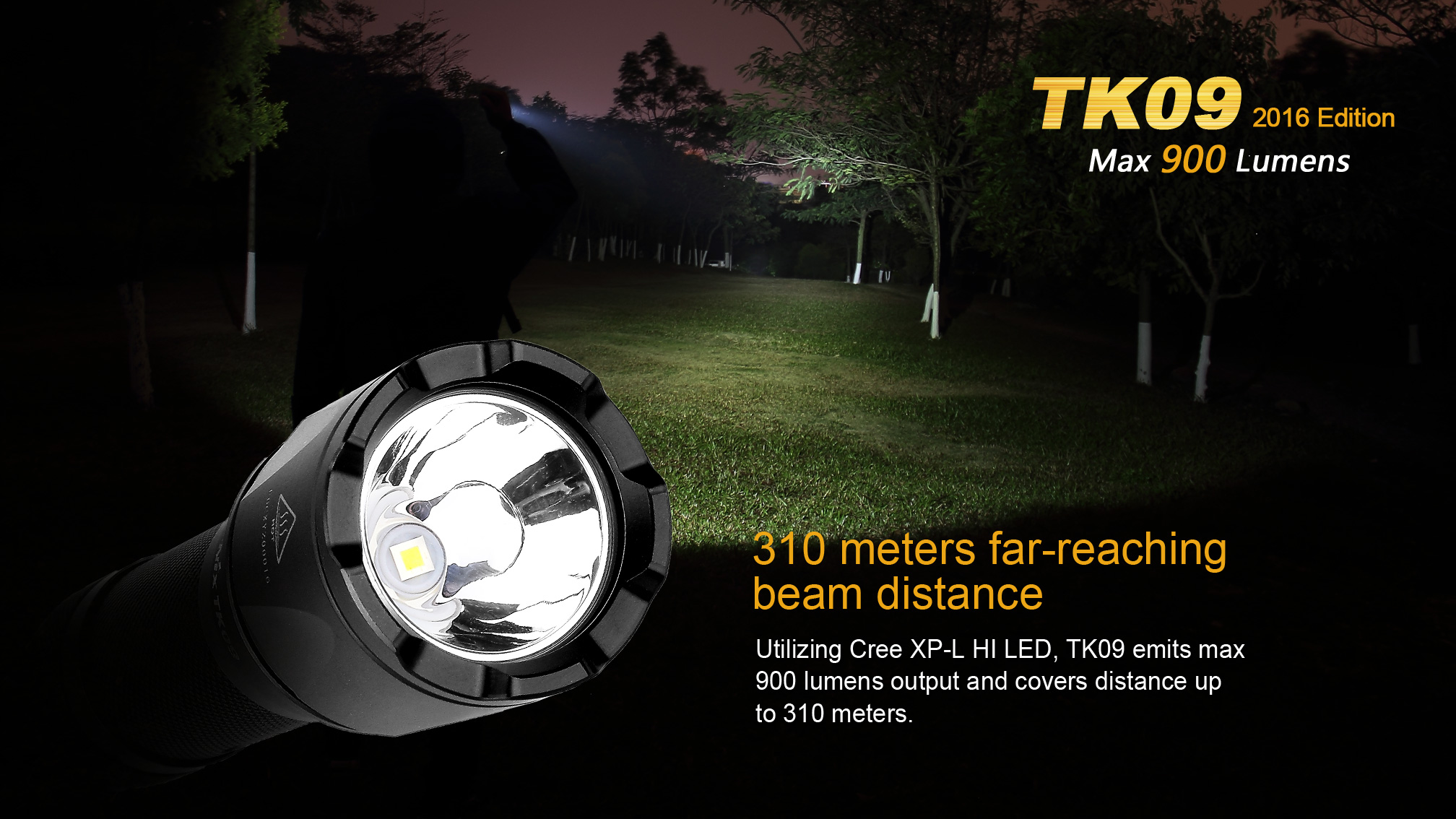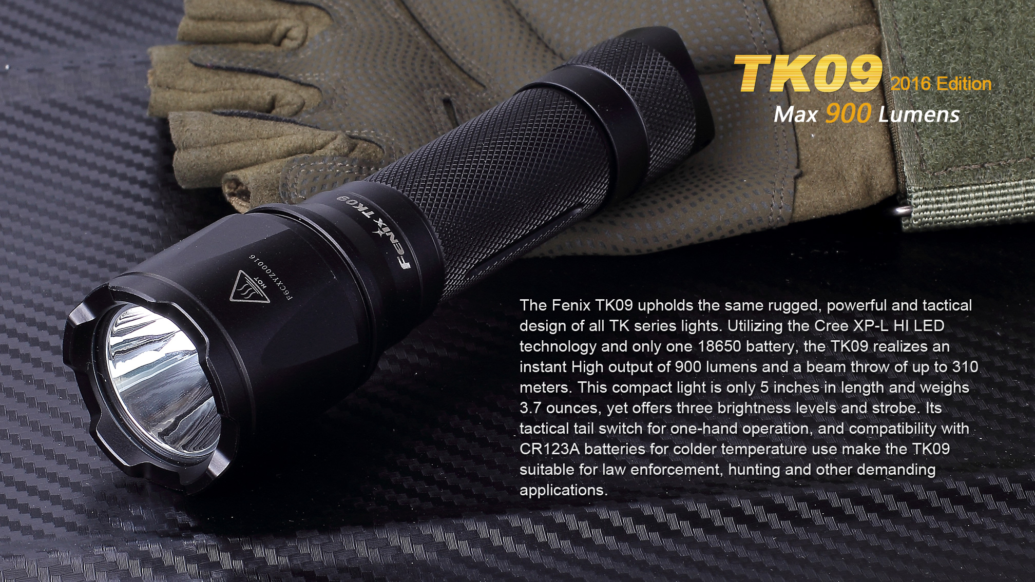 Nová generácia obľúbené taktické baterky Fenix TK09 XP-L ponúka jednoduché ovládanie a svetelný tok až 900 lúmenov (ANSI). Je osadená špičkovou LED Cree XP-L HI (High Intensity), vďaka ktorej dosvieti až do úctyhodnej vzdialenosti 310 metrov. Baterka je napájaná digitálne kontrolovaným konštantným prúdom, pre zaručenie stáleho svetelného výkonu aj pri znižovaní napätia v batériách. Solídny a vodeodolný design predurčuje tuto taktickú baterku primárne do drsných vonkajších podmienok a na použitie v bezpečnostných zložkách, pri vyhľadávaní, záchranných akciách a v poľovníctve.
