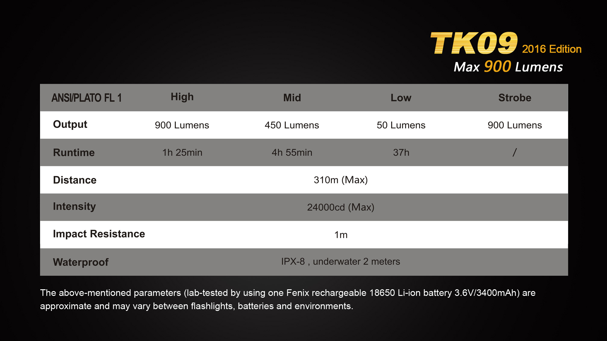 Všetky parametre baterky (svetelný tok, doba svietenia na batérie, vodotesnosť, dosvit a nárazuvzdornosť) sú merané v súlade s normou ANSI/NEMA FL 1-2009 Flashlight Basic Performance Standard.