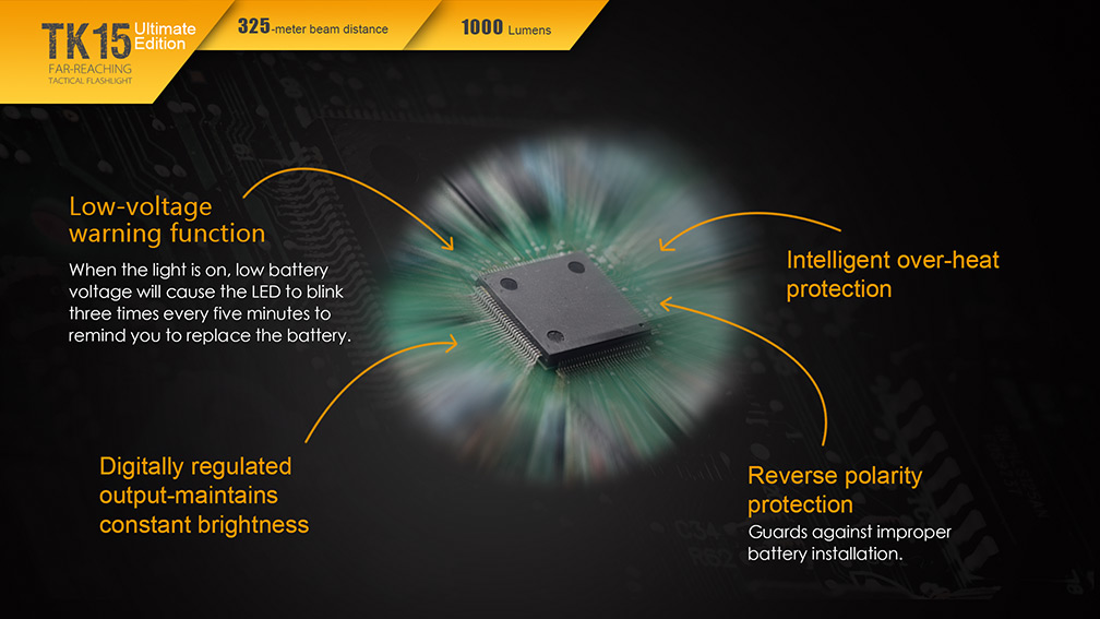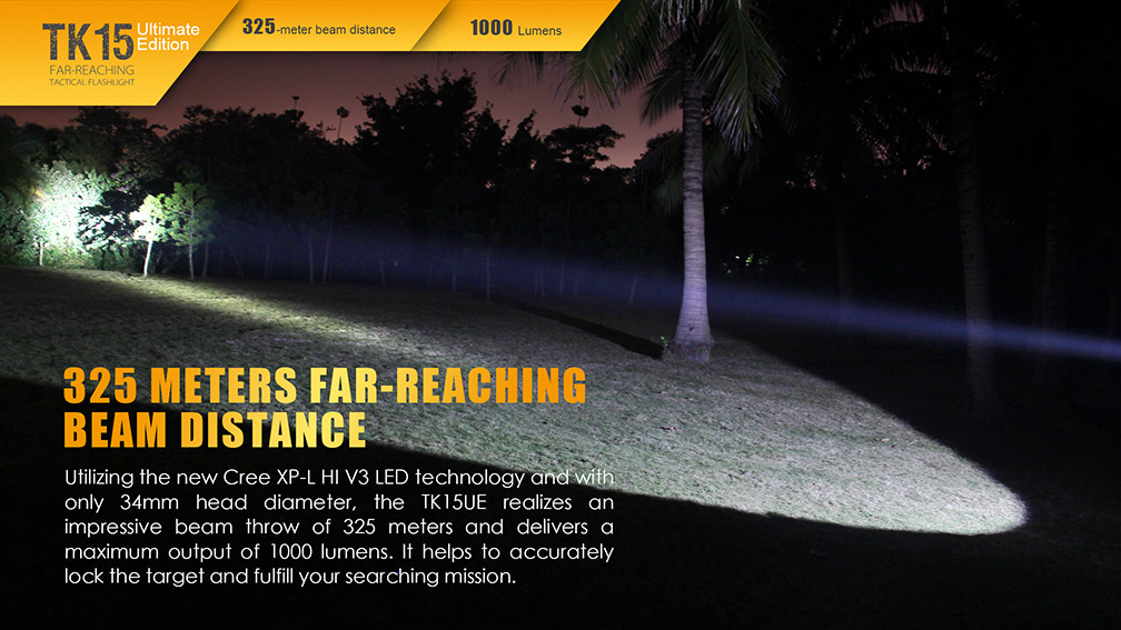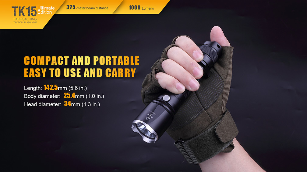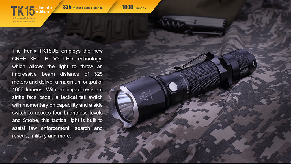 Taktická baterka Fenix TK15 Ultimate Edition ponúka naozaj vysoký svetelný tok. Je osadené špičkovou LED Cree XP-L HI (High Intensity), ktorá v kombinácii s hladkým reflektorom vytvára dobre zaostrený svetelný kužeľ s ďalekým dovitem. Robustné a vodeodolné prevedenie predurčuje túto taktickú baterku do drsných vonkajších podmienok, pre profesionálov, ozbrojené zložky a poľovníctvo. LED baterka Fenix TK15 UE je vďaka svojmu masívnemu prevedení pevné ako tank a pritom si zachováva kompaktnú veľkosť. Baterka je napájaná digitálne kontrolovaným konštantným prúdom pre zaručenie stáleho svetelného výkonu aj pri znižovaní napätia v batériách (pri ich pozvoľnom vybíjaní). Fenix TK15 UE disponuje celkom piatimi režimami osvetlenia. Tento model je nástupcom obľúbených modelov Fenix TK15 a TK15C.