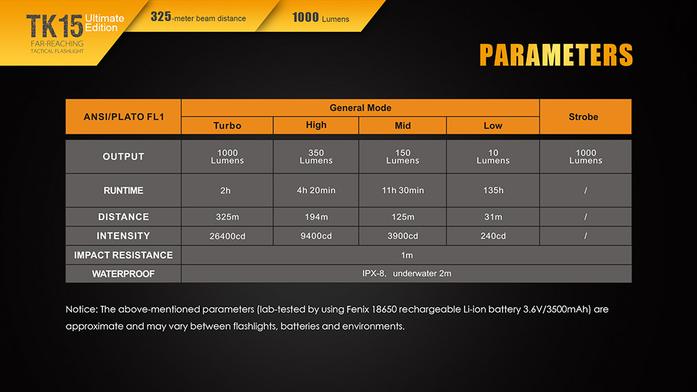 Všetky parametre baterky (svetelný tok, doba svietenia na batérie, vodotesnosť, dosvit a nárazuvzdornosť) sú merané v súlade s normou ANSI/NEMA FL 1-2009 Flashlight Basic Performance Standard.
