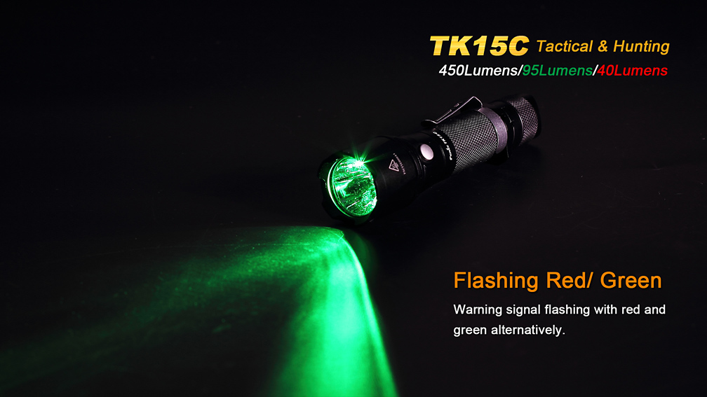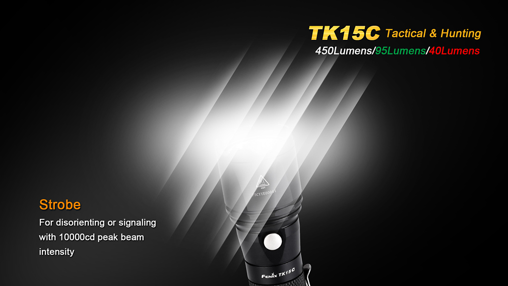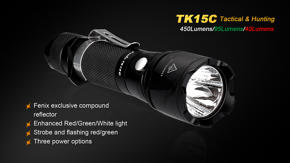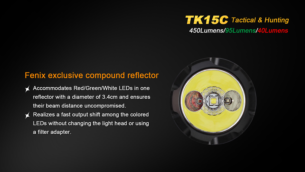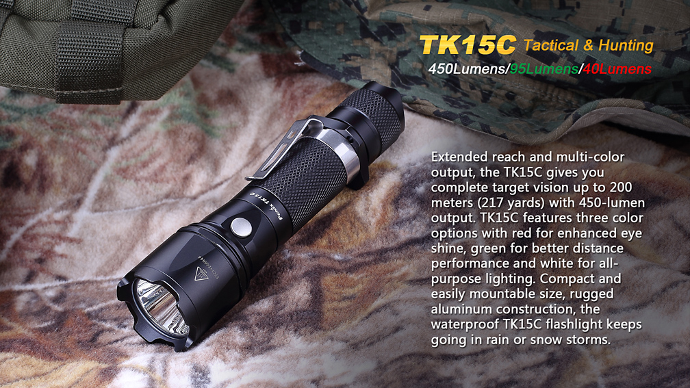 Taktická baterka Fenix TK15C sa vyznačuje unikátnou konštrukciou reflektora, ktorý ukrýva tri LED. Okrem klasickej bielej Cree XP-G2 s výkonom 450 lúmenov a dosvitom 200 metrov, je možné využiť LED so zeleným (95 lúmenov, dosvit 65 metrov) a červeným (40 lúmenov, 26 metrov) svetlom. TK15C si samozrejme zachováva prednosti taktických svietidiel Fenix, ako je odolnosť, nárazuvzdornosť a vodotesnosť. Napájanie zaisťujú dve lítiové batérie CR123A, alebo jeden li-ion akumulátor 18650. Široká škála príslušenstva rozširuje použiteľnosť baterky v akcii – s baterkou je kompatibilný napríklad vzdialený káblový spínač AR102, difuzér AOD-M či dopravný kužeľ AOT-M.