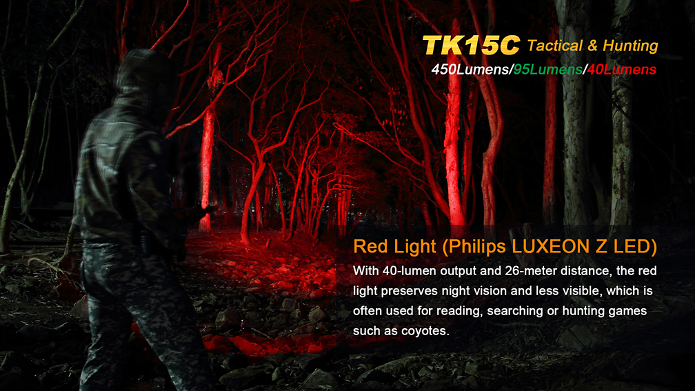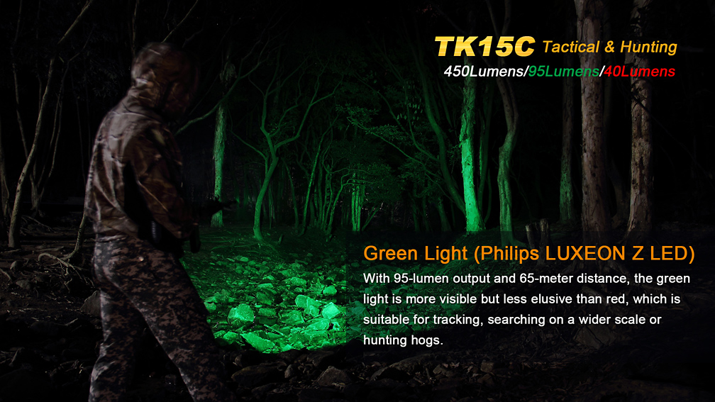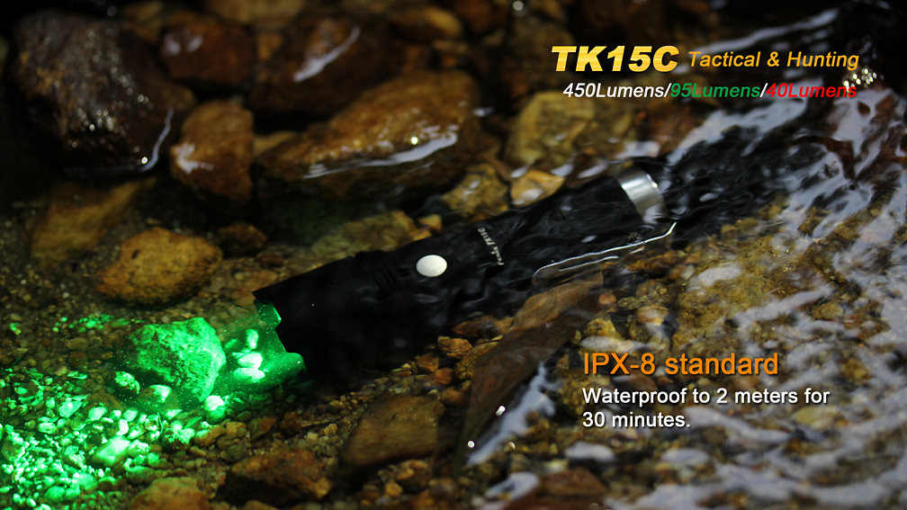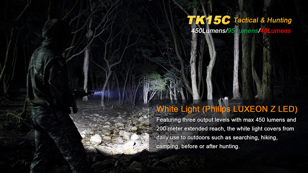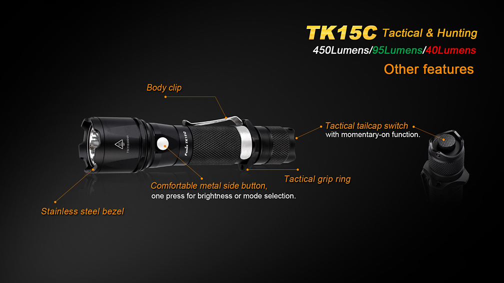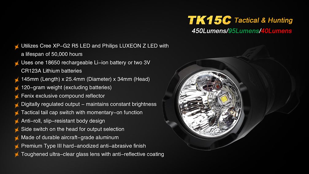 Taktická baterka Fenix TK15C sa vyznačuje unikátnou konštrukciou reflektora, ktorý ukrýva tri LED. Okrem klasickej bielej Cree XP-G2 s výkonom 450 lúmenov a dosvitom 200 metrov, je možné využiť LED so zeleným (95 lúmenov, dosvit 65 metrov) a červeným (40 lúmenov, 26 metrov) svetlom. TK15C si samozrejme zachováva prednosti taktických svietidiel Fenix, ako je odolnosť, nárazuvzdornosť a vodotesnosť. Napájanie zaisťujú dve lítiové batérie CR123A, alebo jeden li-ion akumulátor 18650. Široká škála príslušenstva rozširuje použiteľnosť baterky v akcii – s baterkou je kompatibilný napríklad vzdialený káblový spínač AR102, difuzér AOD-M či dopravný kužeľ AOT-M.