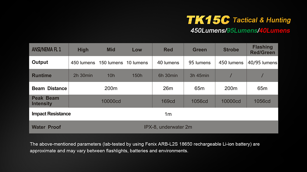 Všetky parametre baterky (svetelný tok, doba svietenia na batérie, vodotesnosť, dosvit a nárazuvzdornosť) sú merané v súlade s normou ANSI/NEMA FL 1-2009 Flashlight Basic Performance Standard.