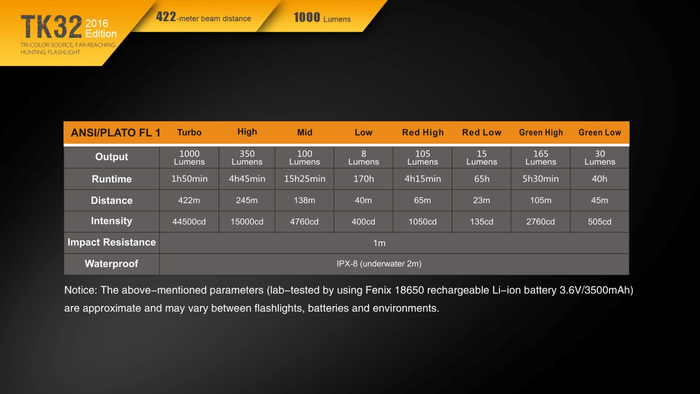 Všetky parametre svietidla (svetelný tok, doba svietenia na batérie, vodotesnosť, dosvit a nárazuvzdornosť) sú merané v súlade s normou ANSI/NEMA FL 1-2009 Flashlight Basic Performance Standard.