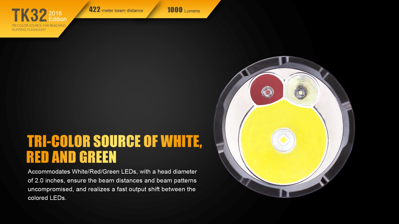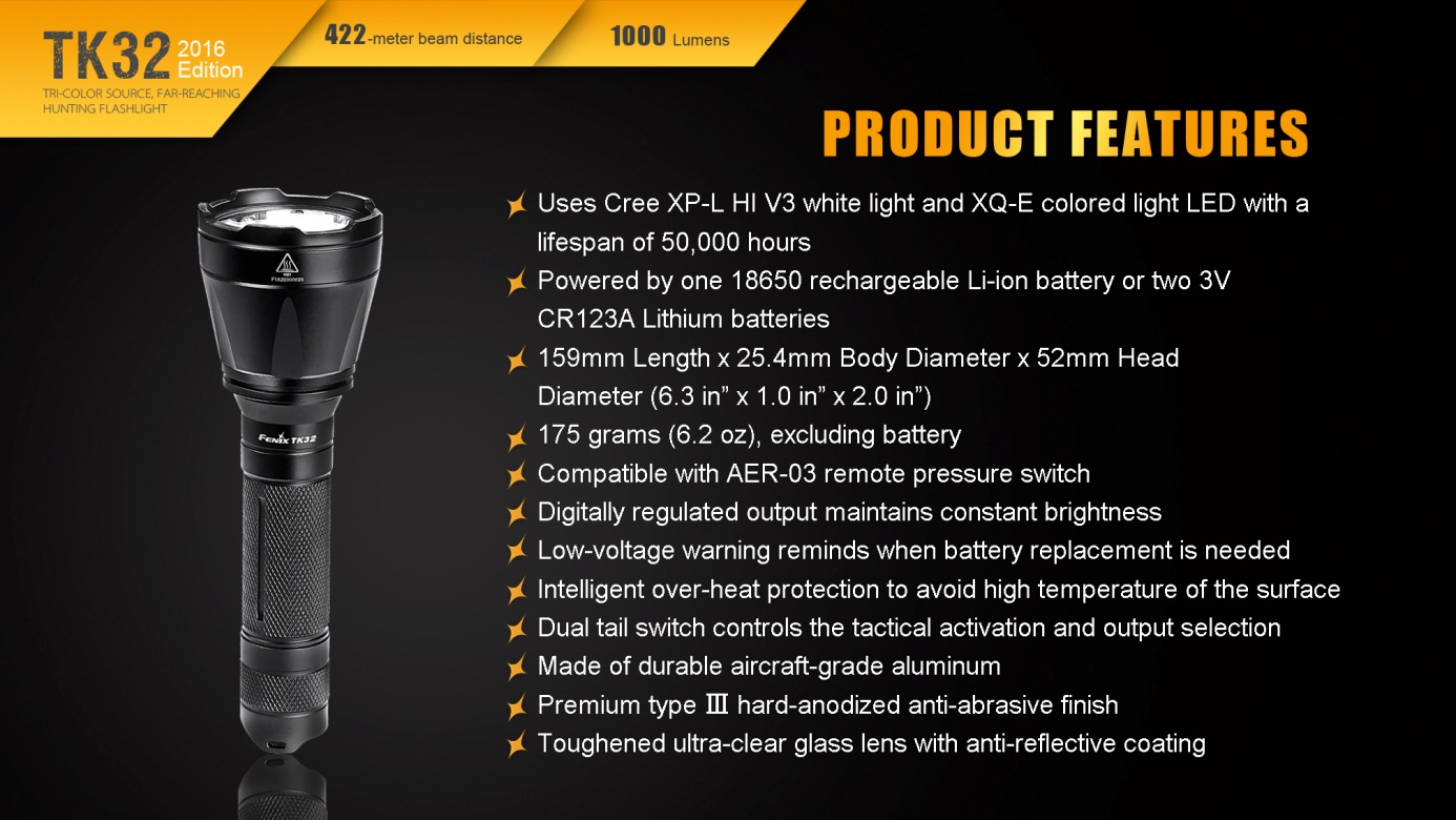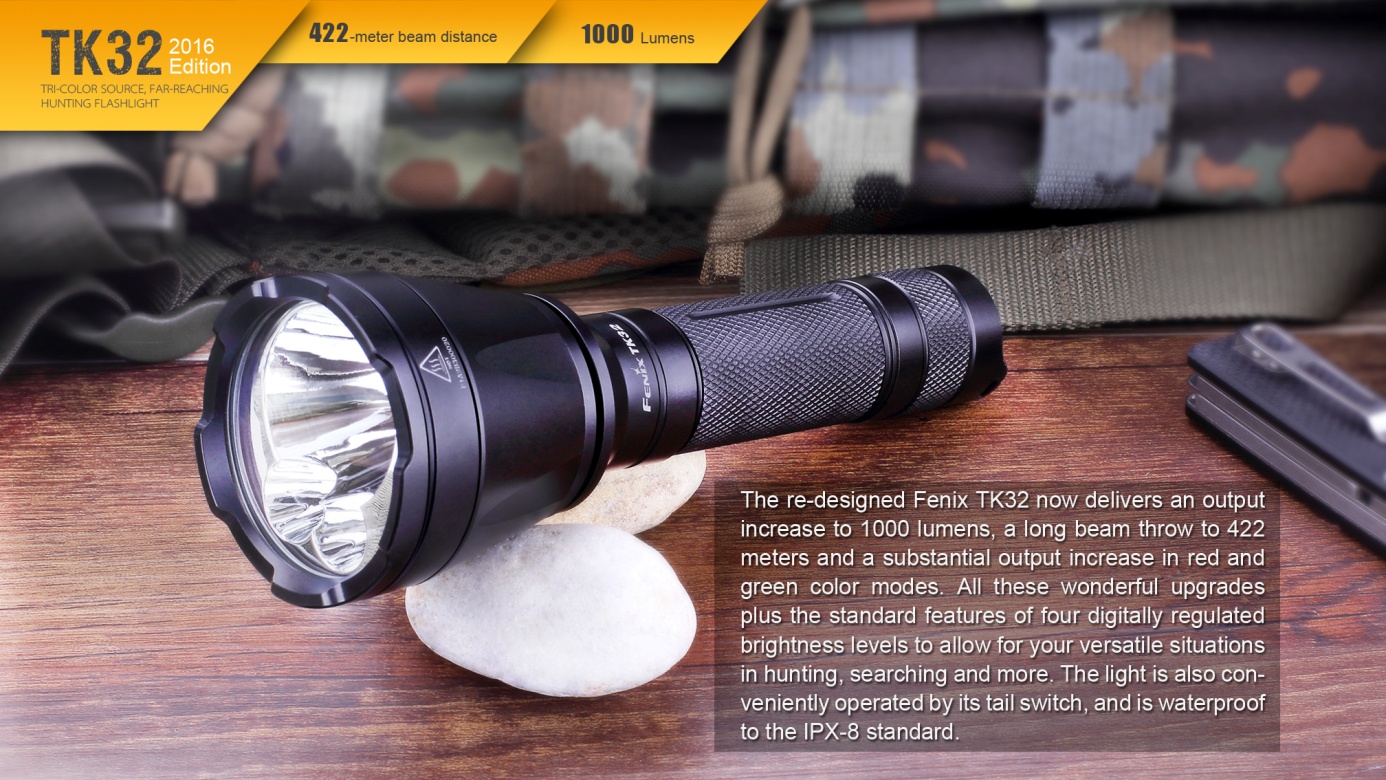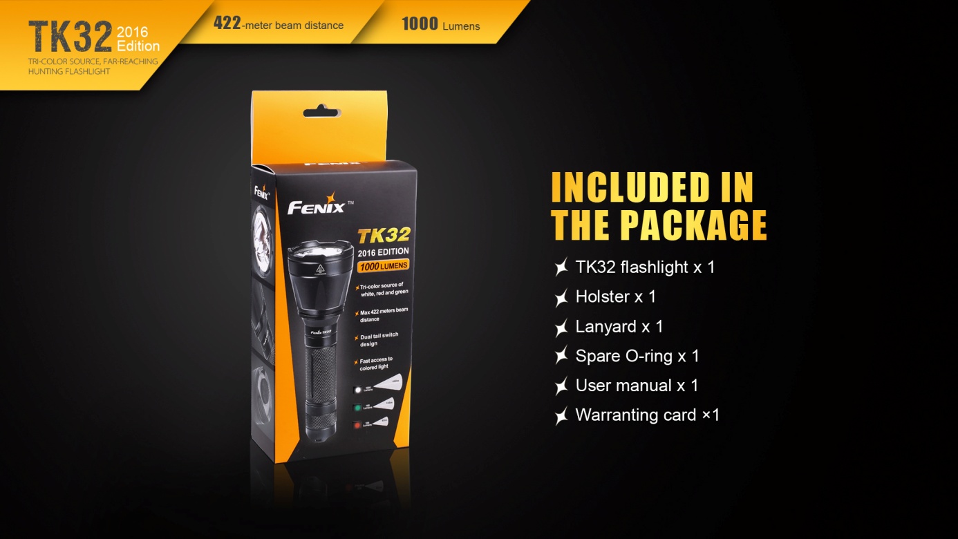 Nová generácia baterky Fenix TK32 patrí k najsilnejším taktickým svetlám v ponuke. Jej mohutný reflektor ponúka skutočne veľký dosvit a svetelný tok. Unikátny prednosťou sú farebné diódy (červená, zelená) integrované do reflektora. Hlavným svetelným zdrojom je nejmodernější LED Cree XP-L HI V3, farebné svetlo obstarávajú dve LED Cree XQ-E. Baterku je možné napájať dvomi lítiovými CR123A batériami alebo jedným li-ion akumulátorom typu 18650. LED baterka Fenix TK32 2016 Edition disponuje celkom štyrmi funkciami svietenia bieleho svetla s výdržou až 170 hodín a štyrmi režimami s farebným svetlom. V zadnej časti baterky je taktický spínač umožňujúci okamžitú aktiváciu polovičným stlačením a druhý spínač, ktorým sa ovládajú režimy svietenia. TK32 je špičkovým svetelným nástrojom pre profesionálov a lovca.