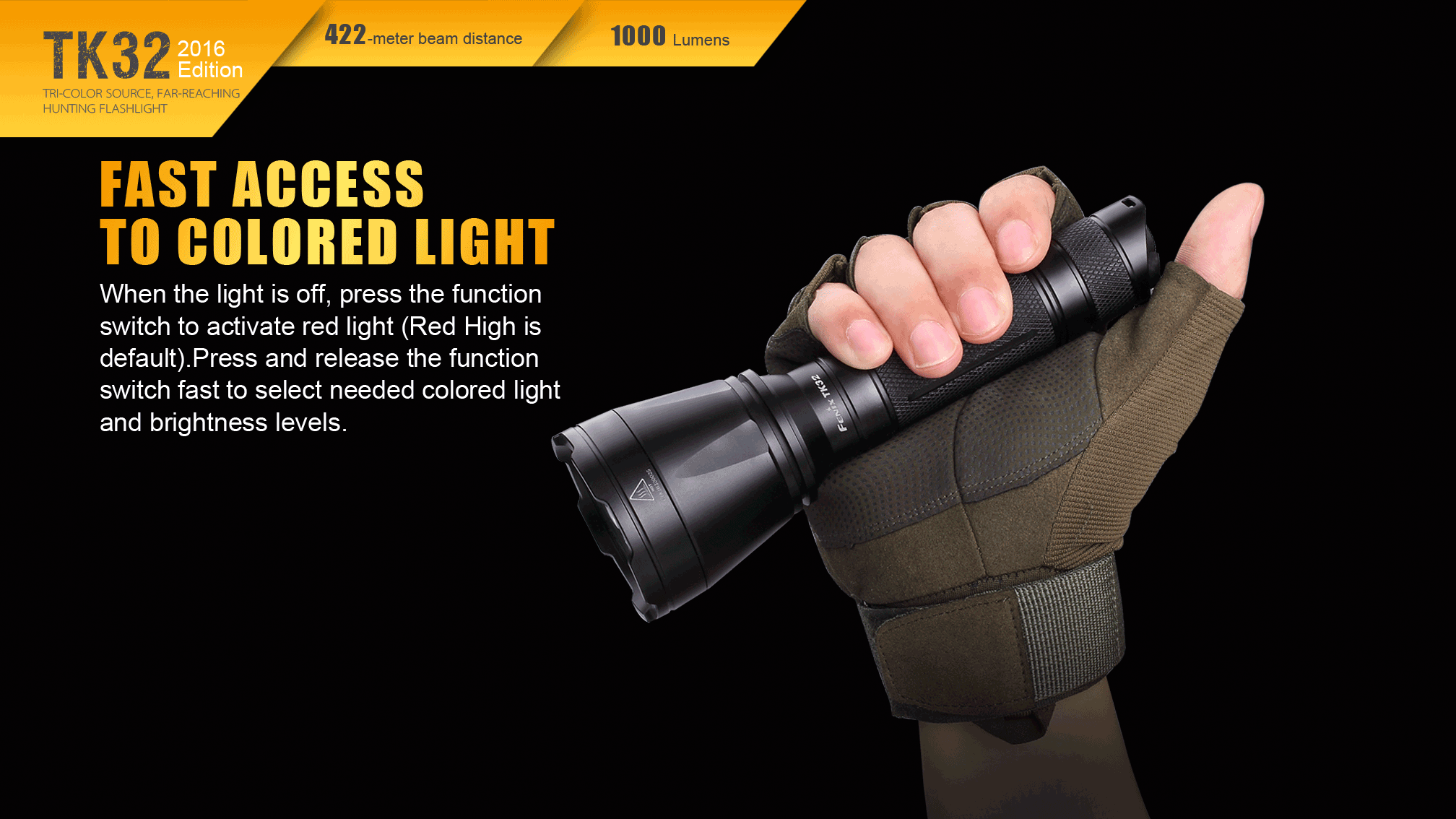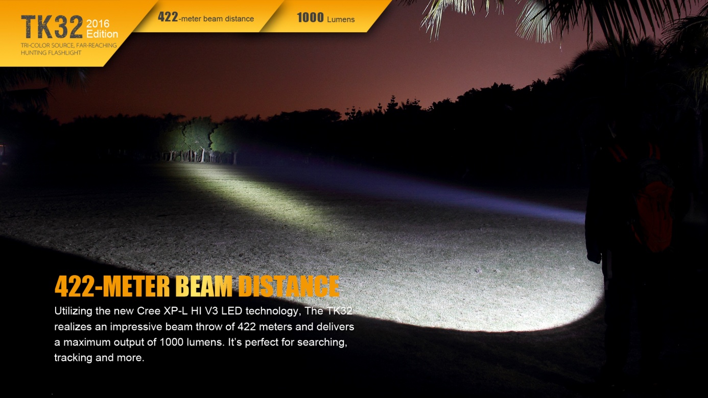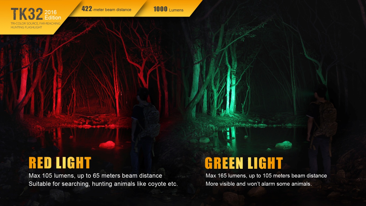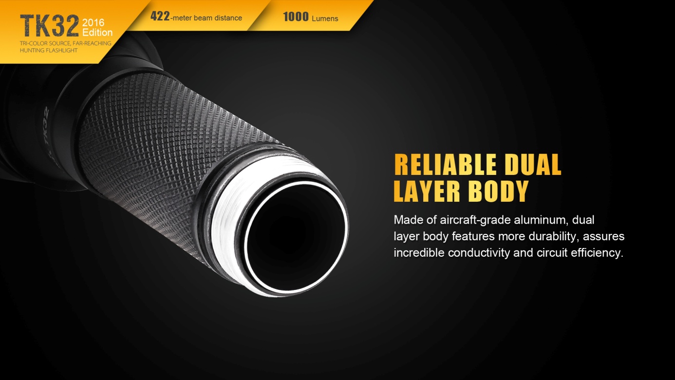 Nová generácia baterky Fenix TK32 patrí k najsilnejším taktickým svetlám v ponuke. Jej mohutný reflektor ponúka skutočne veľký dosvit a svetelný tok. Unikátny prednosťou sú farebné diódy (červená, zelená) integrované do reflektora. Hlavným svetelným zdrojom je nejmodernější LED Cree XP-L HI V3, farebné svetlo obstarávajú dve LED Cree XQ-E. Baterku je možné napájať dvomi lítiovými CR123A batériami alebo jedným li-ion akumulátorom typu 18650. LED baterka Fenix TK32 2016 Edition disponuje celkom štyrmi funkciami svietenia bieleho svetla s výdržou až 170 hodín a štyrmi režimami s farebným svetlom. V zadnej časti baterky je taktický spínač umožňujúci okamžitú aktiváciu polovičným stlačením a druhý spínač, ktorým sa ovládajú režimy svietenia. TK32 je špičkovým svetelným nástrojom pre profesionálov a lovca.