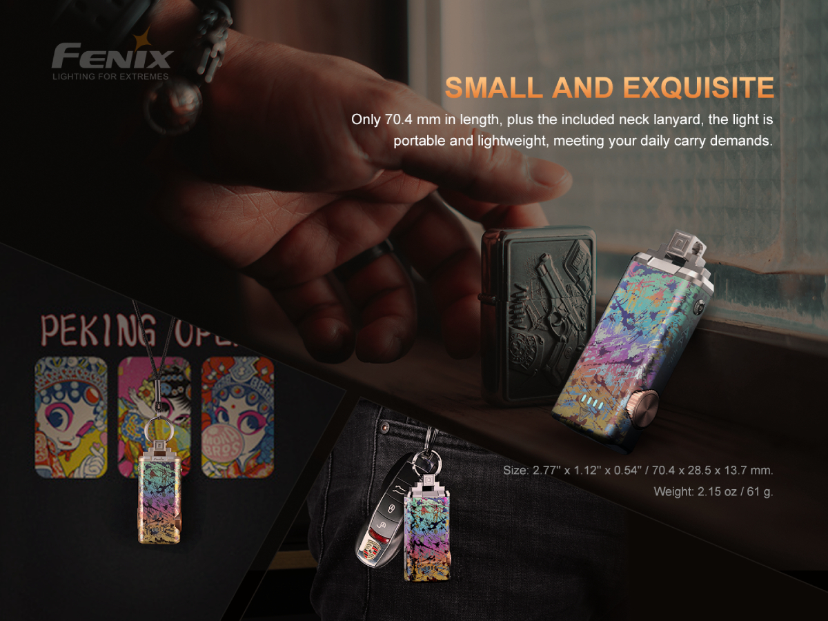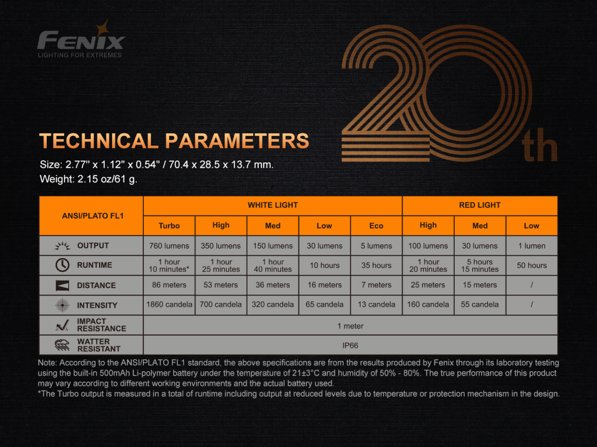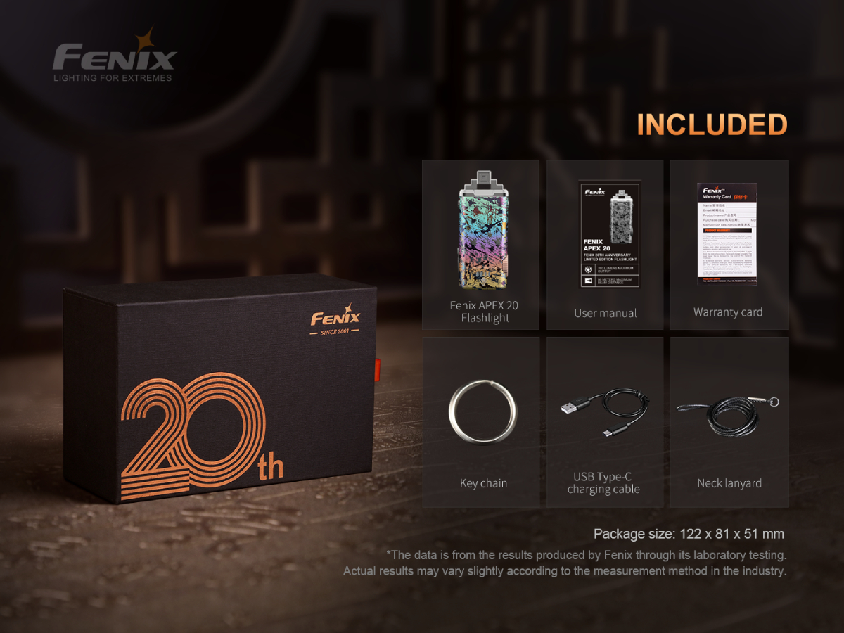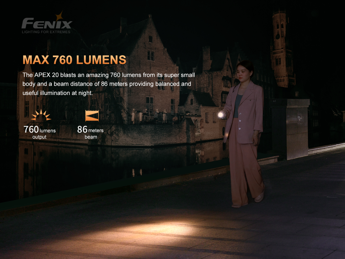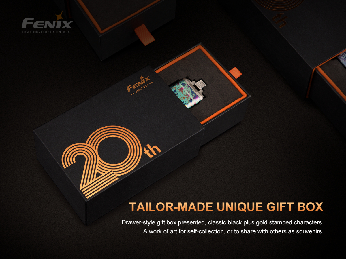 Fenix APEX 20 je špeciálna limitovaná edícia pripomínajúca 20. výročie založenia spoločnosti Fenixlight. Celosvetovo bolo vyrobených iba 2500 kusov a každé svietidlo je vybavené unikátnym sériovým číslom. Toto jedinečné dizajnové svietidlo je vyrobené zo zliatiny titánu TC4 a má charakteristickú textúru. Aj napriek minimálnym rozmerom vyžaruje biele svetlo s výkonom až 760 lúmenov a dosvit je solídnych 86 metrov. Navyše disponuje aj červeným svetlo s výkonom až 100 lúmenov. Svietidlo má veľmi jednoduché a intuitívne ovládanie, kedy je možné otočným kolieskom ľahko prepínať režimy bieleho a červeného svetla. Vstavaný Li-pol akumulátor s kapacitou 500 mAh sa nabíja cez moderný USB-C konektor a pri plnom nabití dokáže svietiť v režime bieleho svetla až 35 hodín a v prípade červeného svetla až 50 hodín. Toto luxusné a zároveň veľmi výkonné vreckové svietidlo bude určite vhodným darčekom alebo aj doplnkom každého, kto potrebuje mať svetlo ihneď po ruke. Dá sa ľahko pripevniť na kľúče a so svojimi rozmermi, ktoré na dĺžku nepresahujú 7 cm, sa pohodlne zmestí aj do vrecka alebo kabelky. Ako dizajnový doplnok ho možno nosiť aj na krku (šnúrka je v balení).
