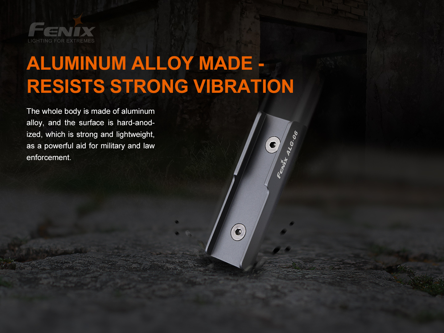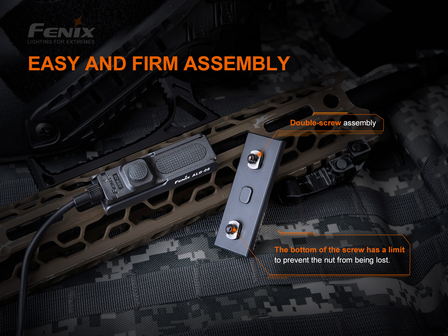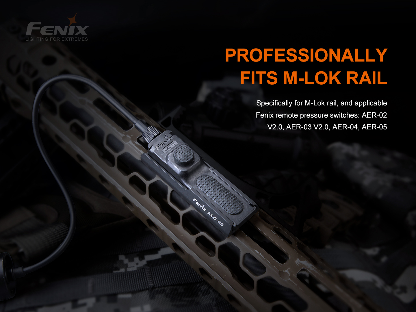 Úchyt Fenix ALG-06 je možné použiť na upevnenie koncovky káblového spínača na rozhranie M-LOK (Magpul Lock). Je kompatibilný s káblovými spínačmi Fenix AER-02, Fenix AER-02 V2.0, Fenix AER-03, Fenix AER-03 V2.0, Fenix AER-04 a Fenix AER-05.