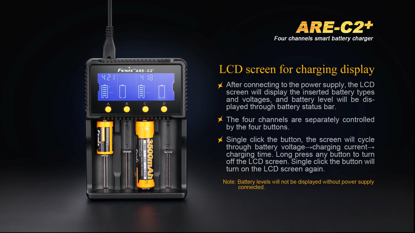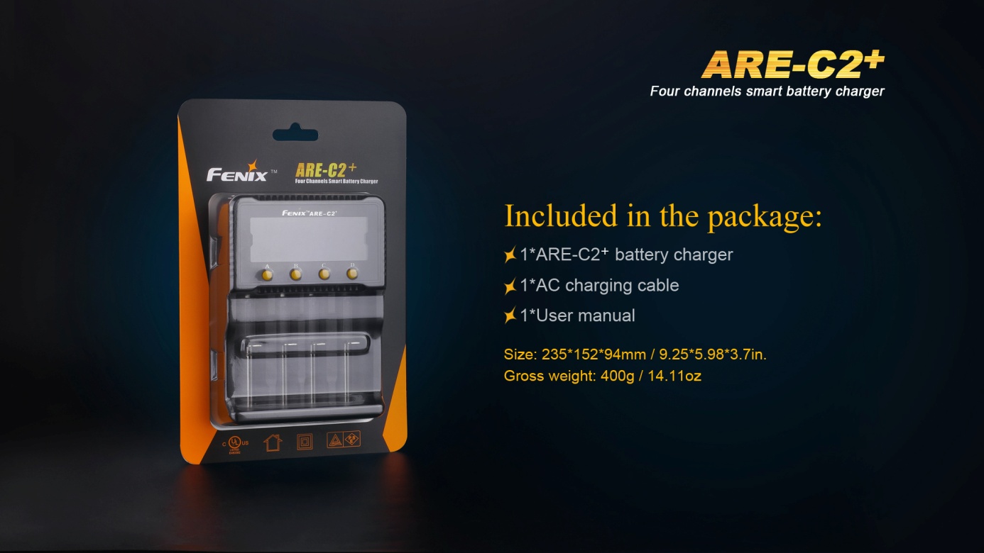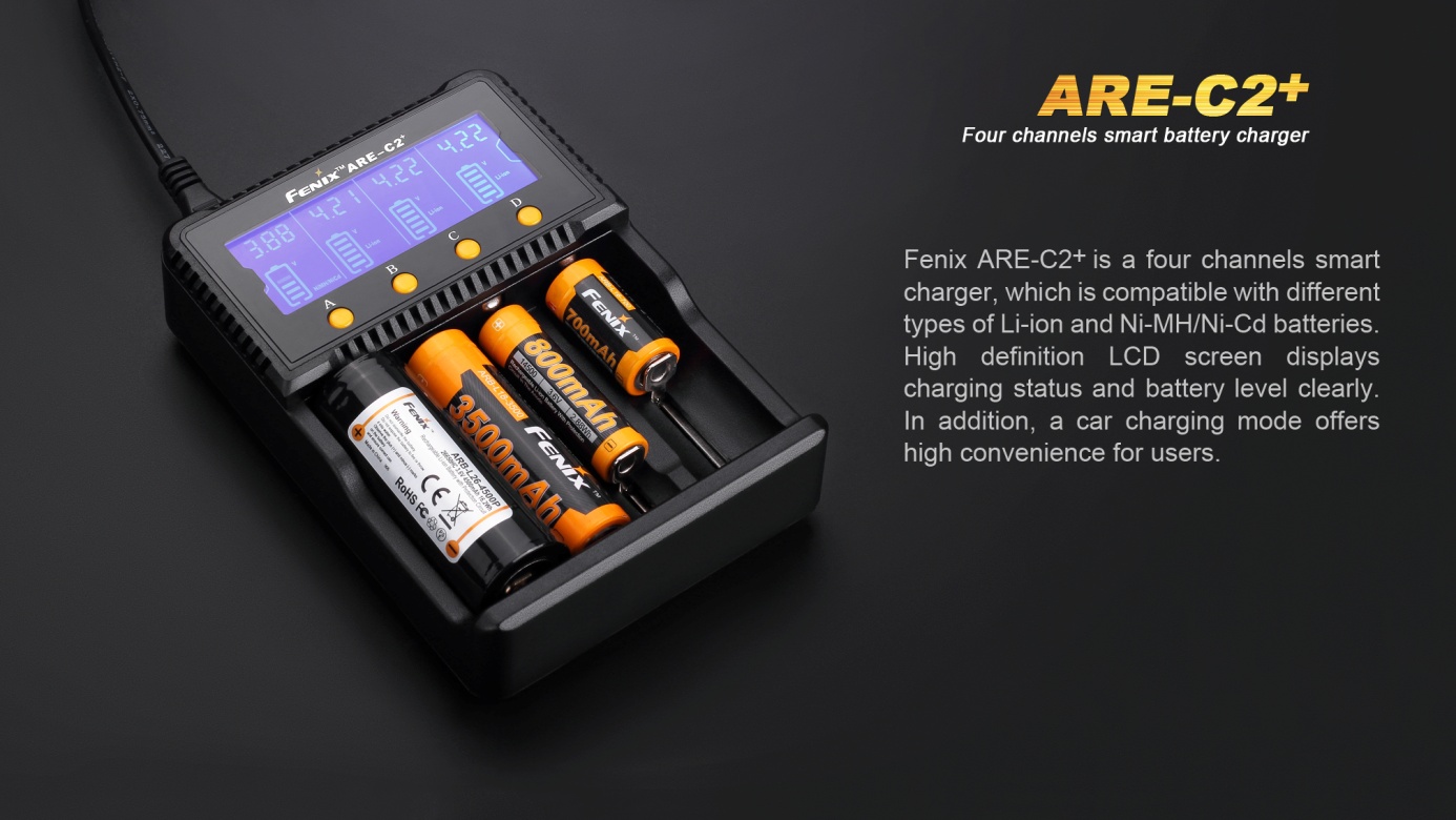 Univerzálna štvorkanálová nabíjačka Fenix ARE-C2 + je určená pre 3,7V / 3,6V Li-ion aj NiMH / NiCd akumulátory. Každý nabíjací slot je monitorovaný nezávisle, takže je možné naraz nabíjať batérie rôznych veľkostí, kapacít a dokonca aj rôznych chémiou (Li-ion aj NiMH / NiCd je možné nabíjať naraz). Automaticky rozpozná vložený typ akumulátora a zvolí optimálny nabíjací algoritmus.