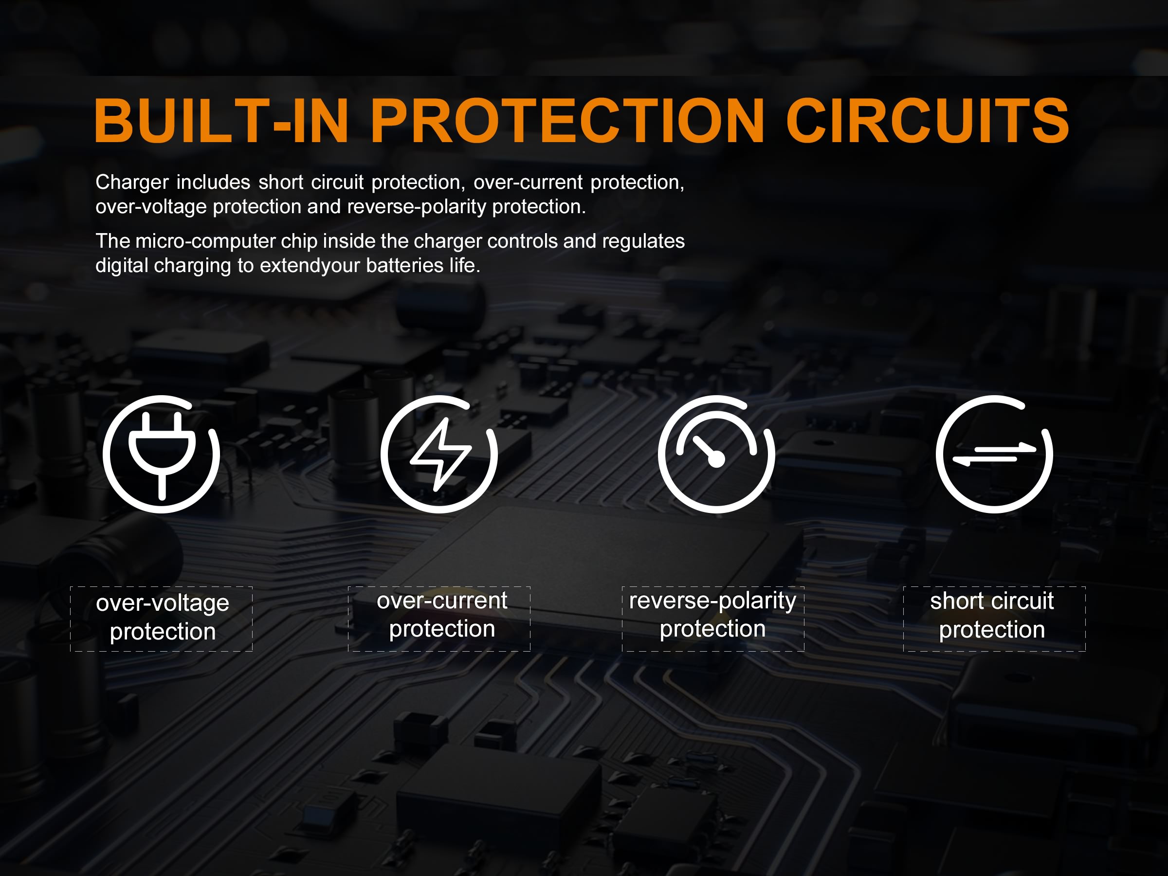 - Ochrana proti opačnému vloženia batérií, skratu, prebitiu a príliš hlbokému vybitiu.