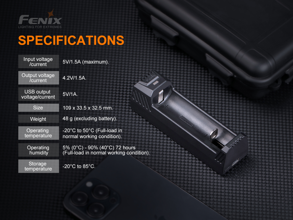 Kompaktná univerzálna USB nabíjačka Fenix ARE-X1 V2.0 na jeden kus Li-ion akumulátora typu 21700, 26650 či 18650. Pri vložení nabitého akumulátora funguje aj ako záložný zdroj (powerbanka) na nabíjanie USB zariadení (mobilné telefóny, MP3 prehrávače a ďalšie). Nabíjačka je určená pre 3,7V a 3,6V lítium-iónové akumulátory s dĺžkou 65–75 milimetrov. Nabíjací prúd až 1500mA, podľa možností USB zdroja do ktorého budete mať nabíjačku pripojenú (počítač, sieťový USB zdroj, nabíjačka na mobilný telefón s micro USB). Doba nabíjania sa tak môže pohybovať zhruba od 2 do 6 hodín. Vďaka minimálnym rozmerom je nabíjačka vhodná najmä na cesty.