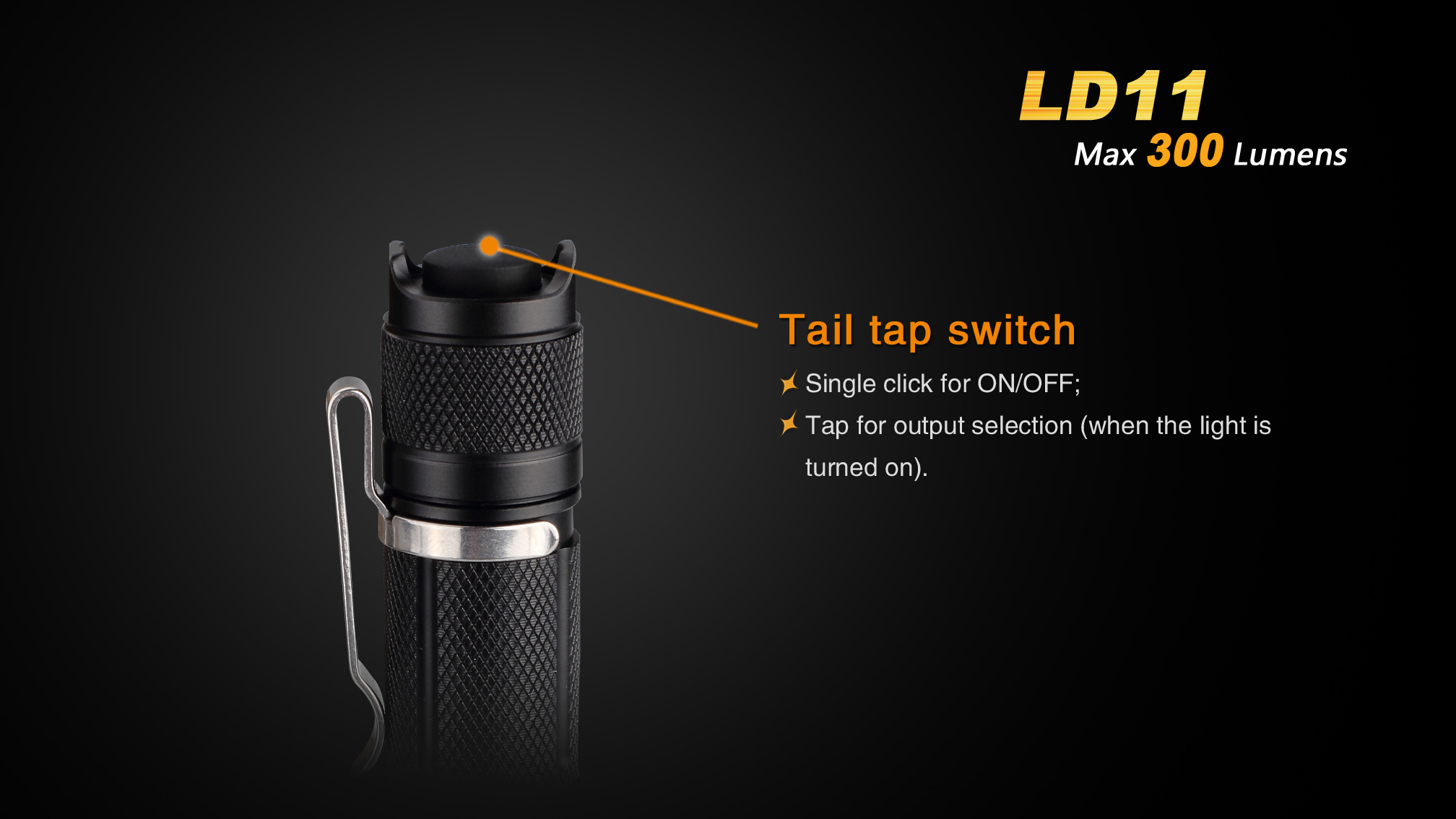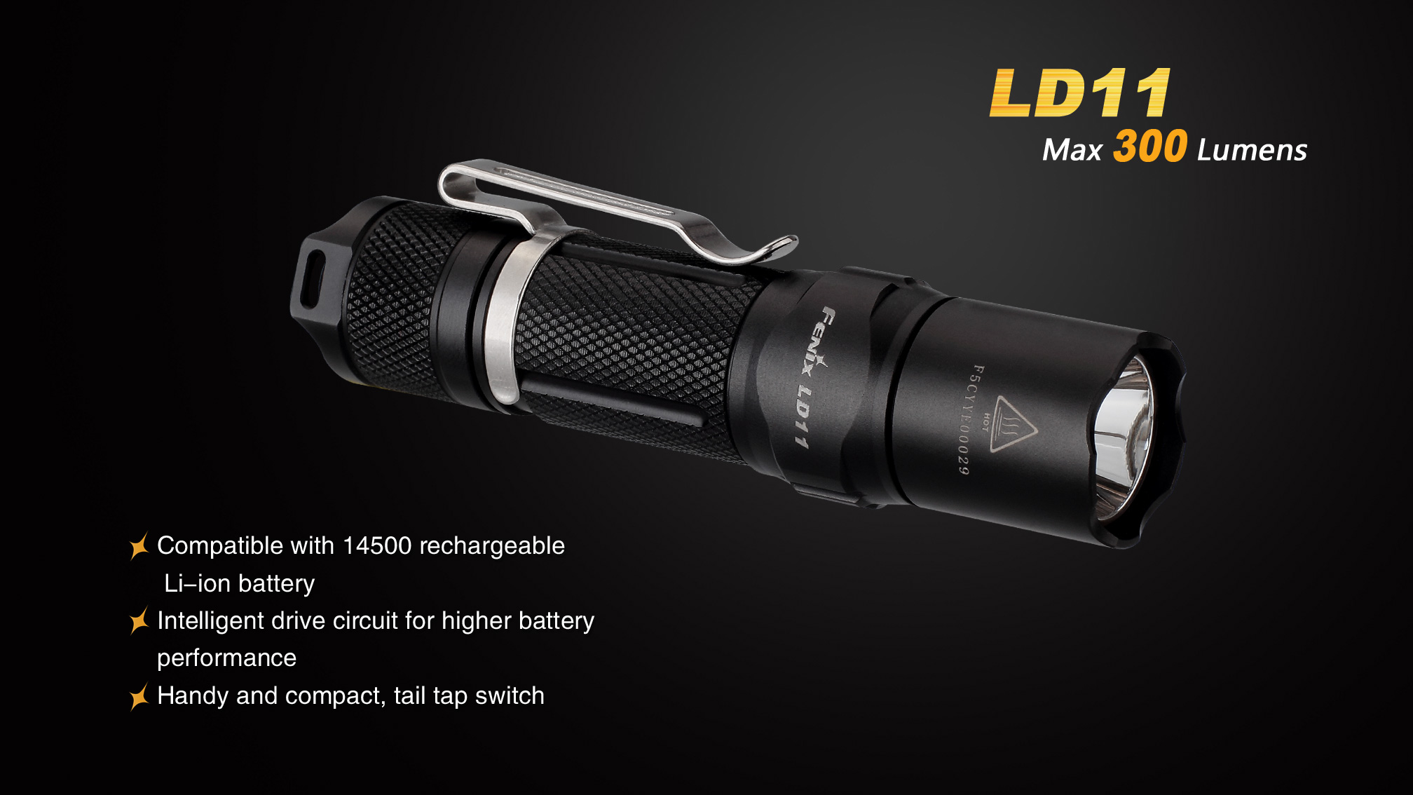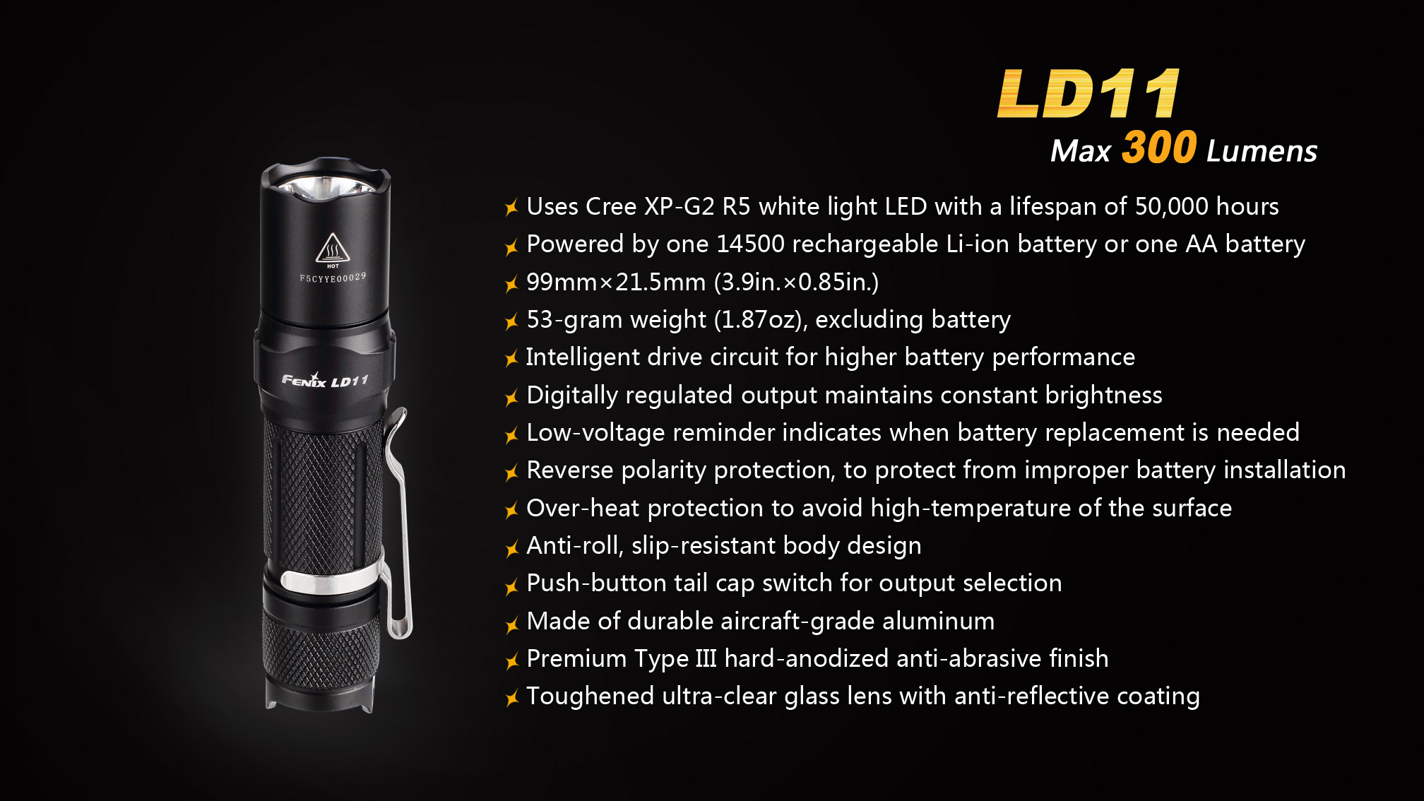LD11 je vrecková baterka s dvojitou možnosťou napájania. Môžete použiť klasickú tužkovú AA batériu, alebo nabíjací li-ion akumulátor typu 14500. Vďaka modernej dióde Cree XP-G2 R5 ponúka svetelný tok až 300 lúmenov. Jednoduché ovládanie taktickým spínačom na konci umožňuje vyberať medzi piatimi režimami svietenia od najvyššieho výkonu po najdlhšiu výdrž až 58 hodín. Vďaka svojej váhe 53 gramov a dĺžke necelých 10 centimetrov, je vhodne na každodenné nosenie vo vrecku. Oceníte ho ako na turistike, pri kempovaní, tak aj pri ďalších outdoorových aktivitách.