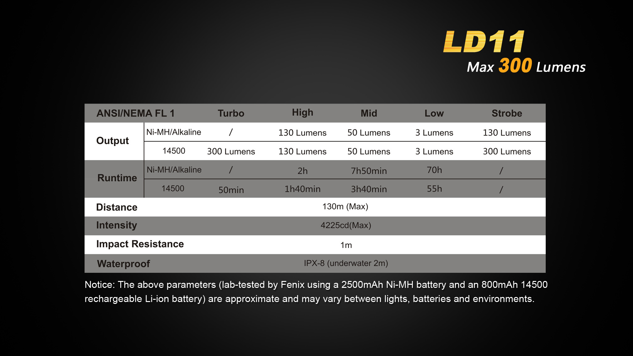 Všetky parametre baterky (svetelný tok, doba svietenia na batérie, vodotesnosť, dosvit a nárazuvzdornosť) sú merané v súlade s normou ANSI/NEMA FL 1-2009 Flashlight Basic Performance Standard.
