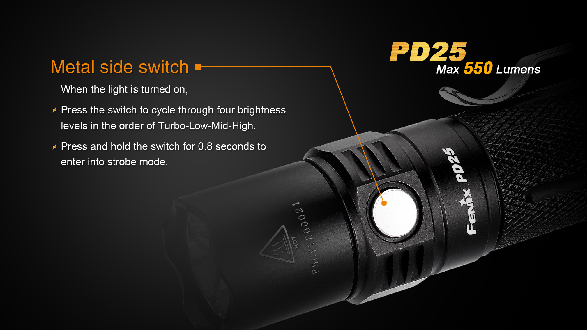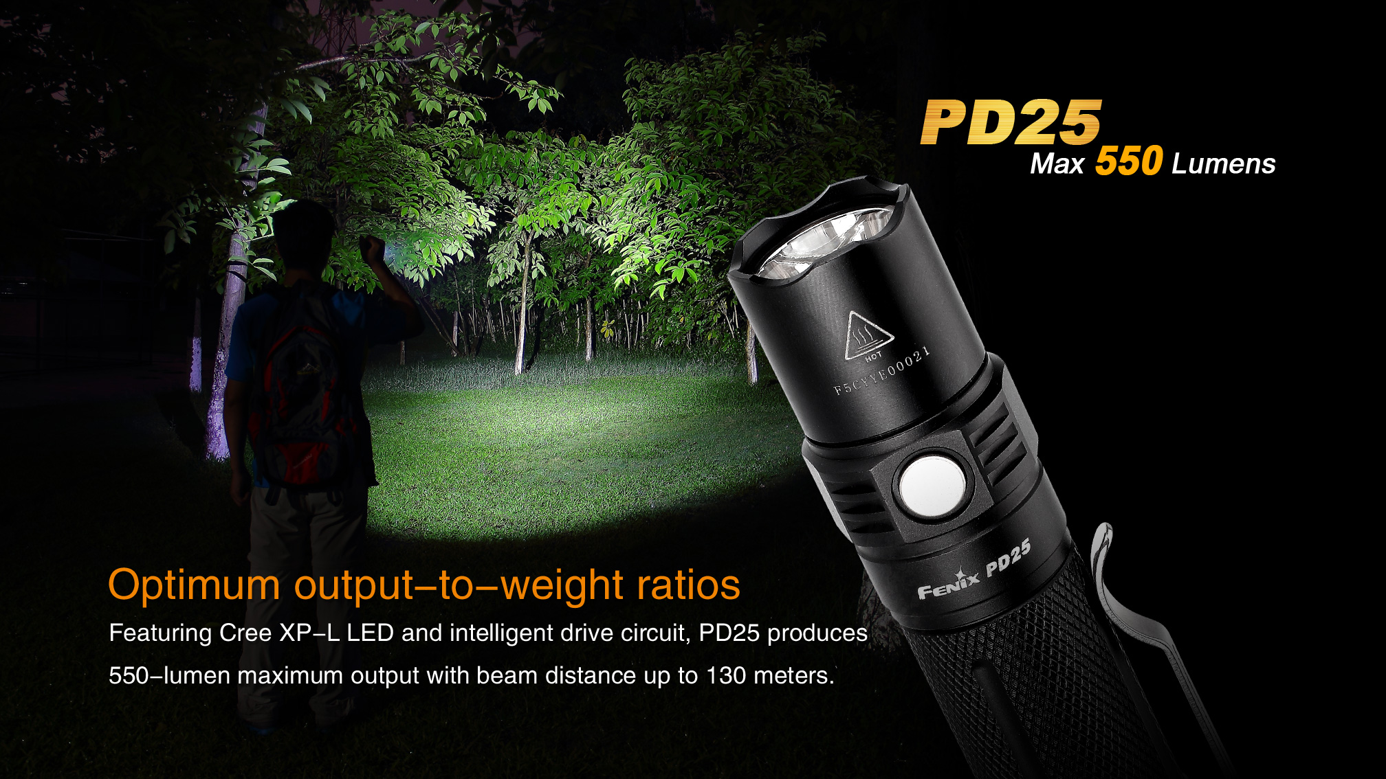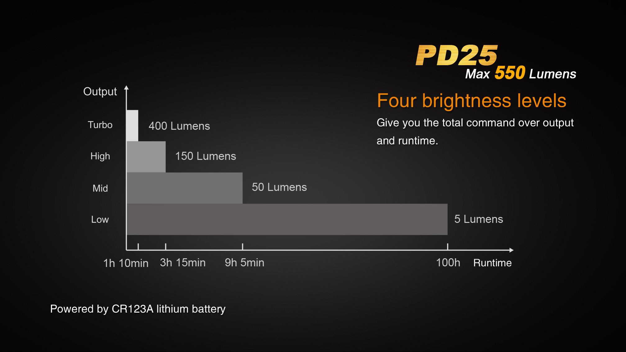 PD25 vás prekvapí svojím výkonom až 550 lúmenov a dosvitom až 130 metrov. Je osadená najnovšou diódou Cree XP-L a ponúkne výdrž až 100 hodín. Na napájanie je možné použiť jednu jednorazovú CR123A batériu či akumulátor RCR123A. Baterka disponuje piatimi rôznymi režimami osvetlenia, ktoré umožnia voliť medzi vysokým výkonom a dlhou výdržou. Ďalšie prednosti tohto modelu sú nízka váha, dĺžka len 9 centimetrov, zapínanie taktickým spínačom na konci a jednoduché prepínanie režimov bočným tlačidlom pri reflektore. Ak hľadáte malé ručné svietidlo, ktoré sa pohodlne zmestí do vrecka, potom je PD25 určené presne pre vás.