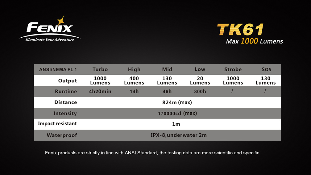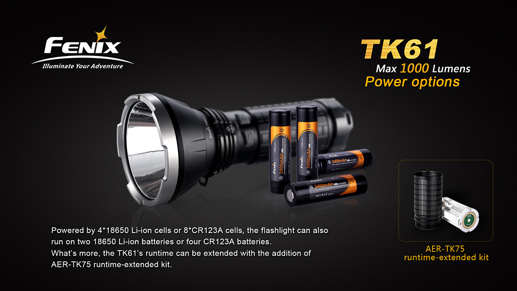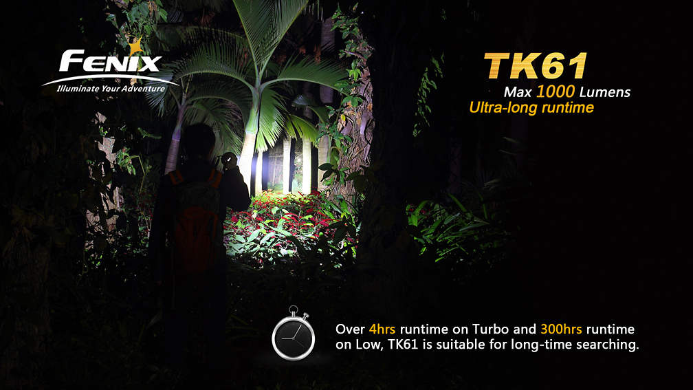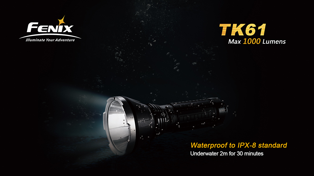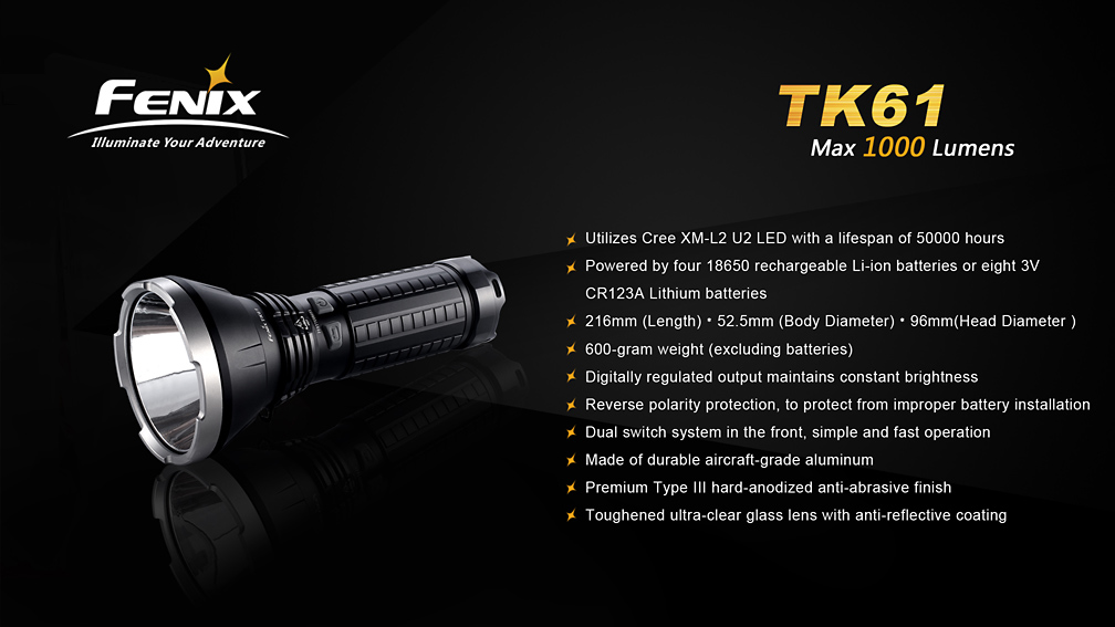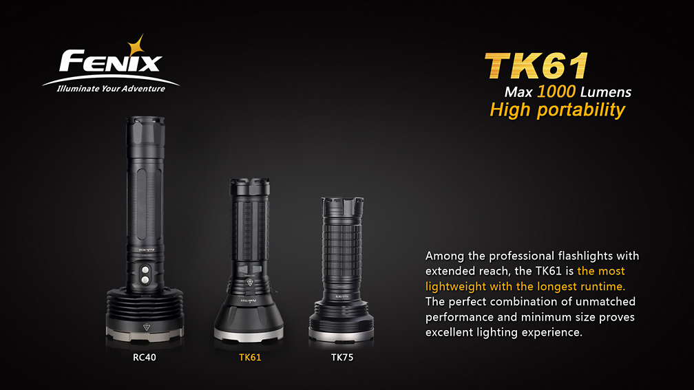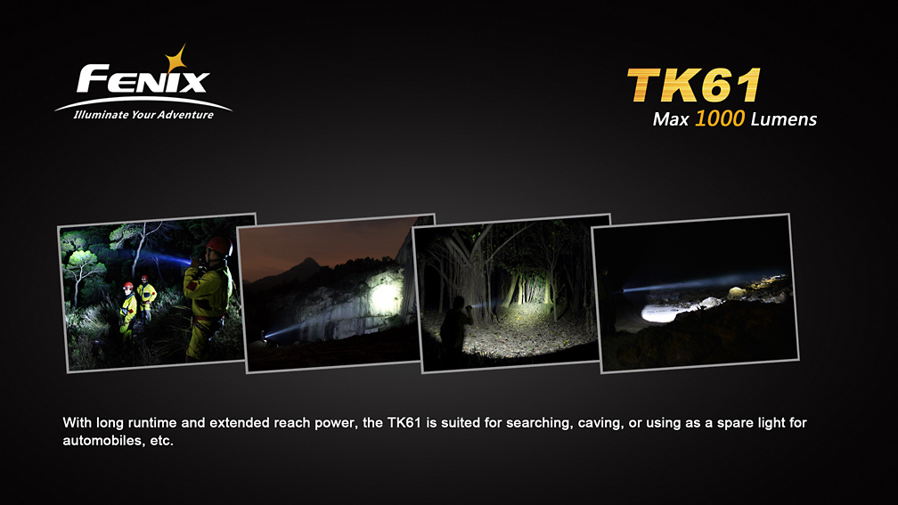 Fenix TK61 dosahuje vysokého svetelného toku 1000 lúmenov a mimoriadneho dosvitu do vzdialenosti až 824 metrov. Tieto extrémne parametre boli dosiahnuté vďaka modernej LED Cree XM-L2 U2. Svietidlo ponúka celkovo šesť digitálne regulovaných režimov výkonu pre možnosť voľby medzi maximálnym výkonom a výdržou (až 300 hodín). Svietidlo je vhodné napríklad pre záchranné a prieskumné operácie, pre pohyb v ťažkom a nepriehľadnom teréne a pre všetkých, ktorí požadujú nekompromisný výkon a kvalitu.