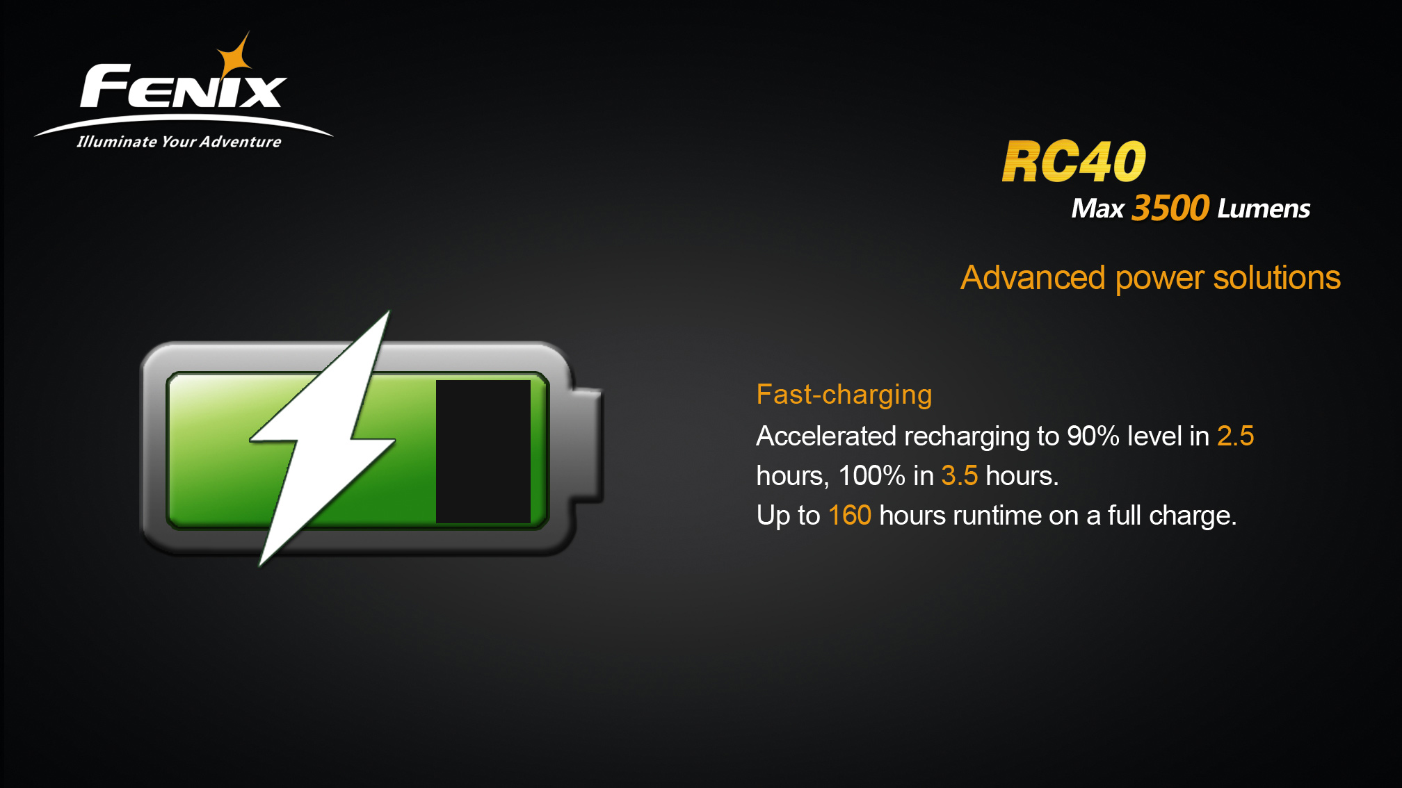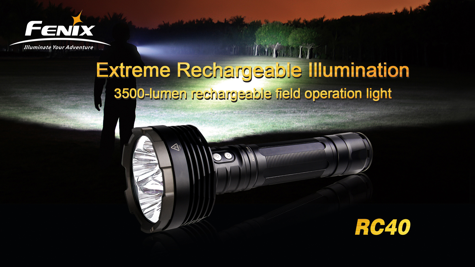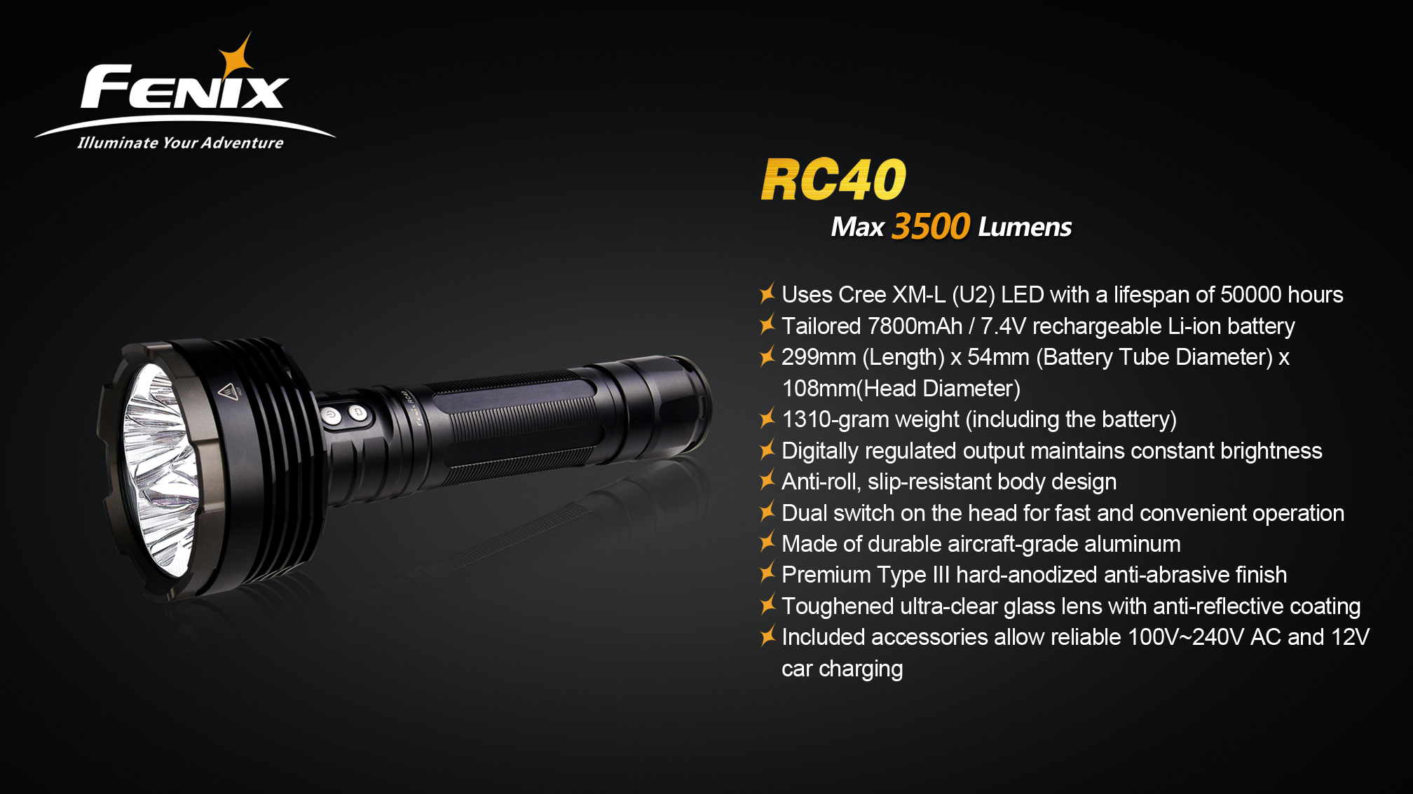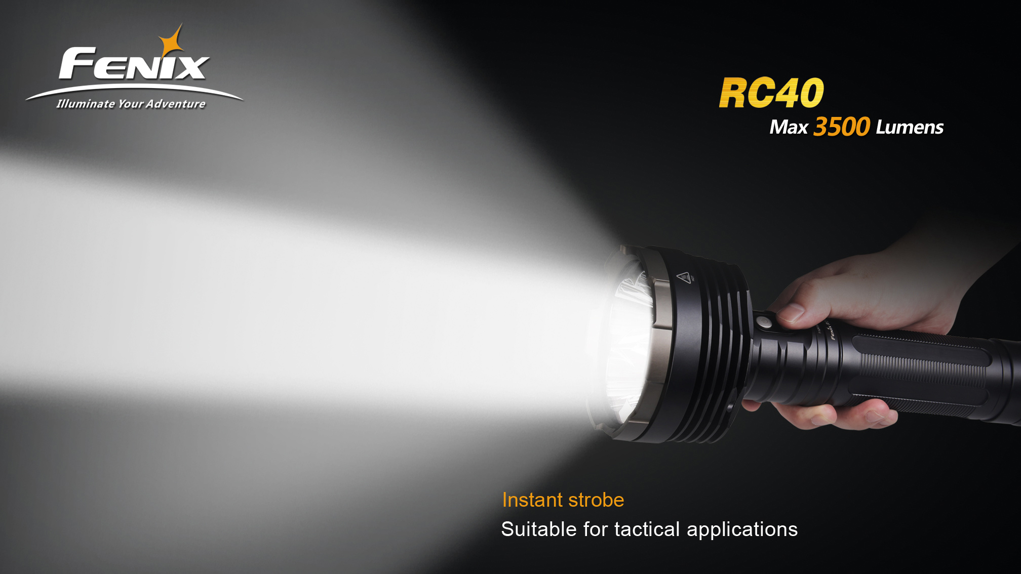 Fenix RC40 je ultra výkonne akumulátorové svietidlo, ktoré ponúka svetelný tok až 3500 ANSI lúmenov a špičkový dosvit cez 710 metrov. Celkom šesť digitálne regulovaných režimov svietenia pre možnosť voľby medzi maximálnym výkonom a výdržou (až 160 hodín). Ergonomické ovládanie pomocou dvoch tlačidiel na boku svietidla. Bezkonkurenčného výkonu bolo dosiahnuté použitím štyroch špičkových LED Cree XM-L U2 a napájaním z interného li-ion akumulátoru s kapacitou 57,7 Wh. Toto ručné svietidlo je vhodné napríklad pre záchranárov, prieskumné operácie, dohľadávku, pohyb v ťažkom teréne a pre všetkých, ktorí sa uspokoja len s tým najlepším.