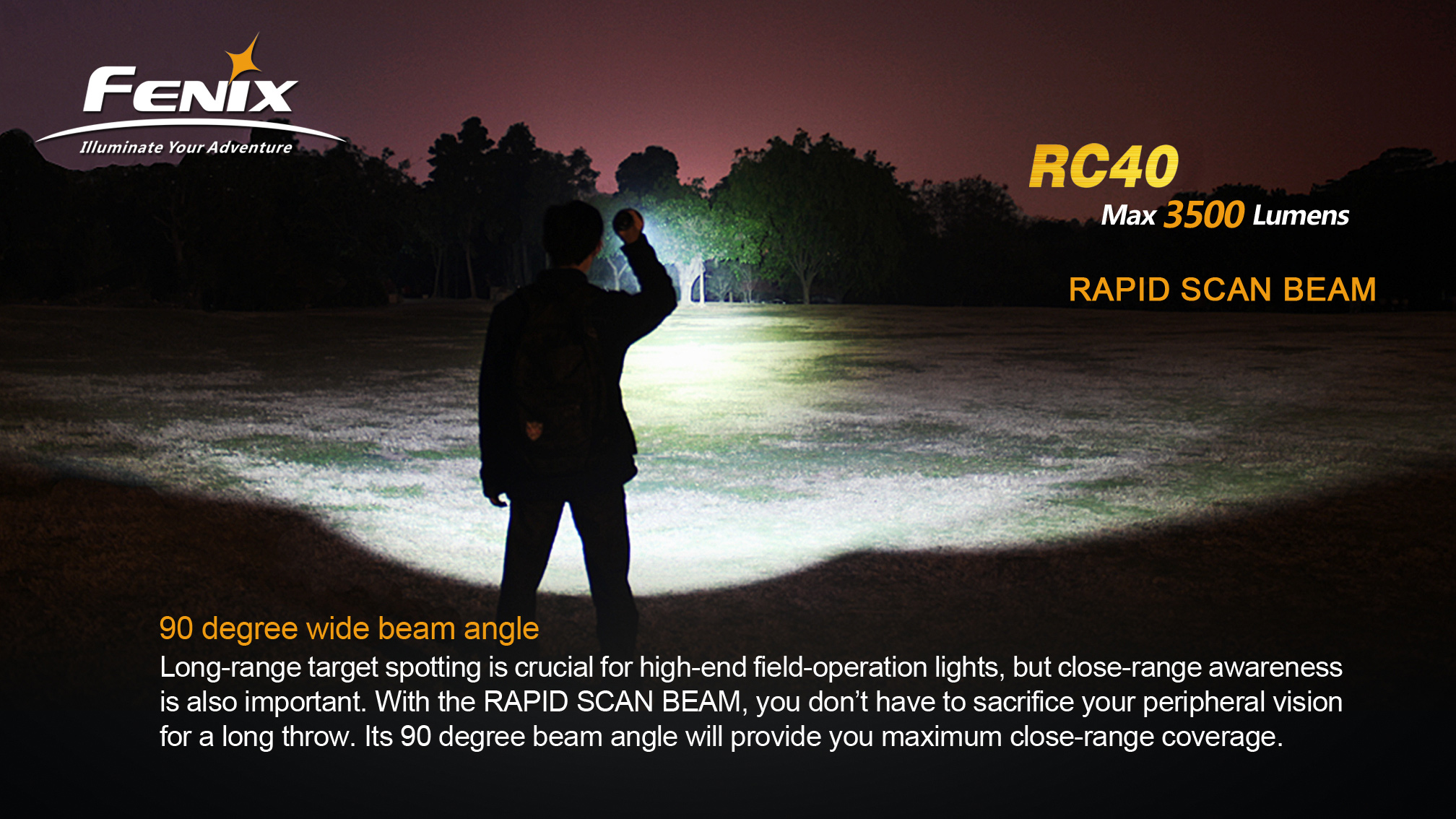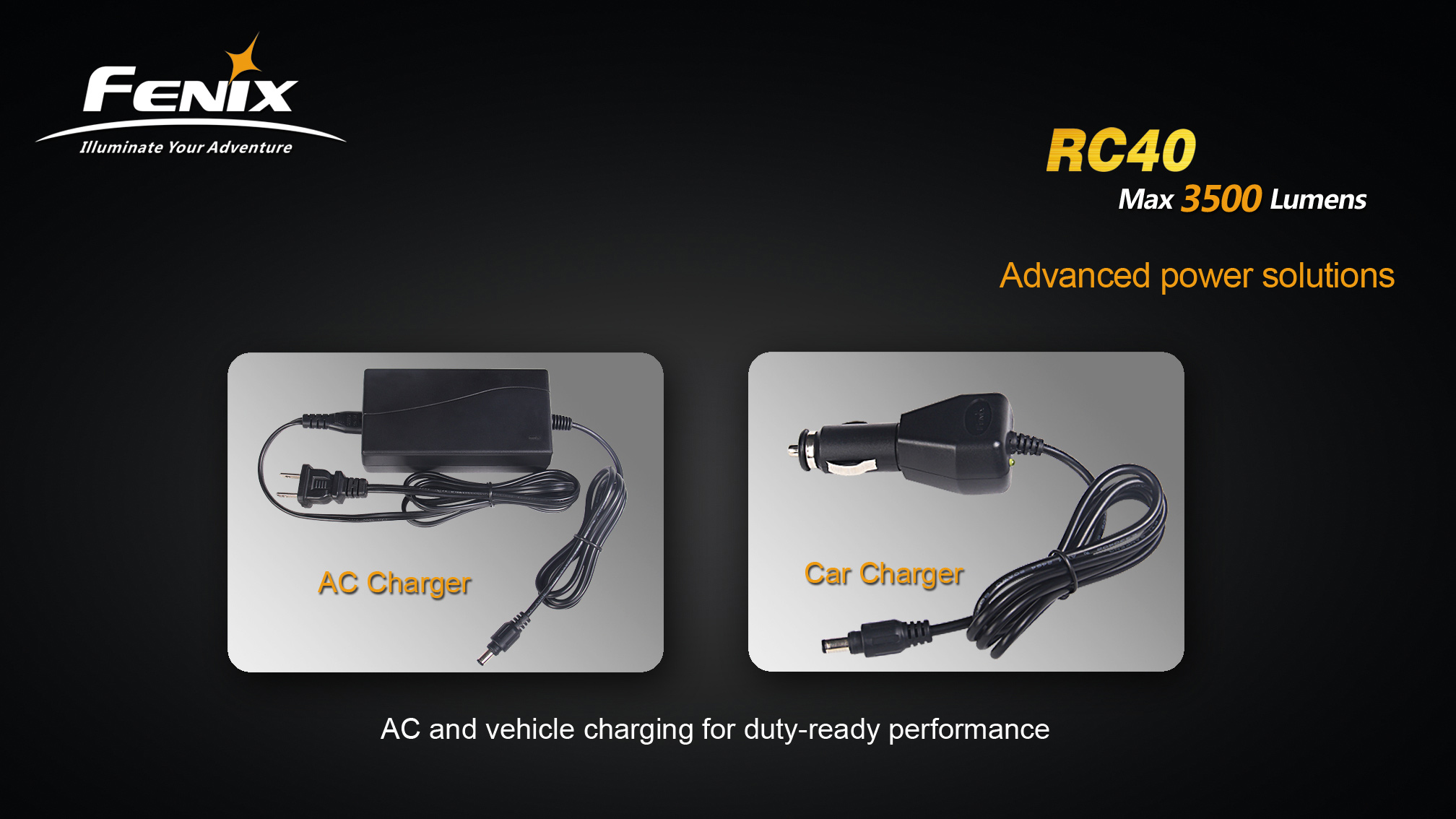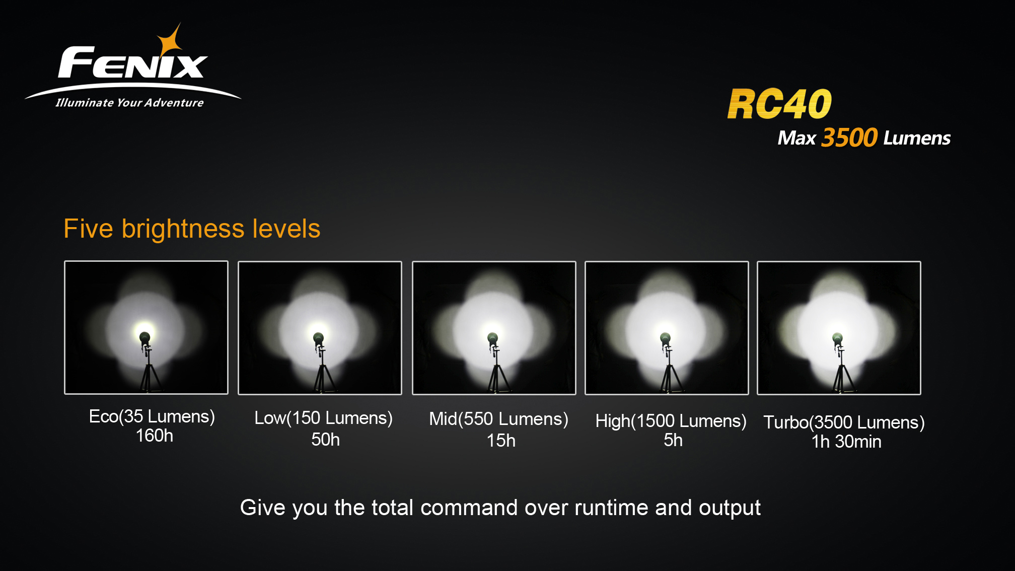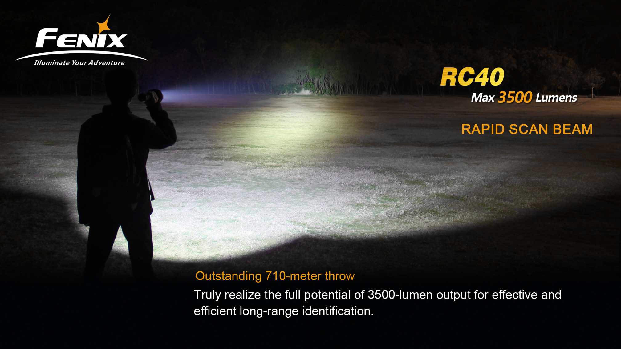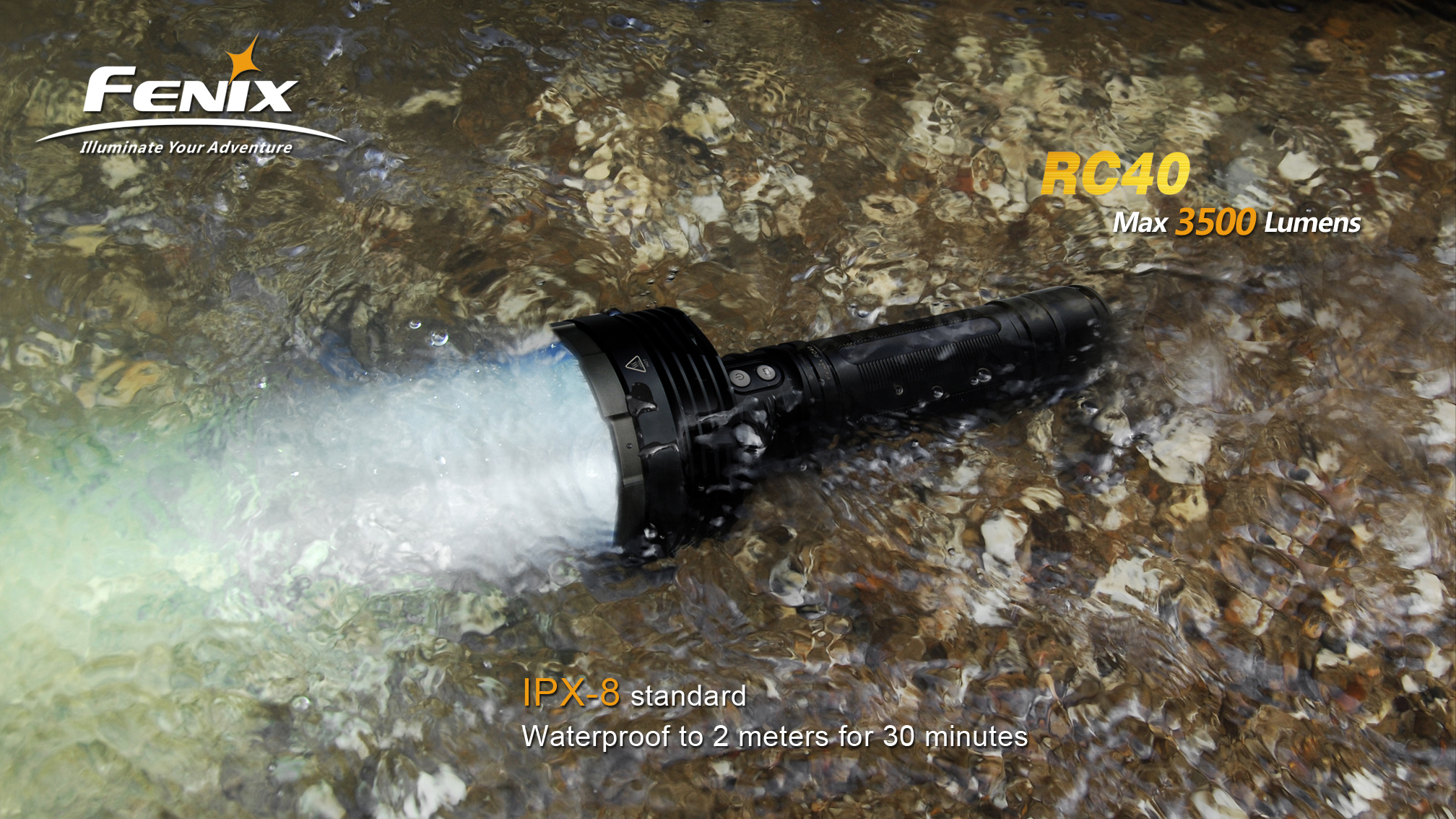 Fenix RC40 je ultra výkonne akumulátorové svietidlo, ktoré ponúka svetelný tok až 3500 ANSI lúmenov a špičkový dosvit cez 710 metrov. Celkom šesť digitálne regulovaných režimov svietenia pre možnosť voľby medzi maximálnym výkonom a výdržou (až 160 hodín). Ergonomické ovládanie pomocou dvoch tlačidiel na boku svietidla. Bezkonkurenčného výkonu bolo dosiahnuté použitím štyroch špičkových LED Cree XM-L U2 a napájaním z interného li-ion akumulátoru s kapacitou 57,7 Wh. Toto ručné svietidlo je vhodné napríklad pre záchranárov, prieskumné operácie, dohľadávku, pohyb v ťažkom teréne a pre všetkých, ktorí sa uspokoja len s tým najlepším.