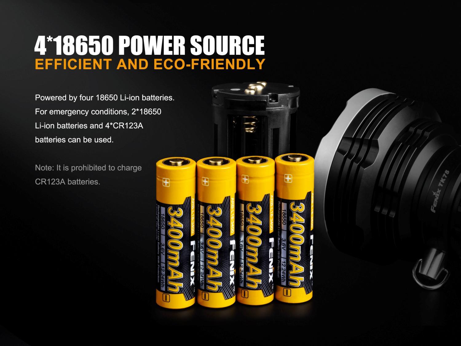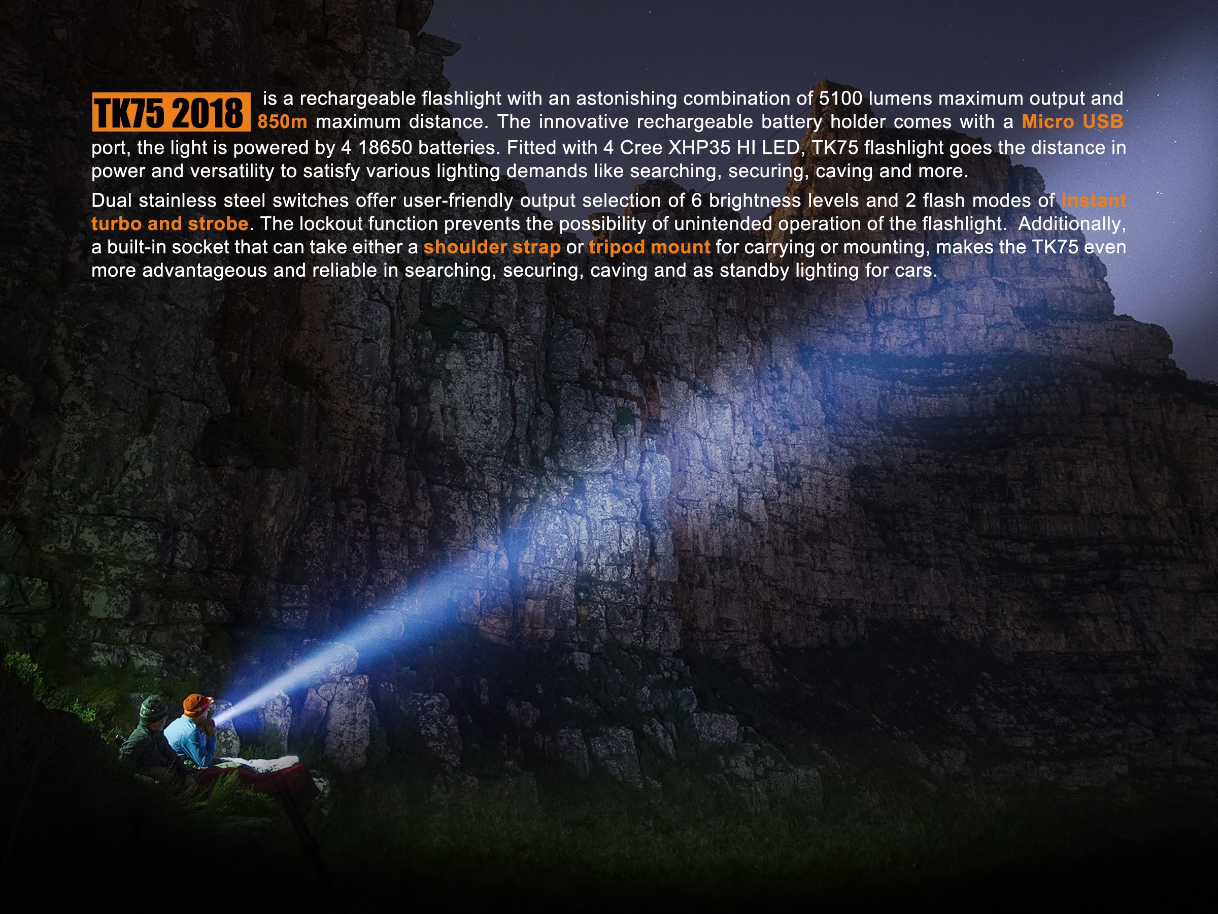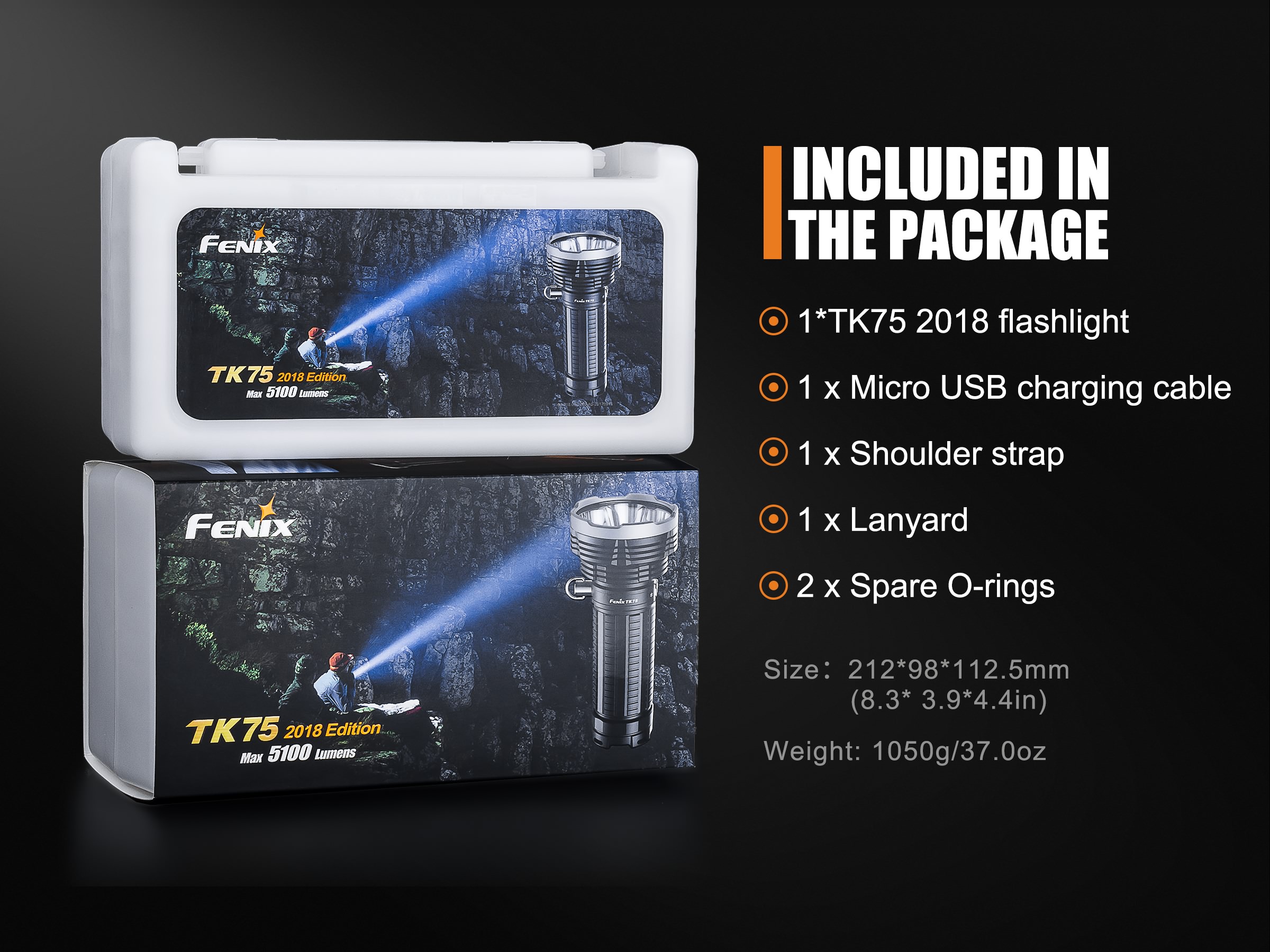 Už štvrtá generácia extrémne výkonného svietidla Fenix TK75 prináša zvýšený svetelný tok až 5100 lúmenov (ANSI) a dosvit až 850 metrov. Ako svetelný zdroj sú použité 4 najmodernejšie LED Cree XHP35 HI. Vďaka použitiu moderných 18650 li-ion akumulátorov má svietidlo až prekvapivo kompaktné rozmery – iba 18,8 centimetra na dĺžku. Svietidlo ponúka celkom osem konštantne regulovaných úrovní výkonu vrátane dvoch zábleskových režimov – strobe a SOS. Pre pohodlné ovládanie je svietidlo vybavené dvoma tlačidlami na boku.