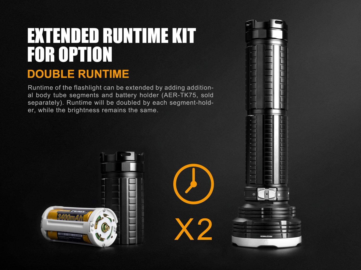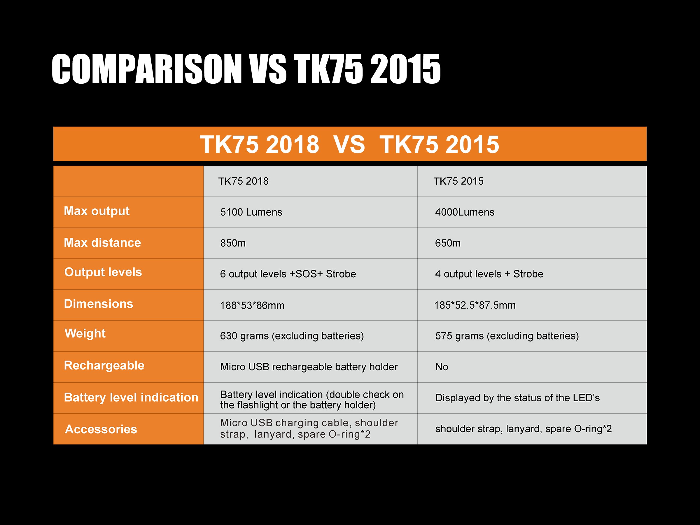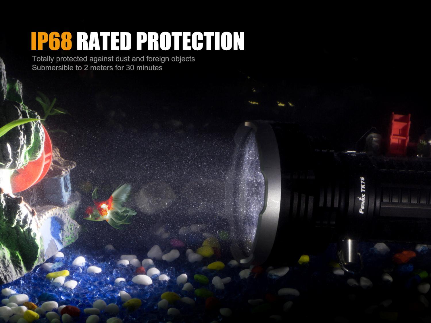 Už štvrtá generácia extrémne výkonného svietidla Fenix TK75 prináša zvýšený svetelný tok až 5100 lúmenov (ANSI) a dosvit až 850 metrov. Ako svetelný zdroj sú použité 4 najmodernejšie LED Cree XHP35 HI. Vďaka použitiu moderných 18650 li-ion akumulátorov má svietidlo až prekvapivo kompaktné rozmery – iba 18,8 centimetra na dĺžku. Svietidlo ponúka celkom osem konštantne regulovaných úrovní výkonu vrátane dvoch zábleskových režimov – strobe a SOS. Pre pohodlné ovládanie je svietidlo vybavené dvoma tlačidlami na boku.