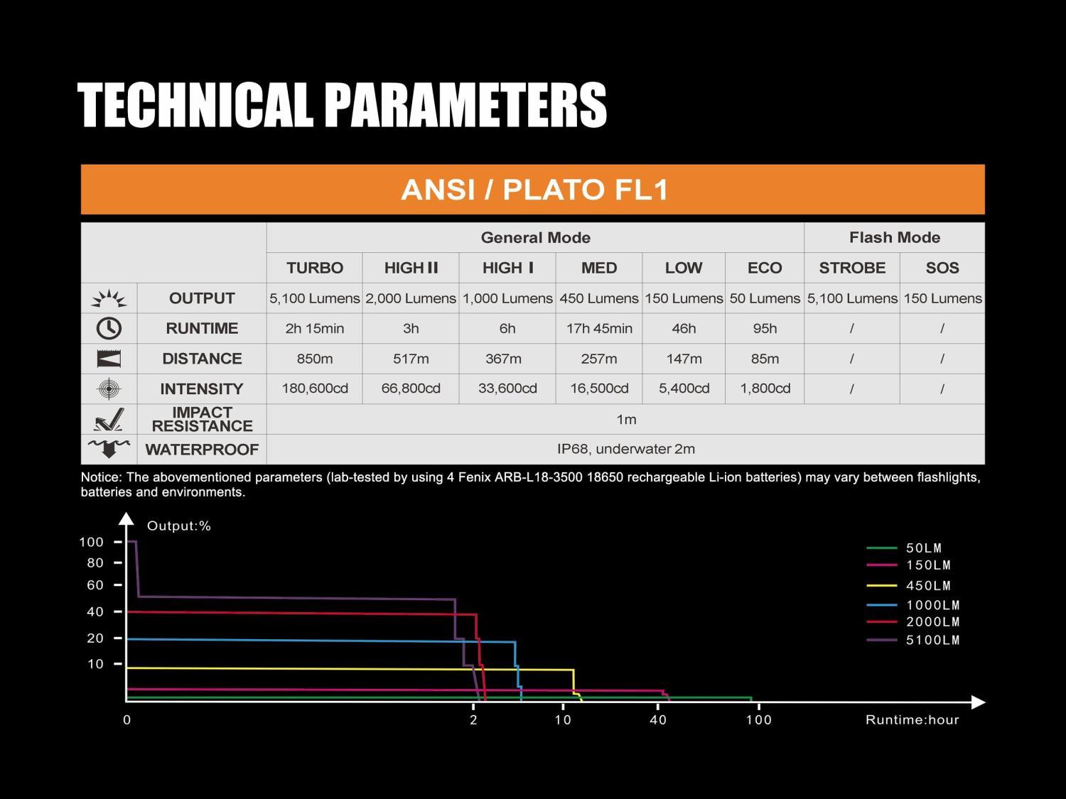 Všetky parametre baterky (svetelný tok, doba svietenia na batérie, vodotesnosť, dosvit a nárazuvzdornosť) sú merané v súlade s normou ANSI/NEMA FL 1-2009 Flashlight Basic Performance Standard.