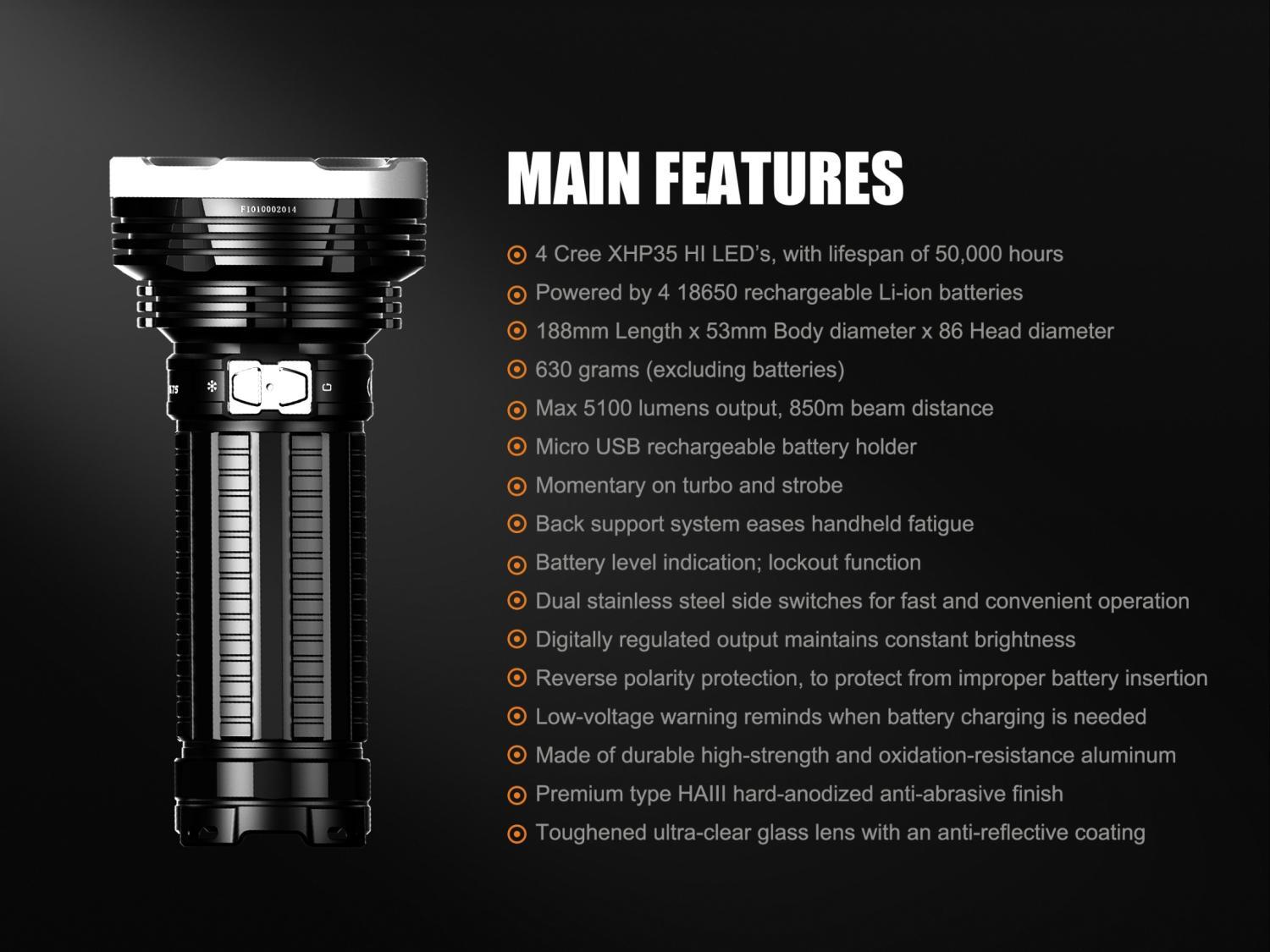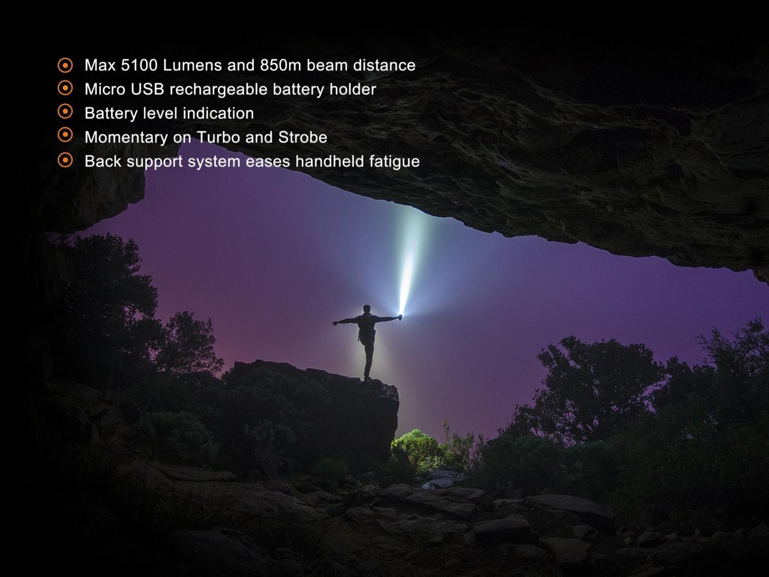 Oproti predchádzajúcej verzii navyše pribudla možnosť nabíjania akumulátorov cez micro USB priamo v držiaku batérií. Toto vyhľadávacie svietidlo je vhodná napríklad pre prieskumné a záchranné operácie, pre pohyb v ťažkom a neprehľadnom teréne a pre všetkých, ktorí požadujú ten najvyšší výkon.