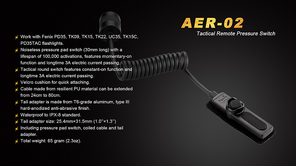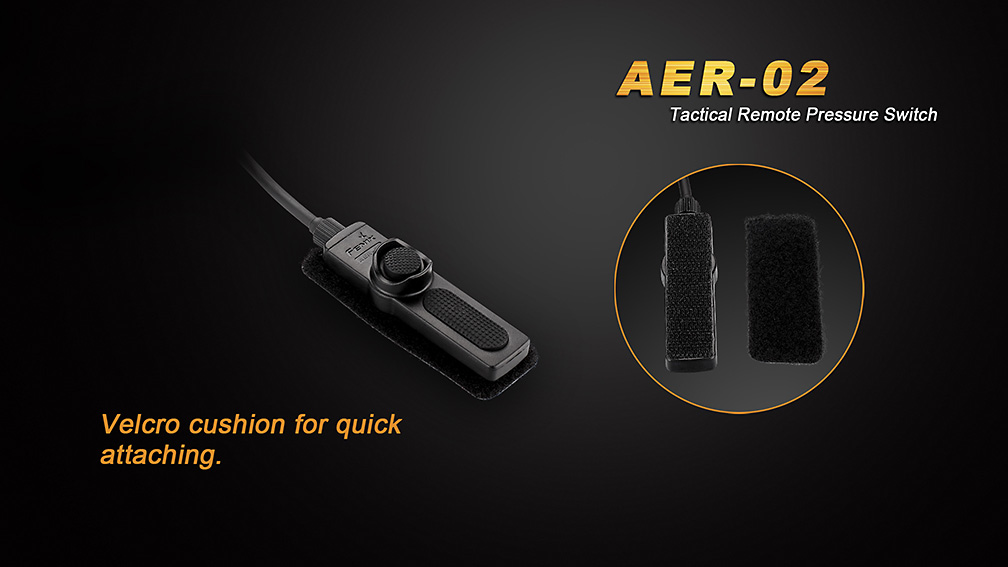 Taktický káblový spínač AR-02 pre taktické svietidlá Fenix s lichobežníkovým závitom. Vďaka dĺžke rozvinutého kábla až 80 cm je vhodný obzvlášť pre montáž svietidla na dlhej zbrani. Na konci kábla je tlačidlo na trvalé rozsvietenie a plochý tlakový spínač s momentálnou aktiváciou. Spínač je navyše vybavený suchým zipsom, ktorý vám pomôže s jeho umiestnením kamkoľvek na zbraň.