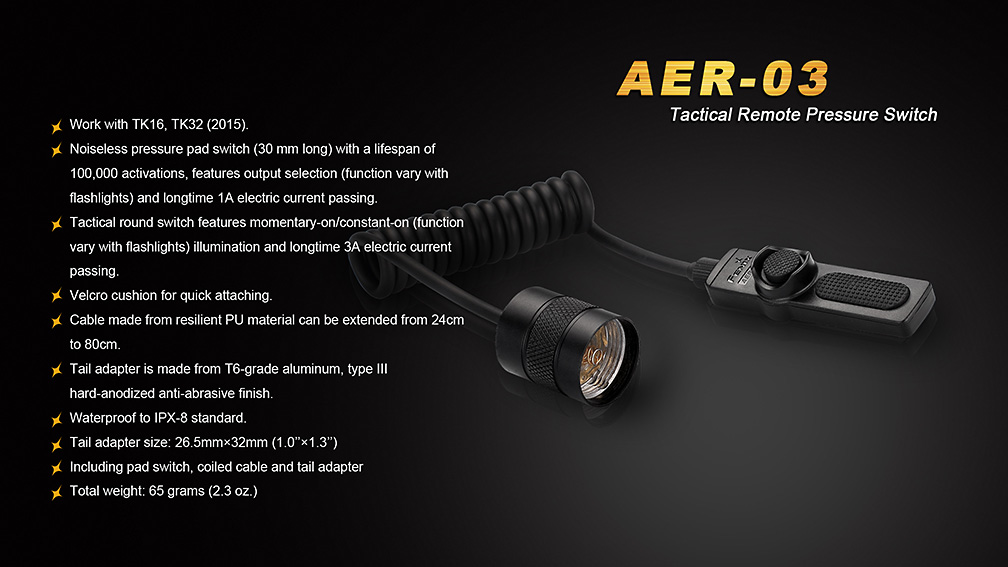 Taktický káblový spínač AER-03 pre svetlá Fenix TK16, Fenix TK20R a Fenix TK32. Vhodné pre použitie so svietidlom montovanú na dlhé zbrani. Na konci kábla sú umiestnené dva bezhlučné spínača. Jeden tlačidlový s funkciou momentálnej aktivácie namačknutím a taktiež možnosťou trvalého rozsvietenie svetla a druhý plochý tlakový spínač. Spínač je navyše vybavený suchým zipsom, čo vám pomôže s jeho umiestnením kamkoľvek na zbraň.