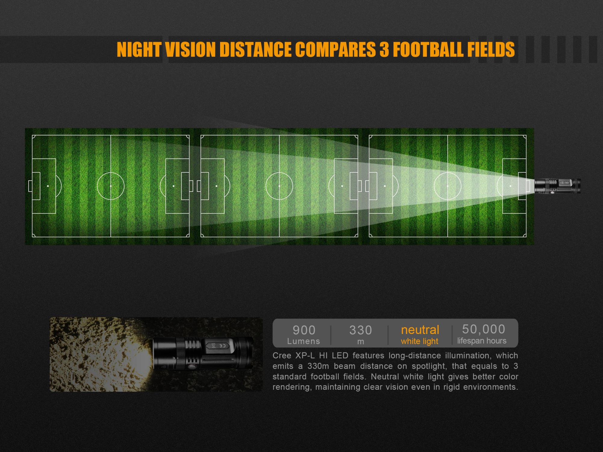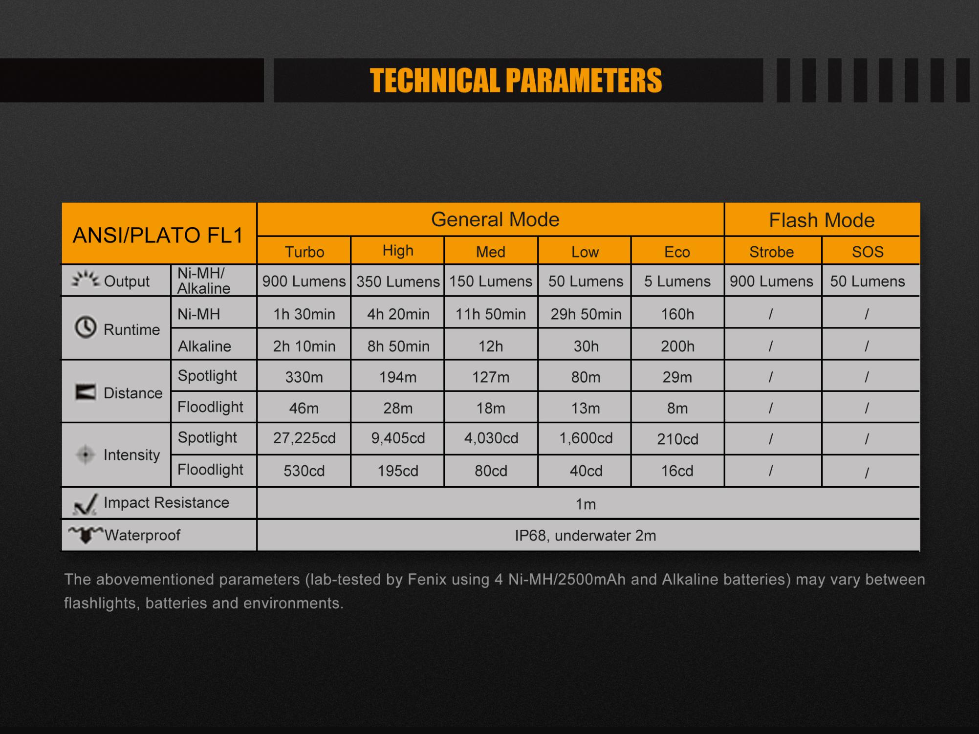 Všetky parametre baterky (svetelný tok, doba svietenia na batérie, vodotesnosť, dosvit a nárazuvzdornosť) sú merané v súlade s normou ANSI/NEMA FL 1-2009 Flashlight Basic Performance Standard.