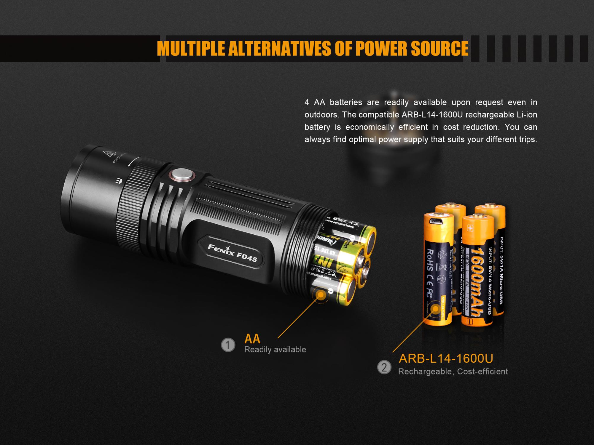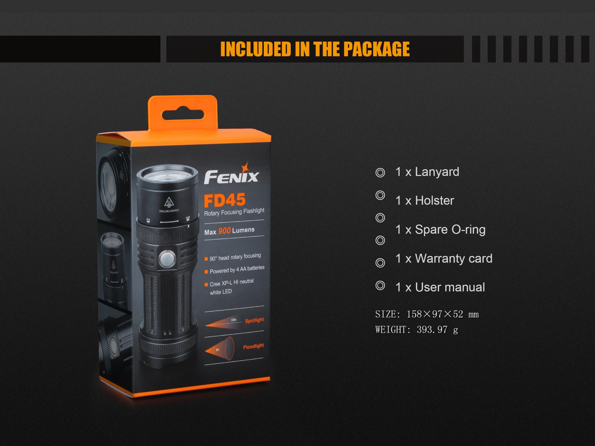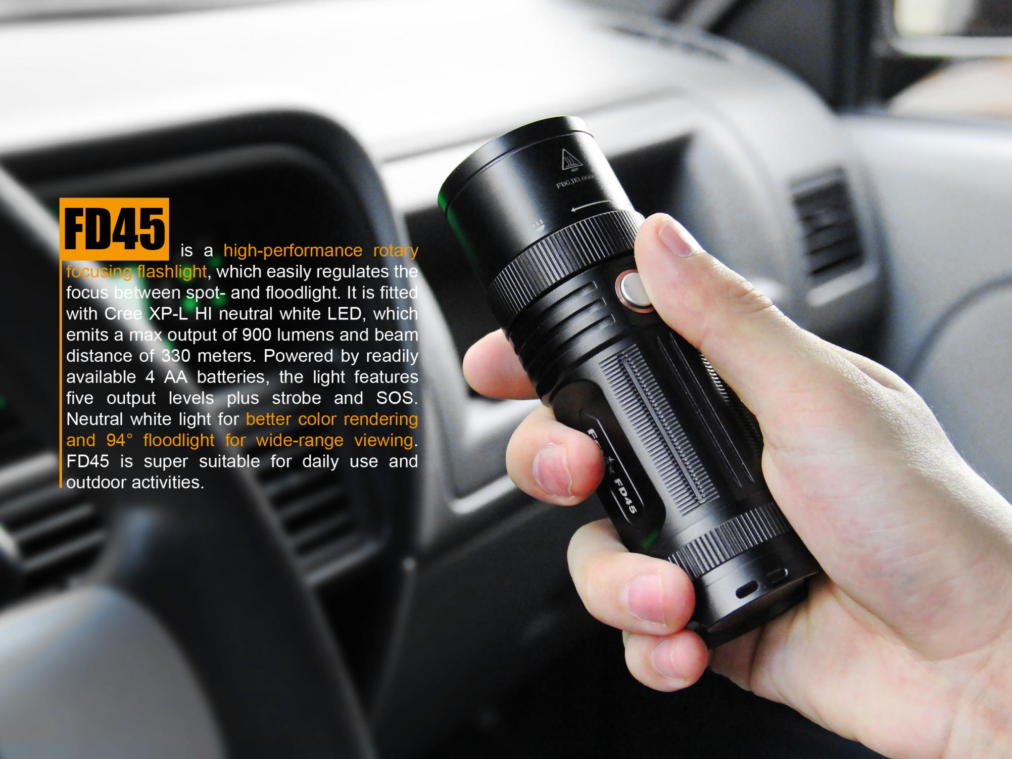 Vysoko výkonné zaostrovacie svietidlo Fenix FD45 ponúka svetelný tok až 900 lúmenov (ANSI) a dosvit až 330 metrov. Na napájanie sa používajú štyri tužkové AA batérie, ktoré sú umiestnené vedľa seba, vďaka tomu je dĺžka svietidla len málo cez 12 centimetrov. Svetelným zdrojom je najmodernejšia dióda Cree XP-L HI s teplejším odtieňom svetla pre kontrastnejšie podanie farieb v prírode.